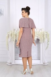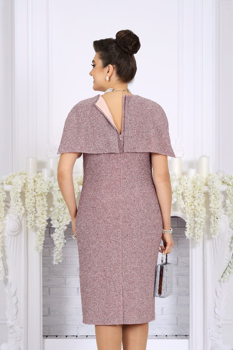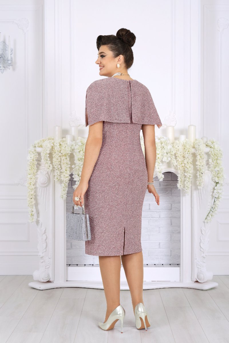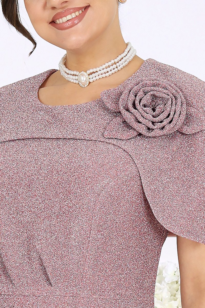 Платье женское полуприлегающего силуэта, выполнено из трикотажного полотна с фактурной лицевой стороной «люрекс». Модель на трикотажной подкладке, без воротника и рукавов, без плечевых накладок. Перед отрезной по линии талии; на верхней части обработан рельеф, направленный от левой проймы, на нижней части, на продолжении линии рельефного шва, обработана талиевая вытачка. По обе стороны от подреза талии переда застрочены косые односторонние складки. Спинка с талиевыми вытачками и средним швом, в верхней части которого обработана застежка на потайную тесьму-«молнию» (50см), в нижней – разрез. Горловина круглой формы, спереди углубленная. В шов обтачивания горловины входит пелерина с фигурным низом и разрезами от плечевых швов; пелерина разъемная по середине спинки. Платье дополнено съемным «цветком» из основного полотна. Длина платья - 106 см.