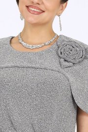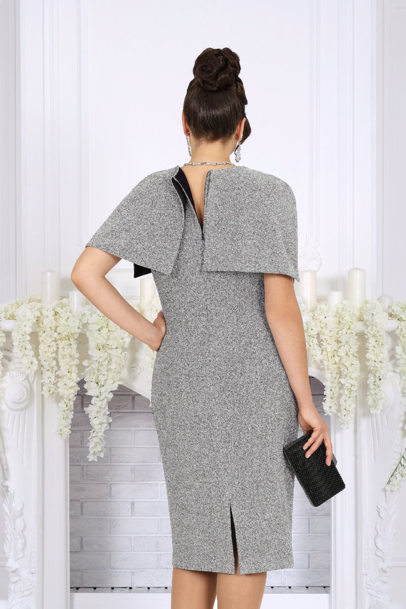 Платье женское полуприлегающего силуэта, выполнено из трикотажного полотна с фактурной лицевой стороной «люрекс». Модель на трикотажной подкладке, без воротника и рукавов, без плечевых накладок. Перед отрезной по линии талии; на верхней части обработан рельеф, направленный от левой проймы, на нижней части, на продолжении линии рельефного шва, обработана талиевая вытачка. По обе стороны от подреза талии переда застрочены косые односторонние складки. Спинка с талиевыми вытачками и средним швом, в верхней части которого обработана застежка на потайную тесьму-«молнию» (50см), в нижней – разрез. Горловина круглой формы, спереди углубленная. В шов обтачивания горловины входит пелерина с фигурным низом и разрезами от плечевых швов; пелерина разъемная по середине спинки. Платье дополнено съемным «цветком» из основного полотна. Длина платья - 106 см.