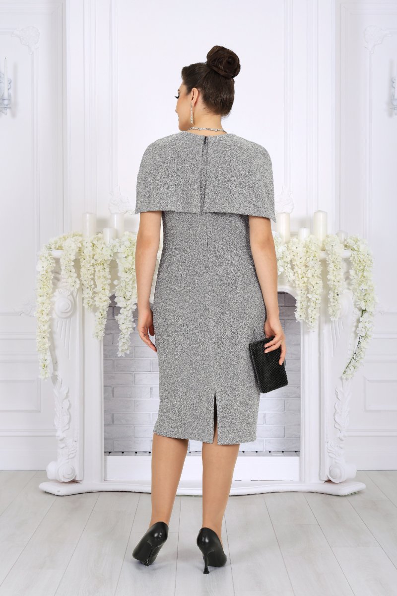 Особый акцент модели — эффектная пелерина с фигурным низом и разрезами от плечевых швов. Она создаёт ощущение многослойности, скрывает зону плеч и рук и добавляет образу торжественности. Съёмный декоративный цветок позволяет менять настроение платья — от сдержанной классики до выразительного праздничного образа.