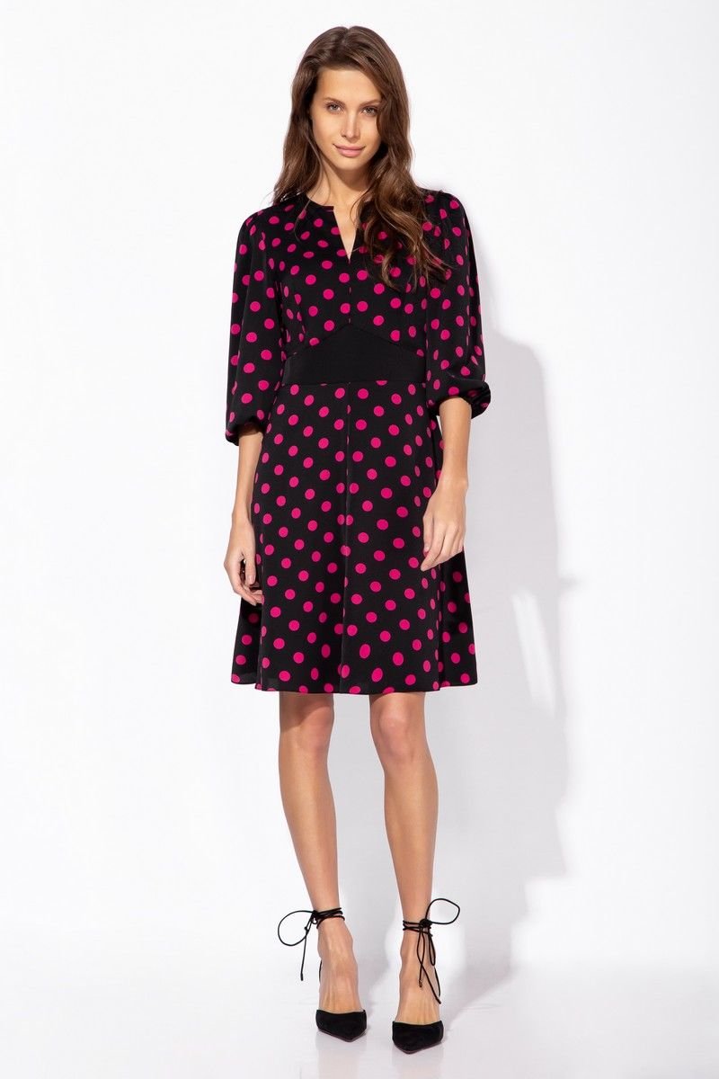 Платье полуприлегающего силуэта, с застежкой на потайную тесьму-молнию в левом боковом шве. Лиф детали переда платья с втачным поясом фигурной формы; верхняя часть с талиевыми вытачками, со средним швом, вверху которого обработан разрез «V-образной» формы. Юбка платья расширенного силуэта, на подкладке, переднее полотнище со средним швом. Рукава втачные одношовные, длиной ¾, с притачными узкими манжетами, в которые вставлена эластичная тесьма. По окатам рукавов обработана сборка. Вырез горловины округлой формы.