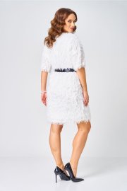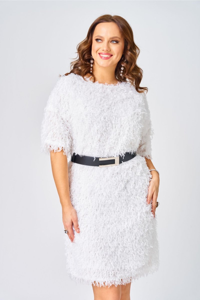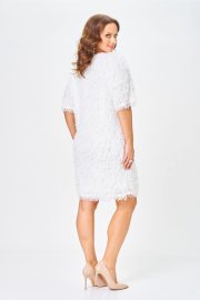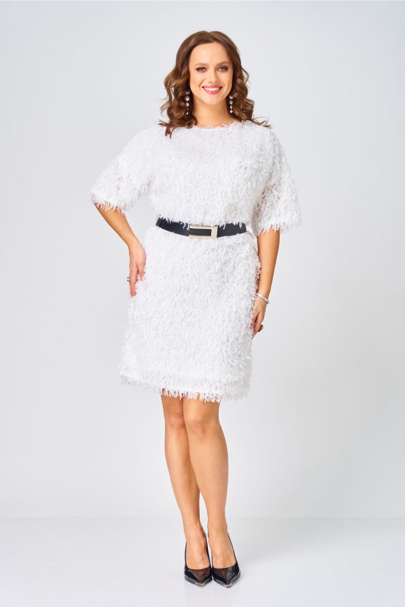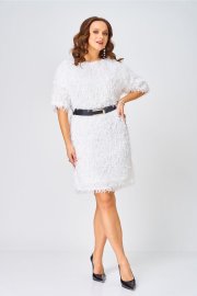 Платье нарядное прямого силуэта, из интересной ткани с бахромой, с округлым вырезом горловины и спущенной линией плеча. Рукав длиной до локтя.
