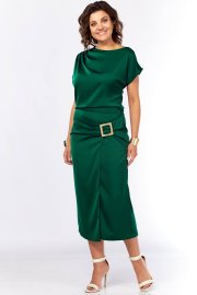 Шикарное нарядное платье, полуприлегающего силуэта из струящейся ткани с цельнокроеным рукавом, коротким, ассиметричного силуэта. Платье отрезное по талии, с молнией потайной в боковом шве. По плечевому шву по переду и спинке заложены складки. Нижняя часть с разрезом, декоративной не сьемной пряжкой. Талия присобна на резинку