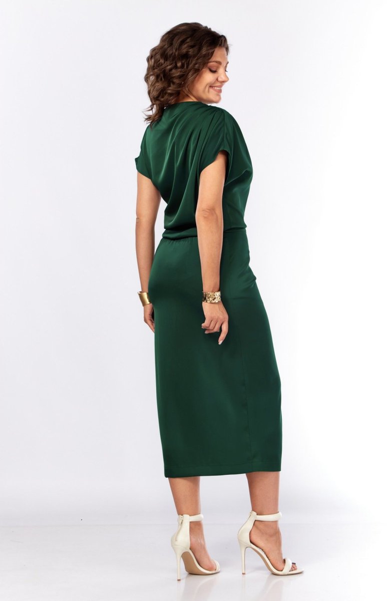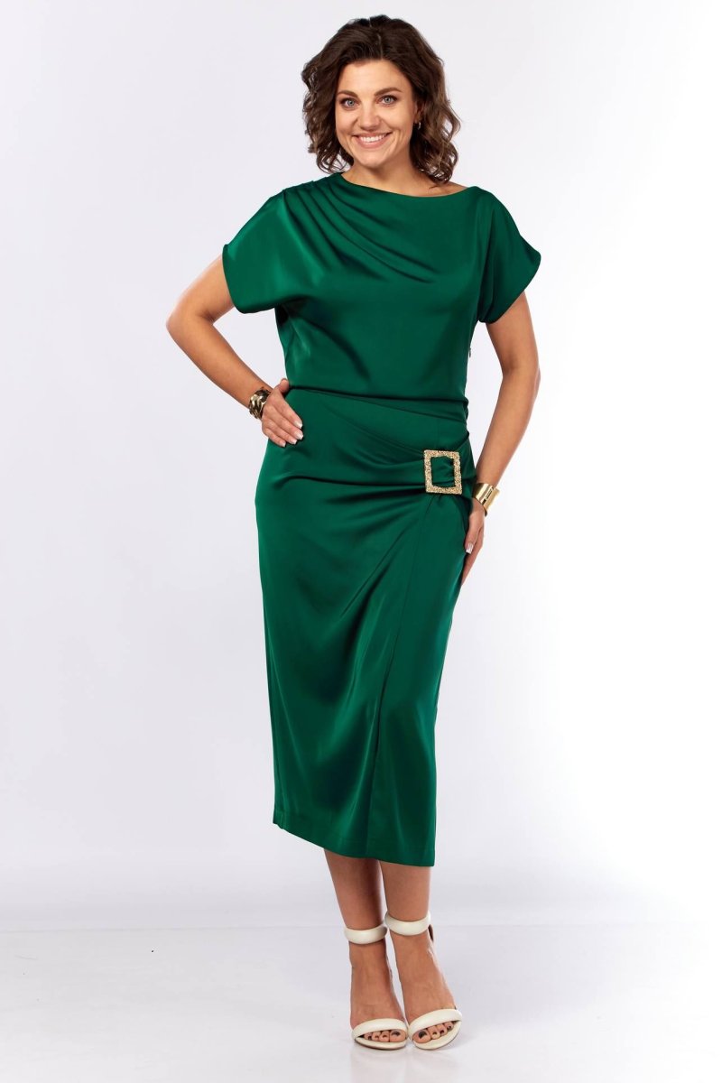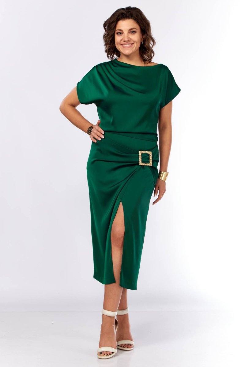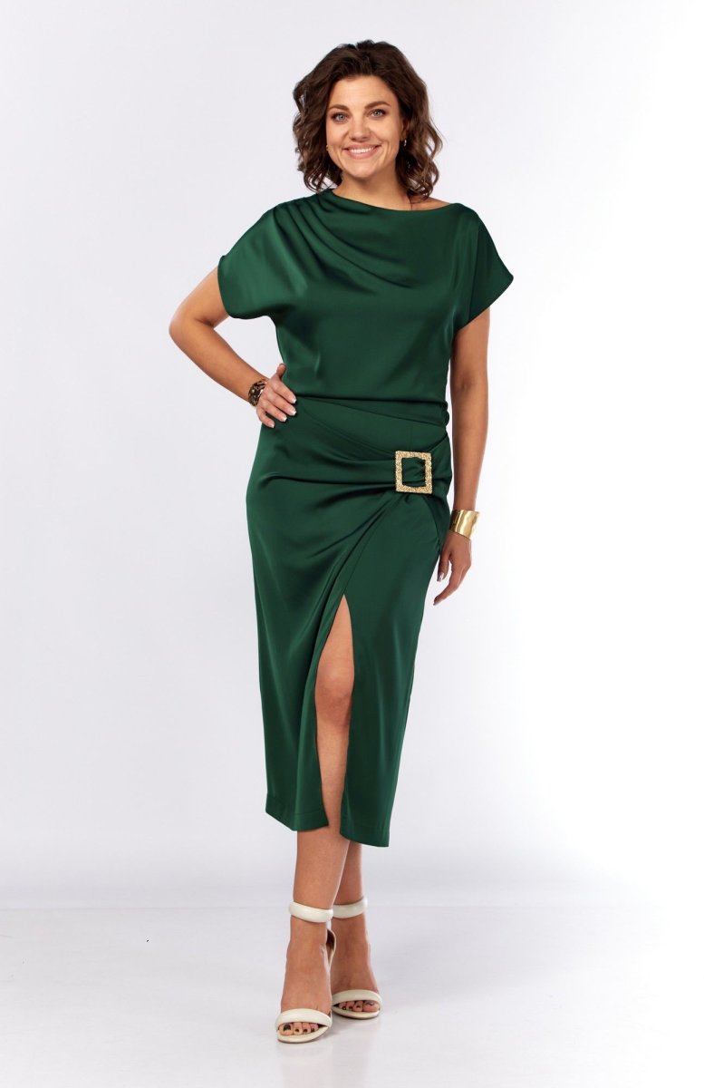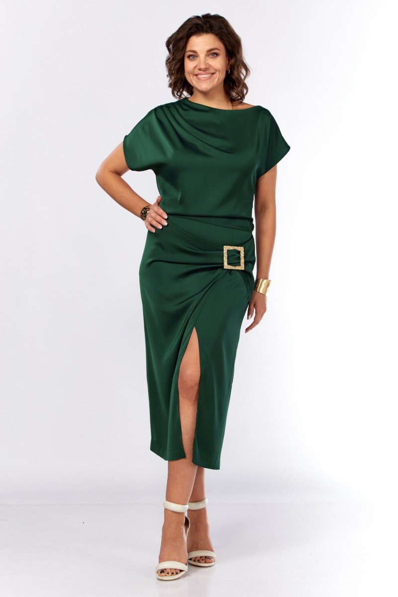 Шикарное нарядное платье, полуприлегающего силуэта из струящейся ткани с цельнокроеным рукавом, коротким, ассиметричного силуэта. Платье отрезное по талии, с молнией потайной в боковом шве. По плечевому шву по переду и спинке заложены складки. Нижняя часть с разрезом, декоративной не сьемной пряжкой. Талия присобна на резинку