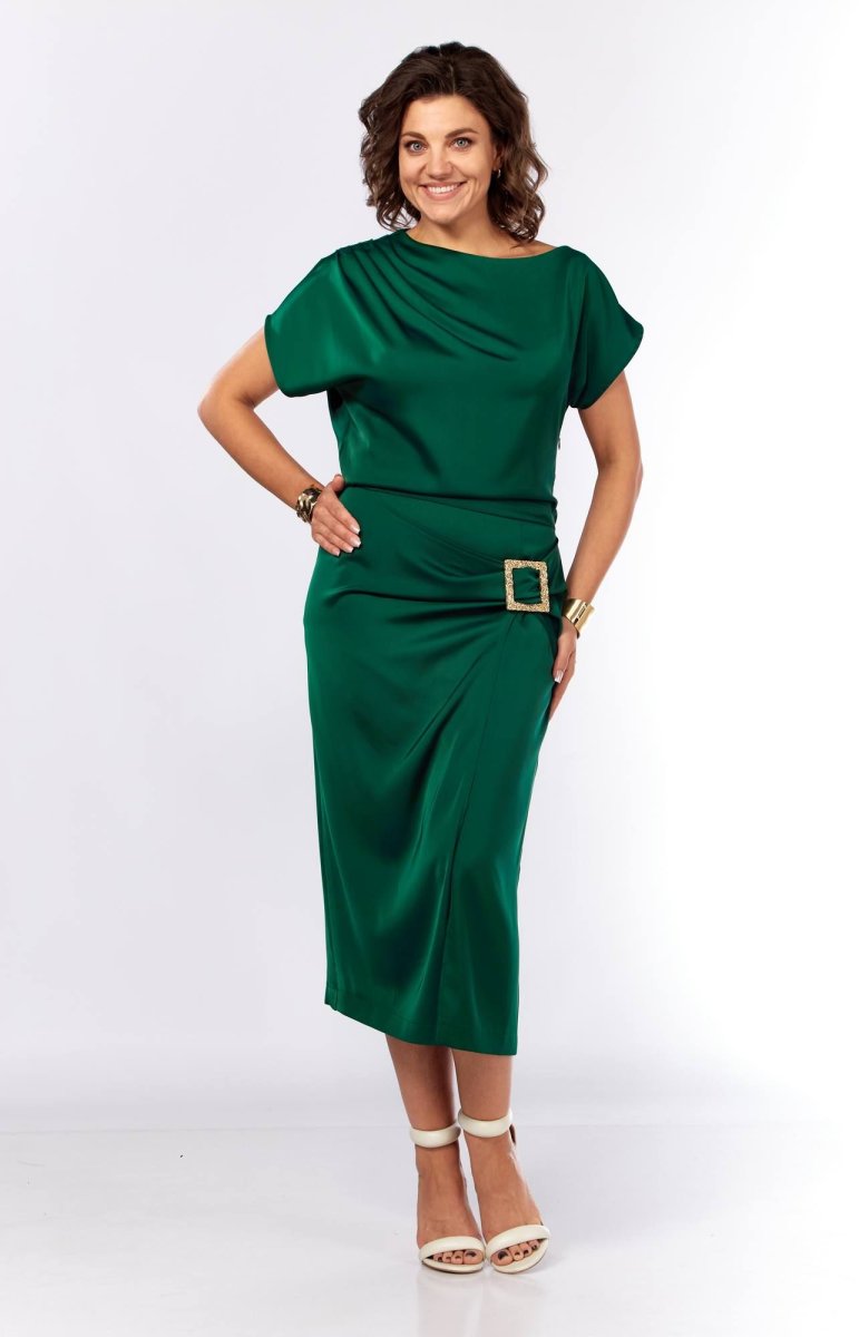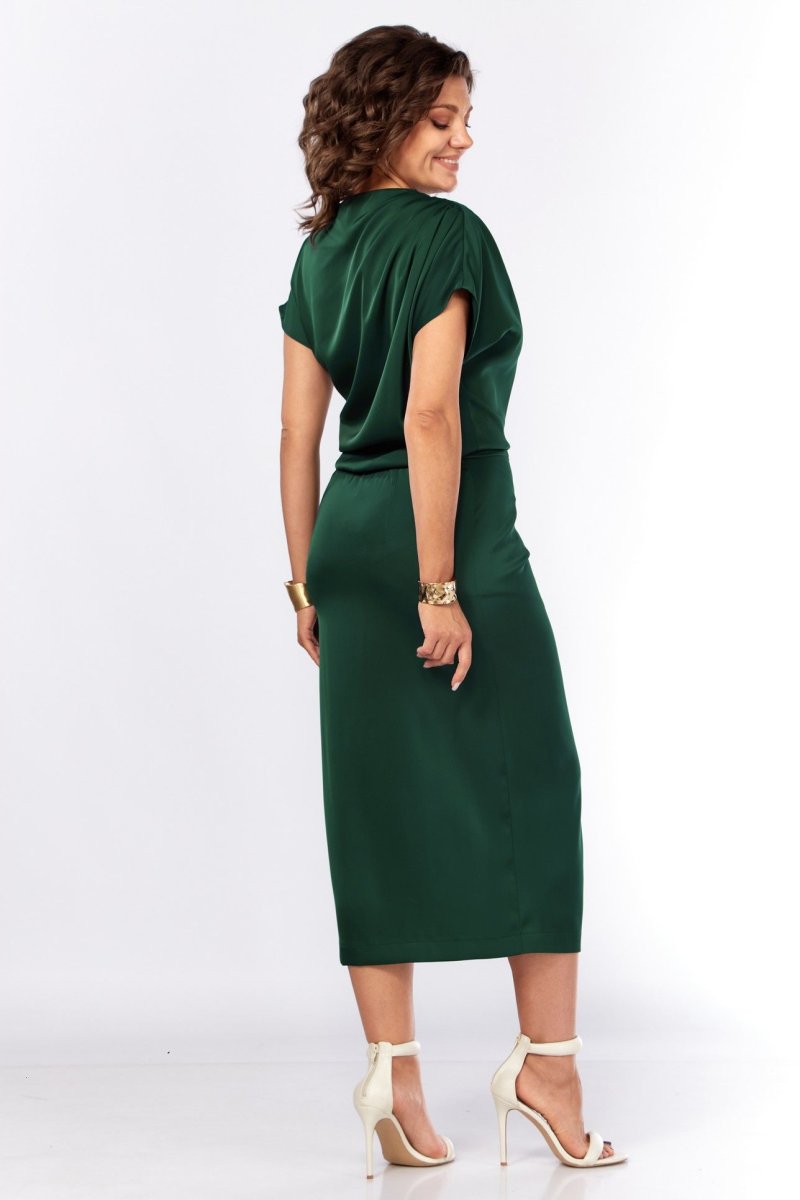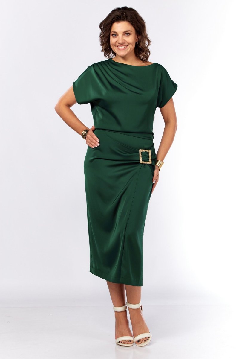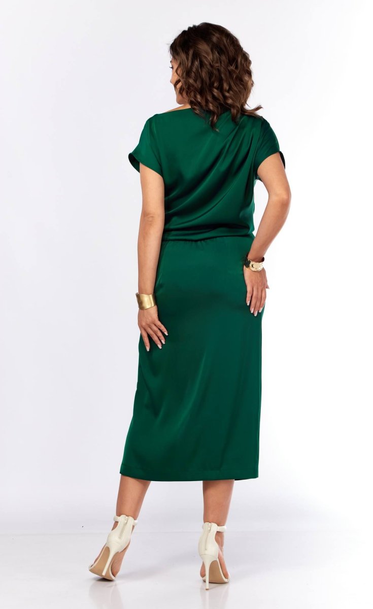 Шикарное нарядное платье, полуприлегающего силуэта из струящейся ткани с цельнокроеным рукавом, коротким, ассиметричного силуэта. Платье отрезное по талии, с молнией потайной в боковом шве. По плечевому шву по переду и спинке заложены складки. Нижняя часть с разрезом, декоративной не сьемной пряжкой. Талия присобна на резинку