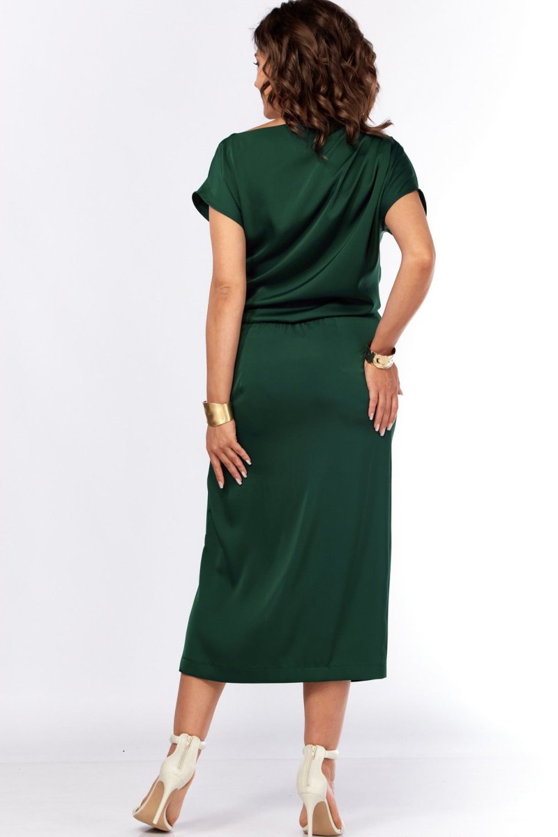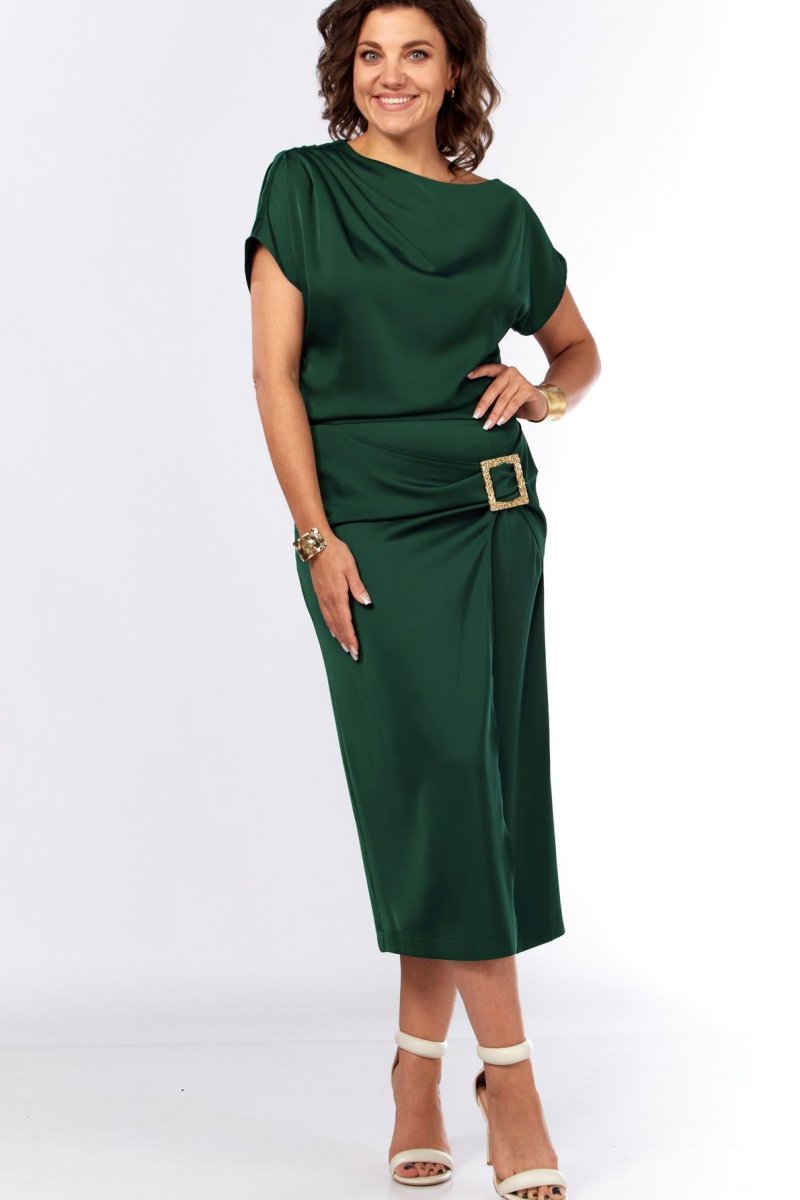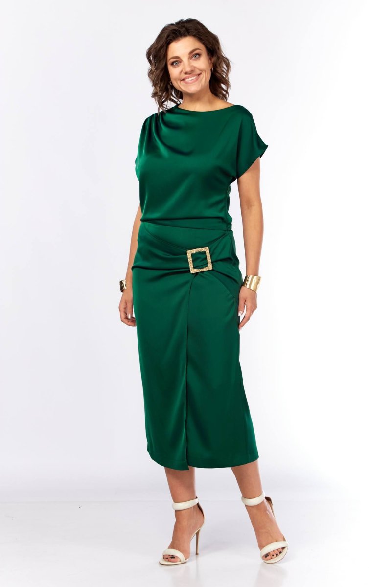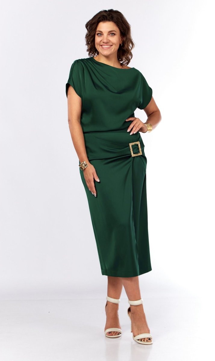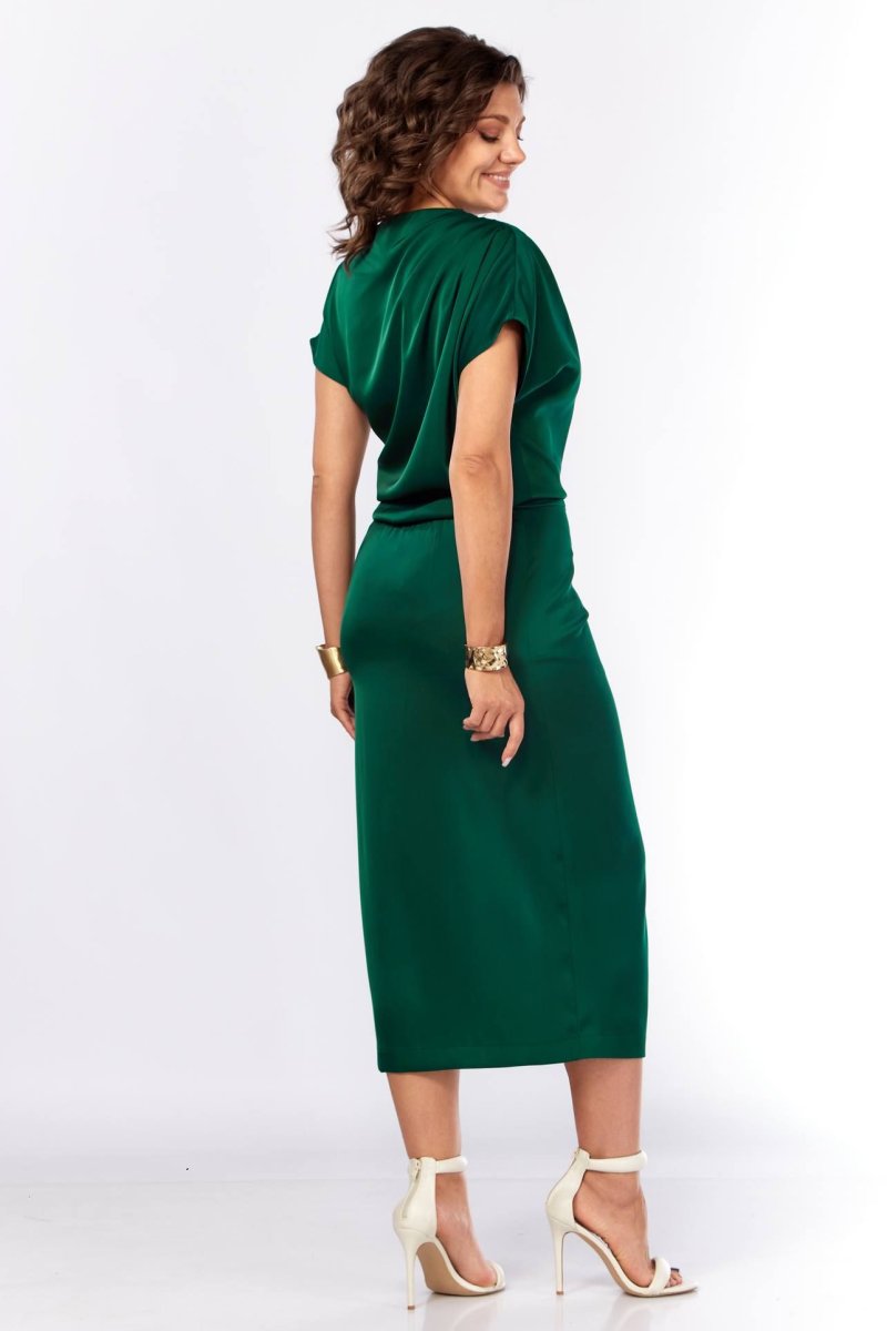 Шикарное нарядное платье, полуприлегающего силуэта из струящейся ткани с цельнокроеным рукавом, коротким, ассиметричного силуэта. Платье отрезное по талии, с молнией потайной в боковом шве. По плечевому шву по переду и спинке заложены складки. Нижняя часть с разрезом, декоративной не сьемной пряжкой. Талия присобна на резинку