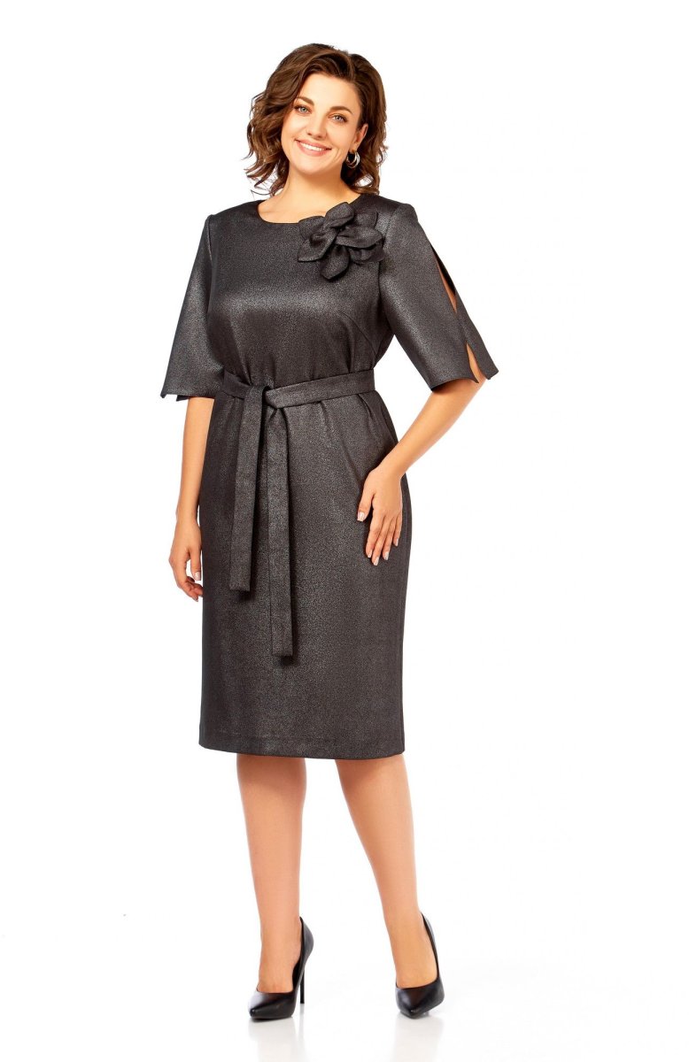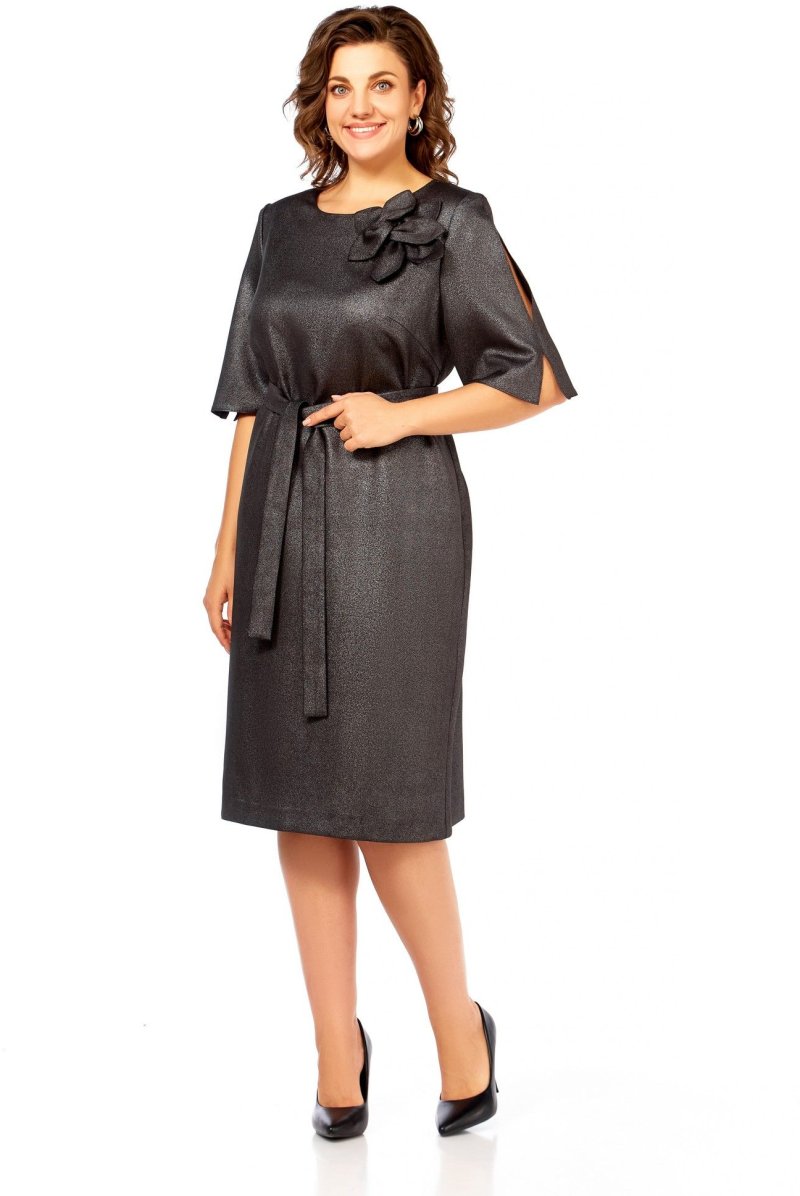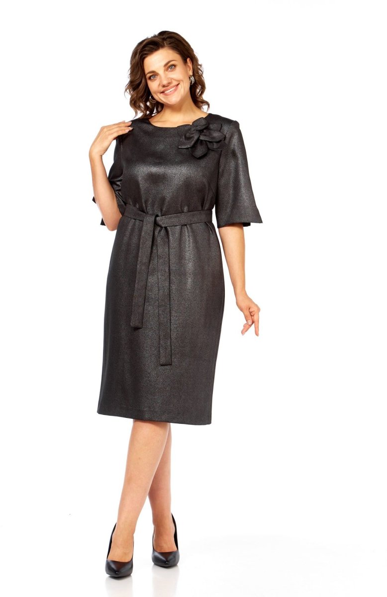 Нарядное платье, полуприлегающего силуэта из ткани с легким блеском. Вырез горловины округлой формы, вытачки, спинка со средним швом, потайная молния по спинке в среднем шве, разрез. Рукав ниже линии локтя с декаративными разрезами. Сьемное украшение- цветок ручной работы и пояс из основной ткани.