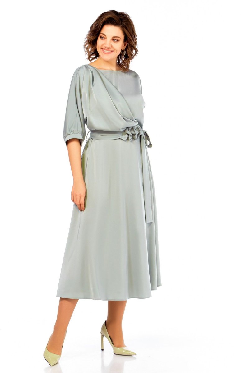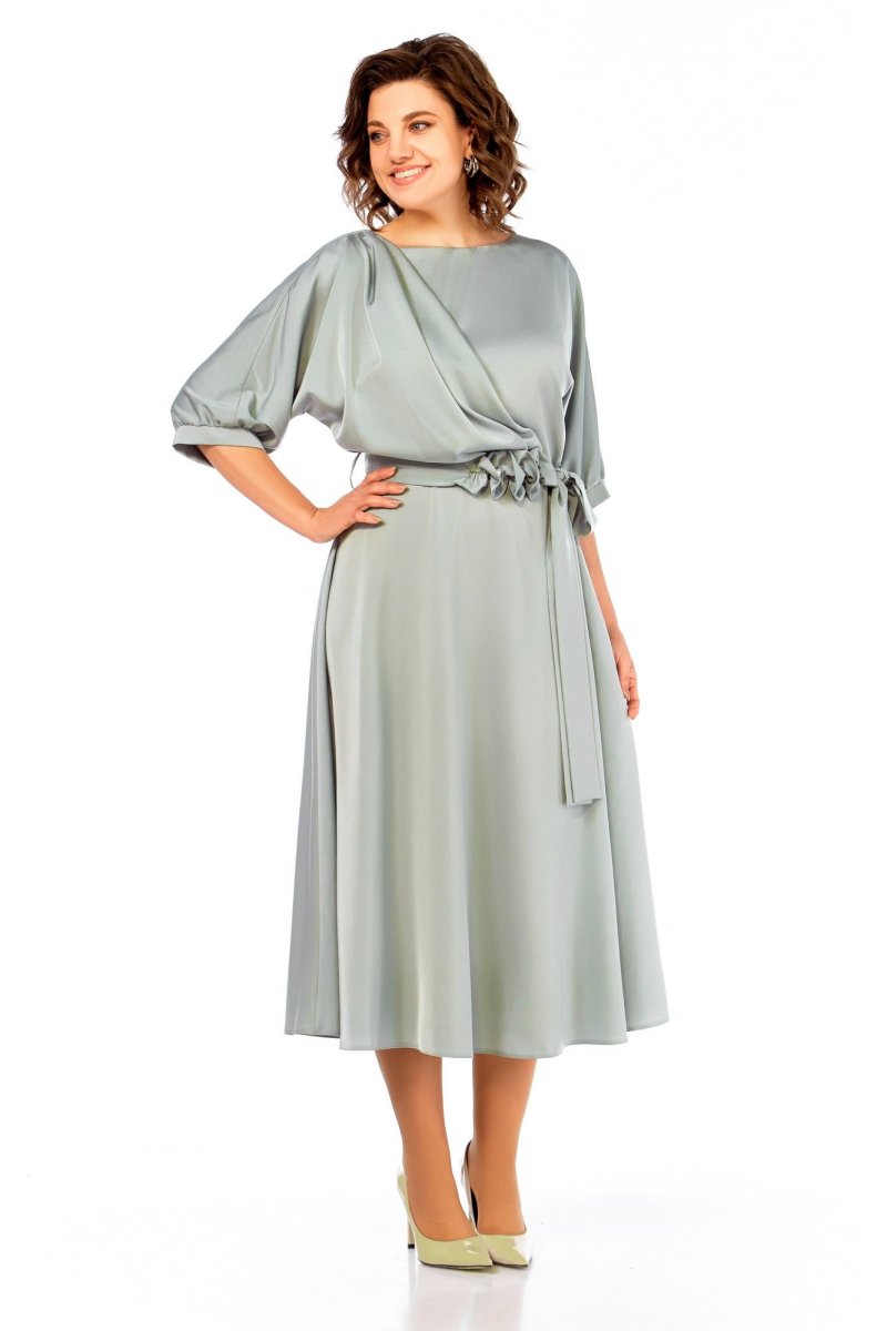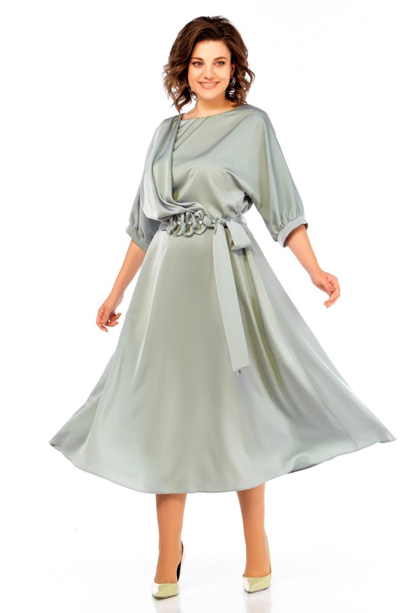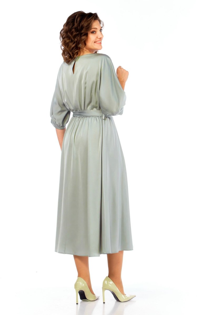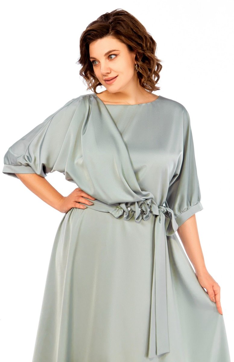 Нарядное платье из струящейся ткани, отрезное по линии талии. Верх летучая мышь, по низу рукава сборка и притачная манжета. Вырез горловины округлой формы. По переду ассиметричная деталь от плеча до линии подреза. По линии подреза резинка. Нижняя часть платья клеш. К платью прилагается интересный пояс, украшенный стразами.