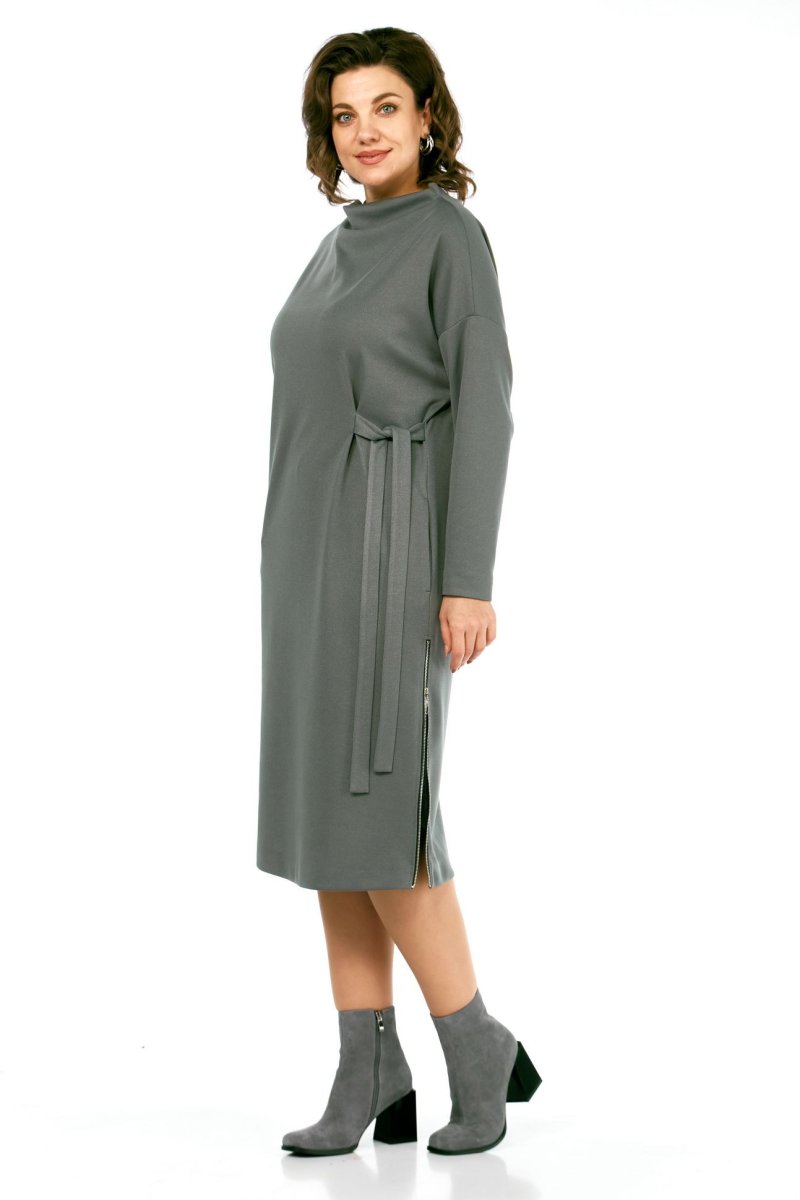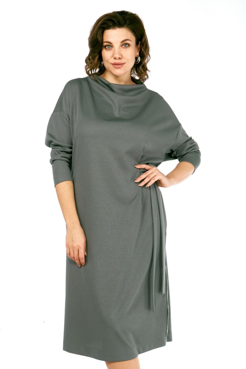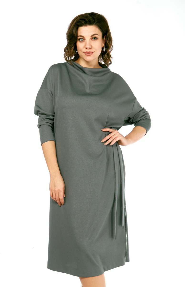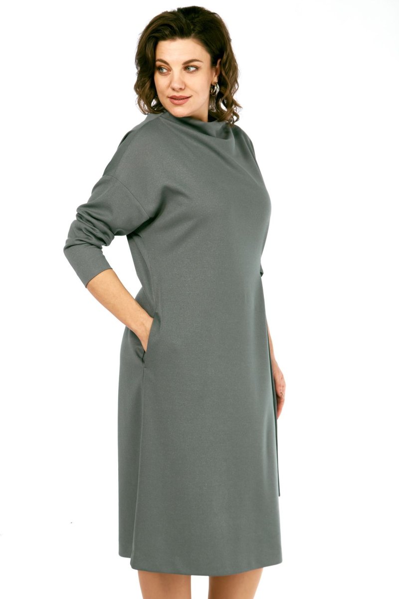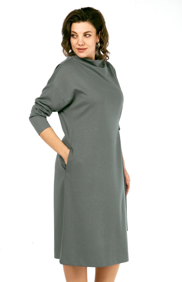 Платье женское, прямого силуэтв со спущенным длинным рукавом. Цельнокроенный воротник-стойка. Слевой стороны в области талии слева декор, в виде ниспадающего пояса. Карманы в боковых швах. Молния в левом боковом шве внизу функциональная молния, которая при растегивании превращается в разрез.