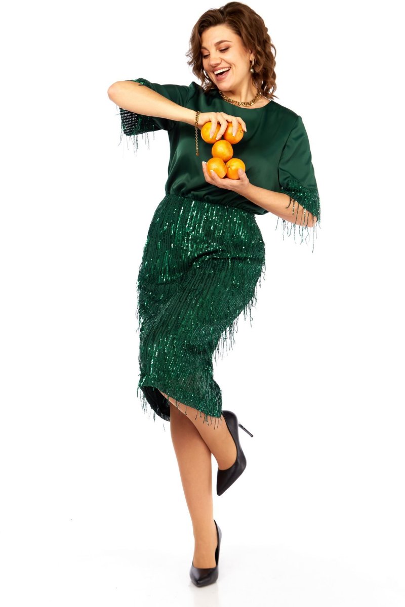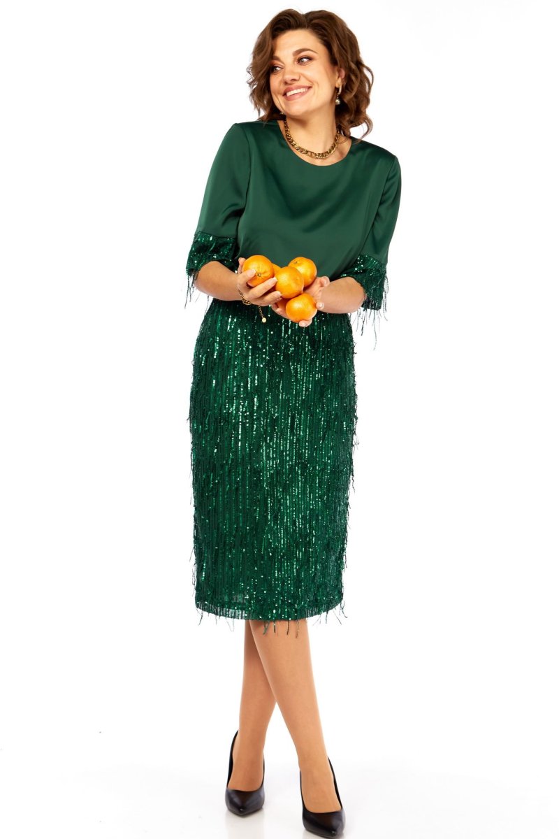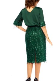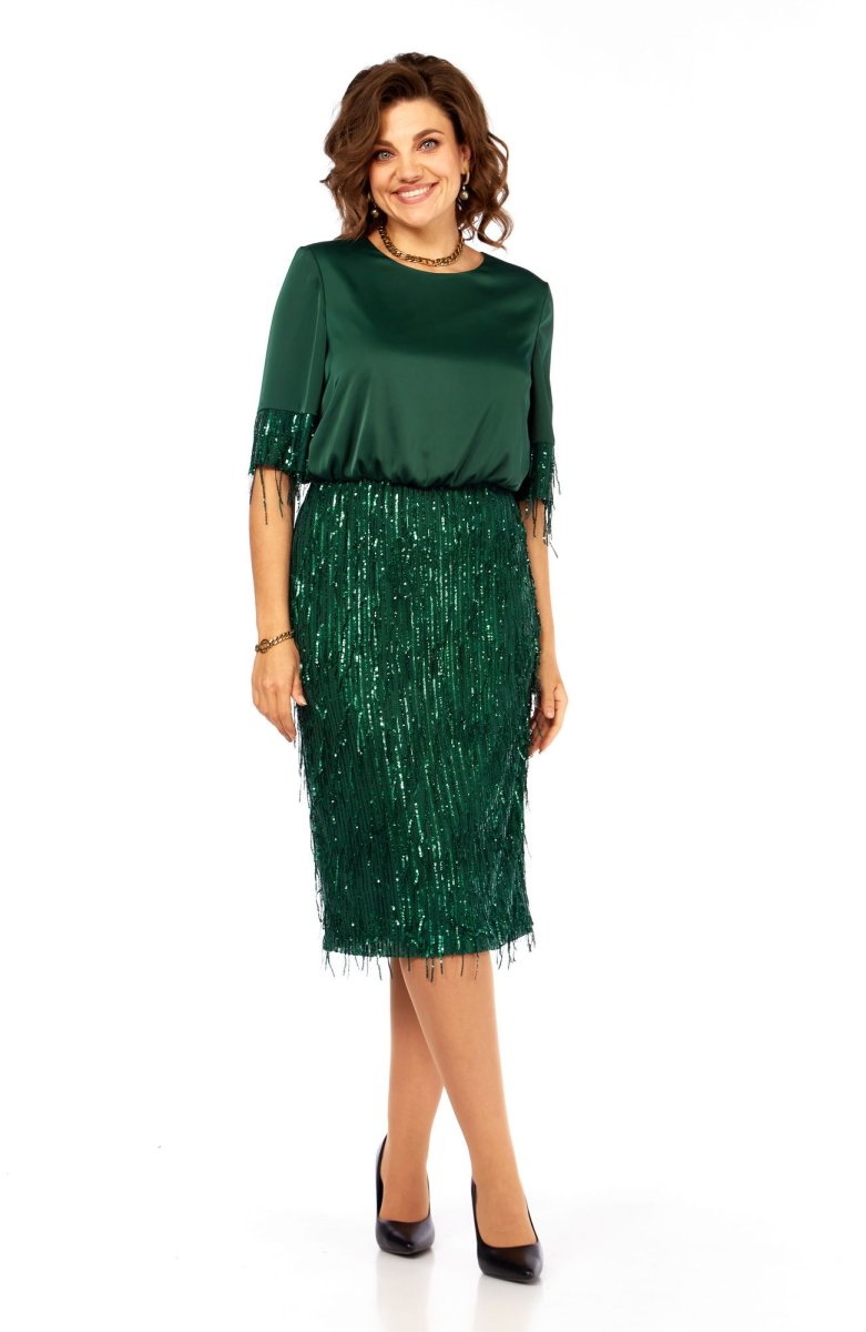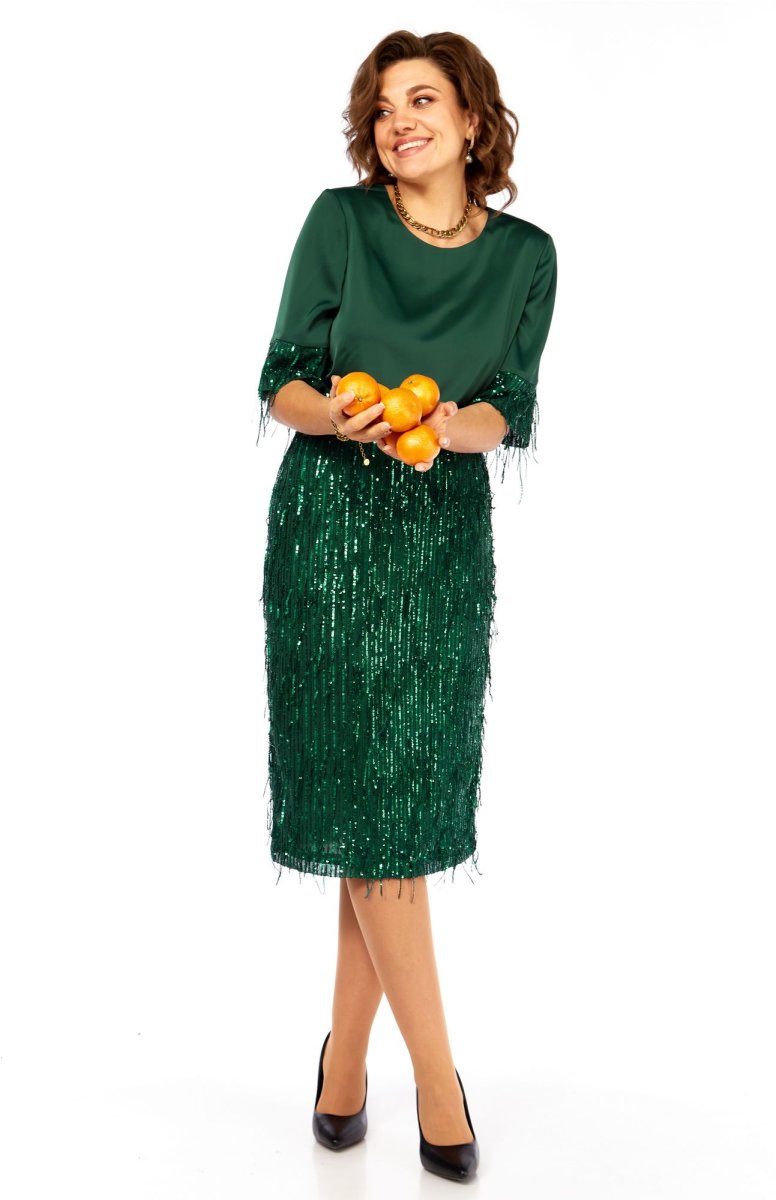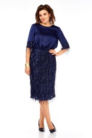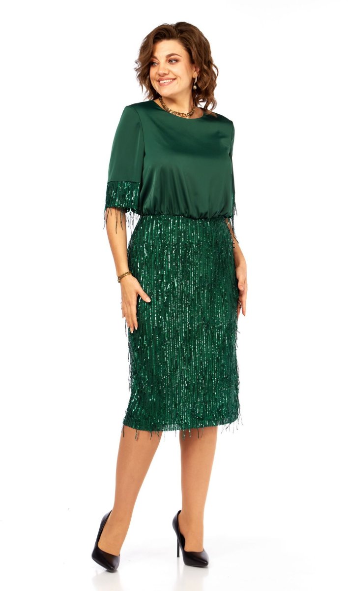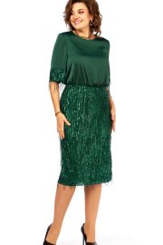 Нарядное платье, полуприлегающего силуэта. Вырез горловины округлой формы спереди, по спинке V-образной формы. Отрезное по линии талии, на резинке. Верхняя часть из струящейся ткани, а низ из ткани в паетки. Рукав короткий с отрезной деталью из ткани в паетки. В левом боковом шве молния.