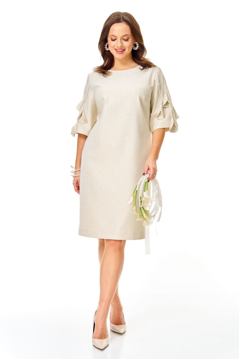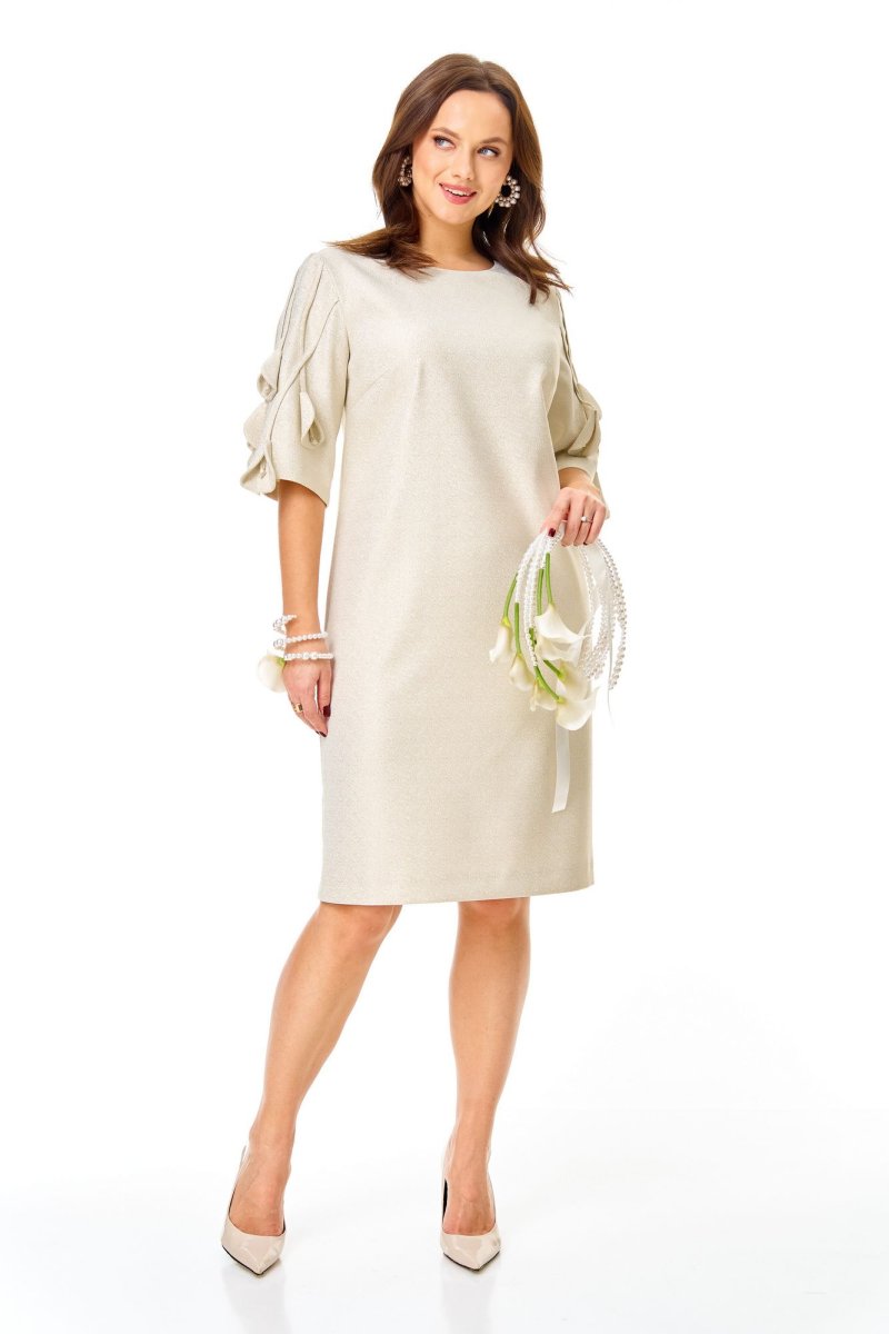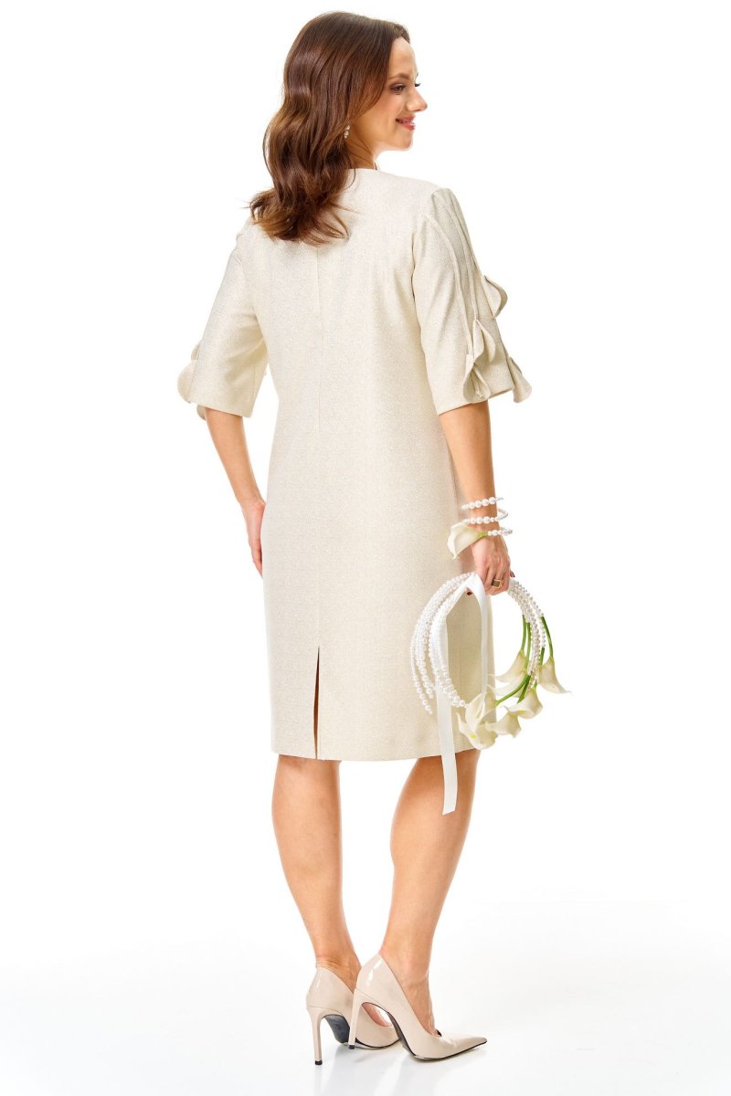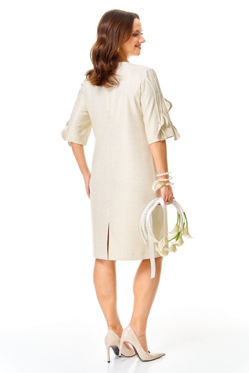 Нарядное платье полуприлегающего силуэта. Вырез горловины округлой формы. По переду нагрудные вытачки. Спинка со средним швом с потайной молнией и разрезом внизу. Рукав длиной ниже локтя, втачной, с настроченными декоративными элементами в форме цветов. Длина платья 96см, длина рукава 35см