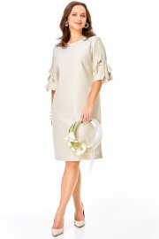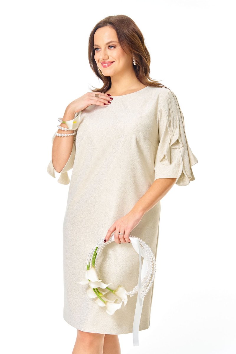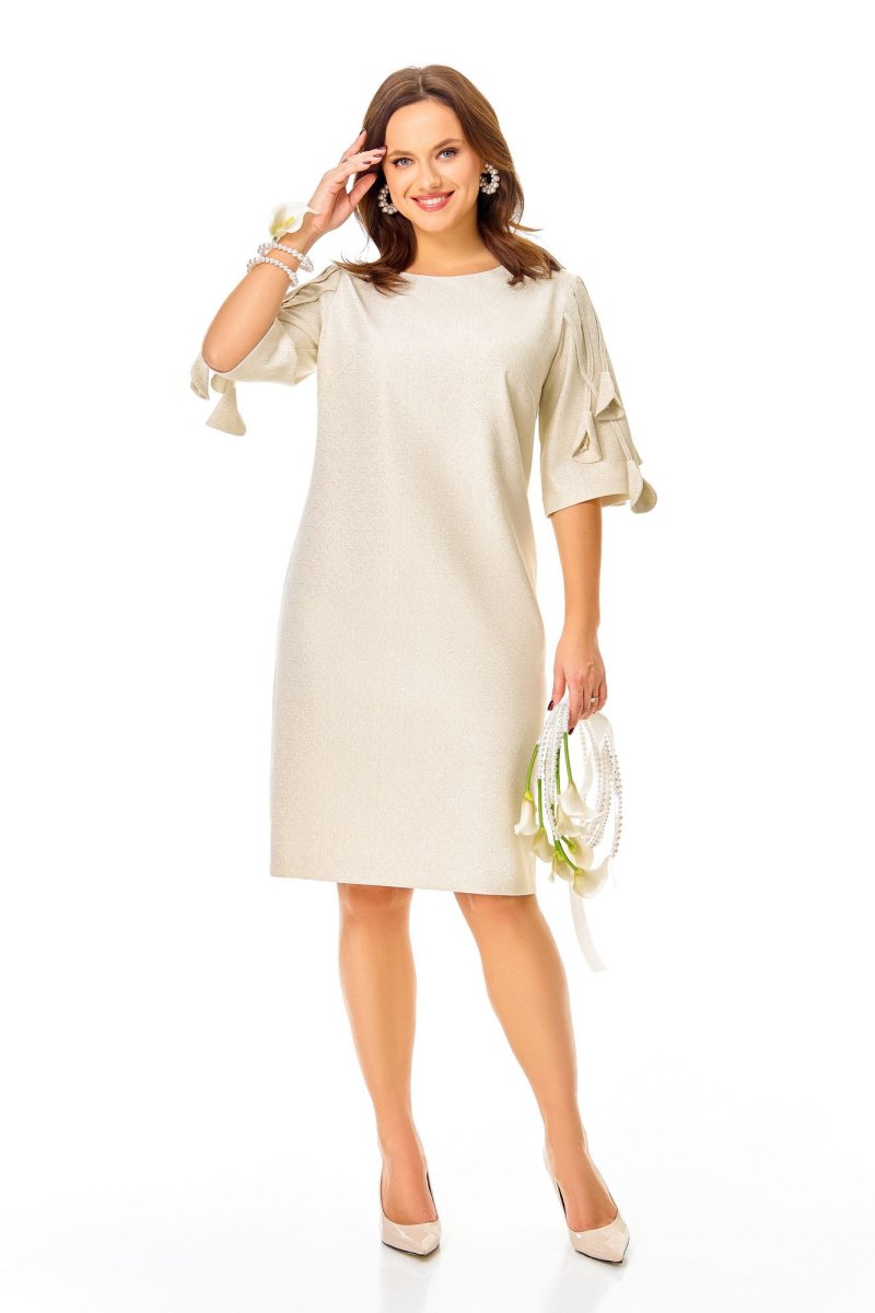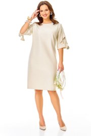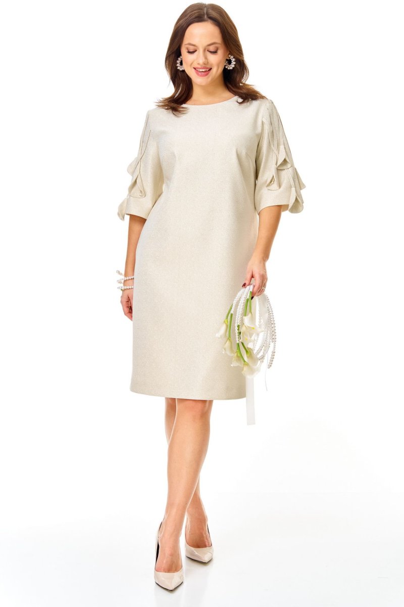Нарядное платье полуприлегающего силуэта. Вырез горловины округлой формы. По переду нагрудные вытачки. Спинка со средним швом с потайной молнией и разрезом внизу. Рукав длиной ниже локтя, втачной, с настроченными декоративными элементами в форме цветов. Длина платья 96см, длина рукава 35см