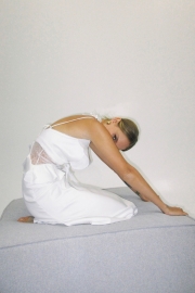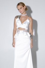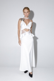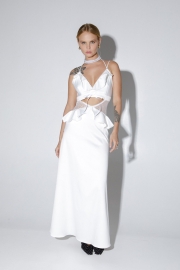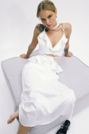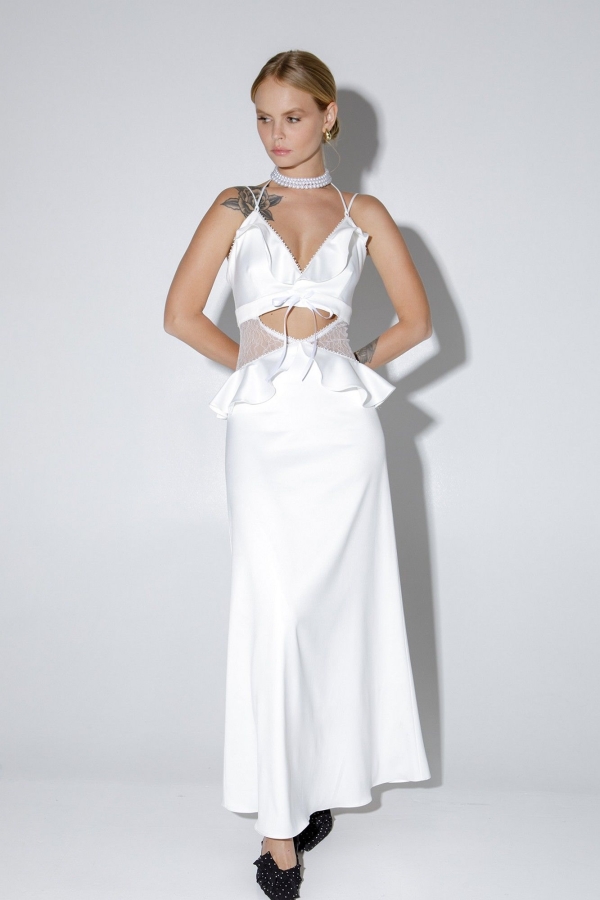 Платье-комбинация длины макси с воланами и кружевом. Детали: прилегающий силуэт, глубокий V-образный вырез, завышенная фигурная линия талии, лиф переда с рельефами и воланами, потайная молния в среднем шве спинки, регулируемые бретели, платье на трикотажной подкладке. Длина по боковому шву около 119 см