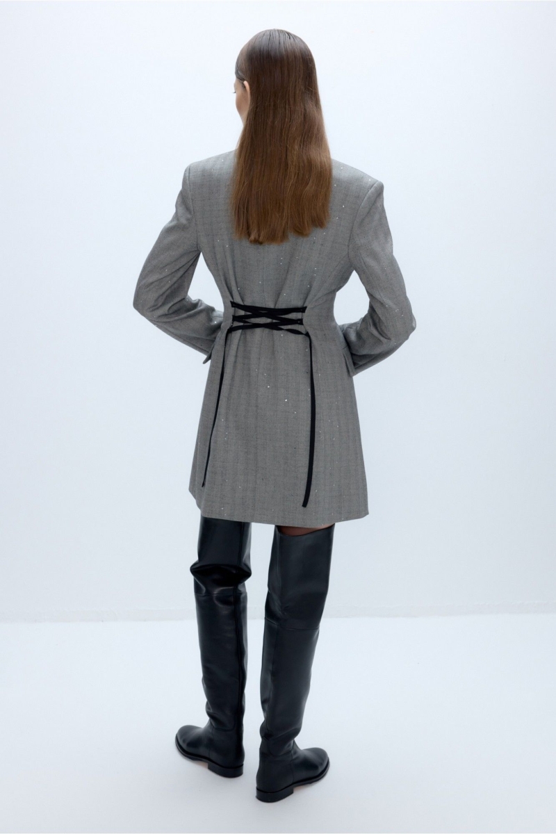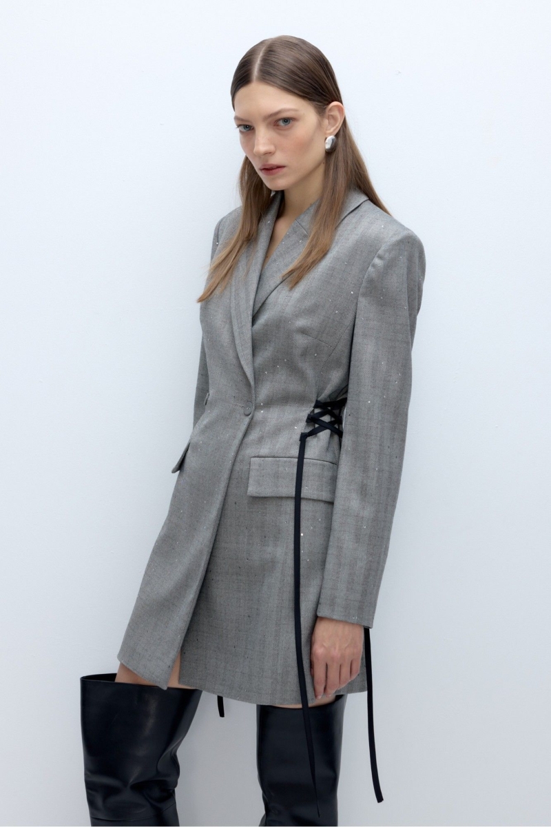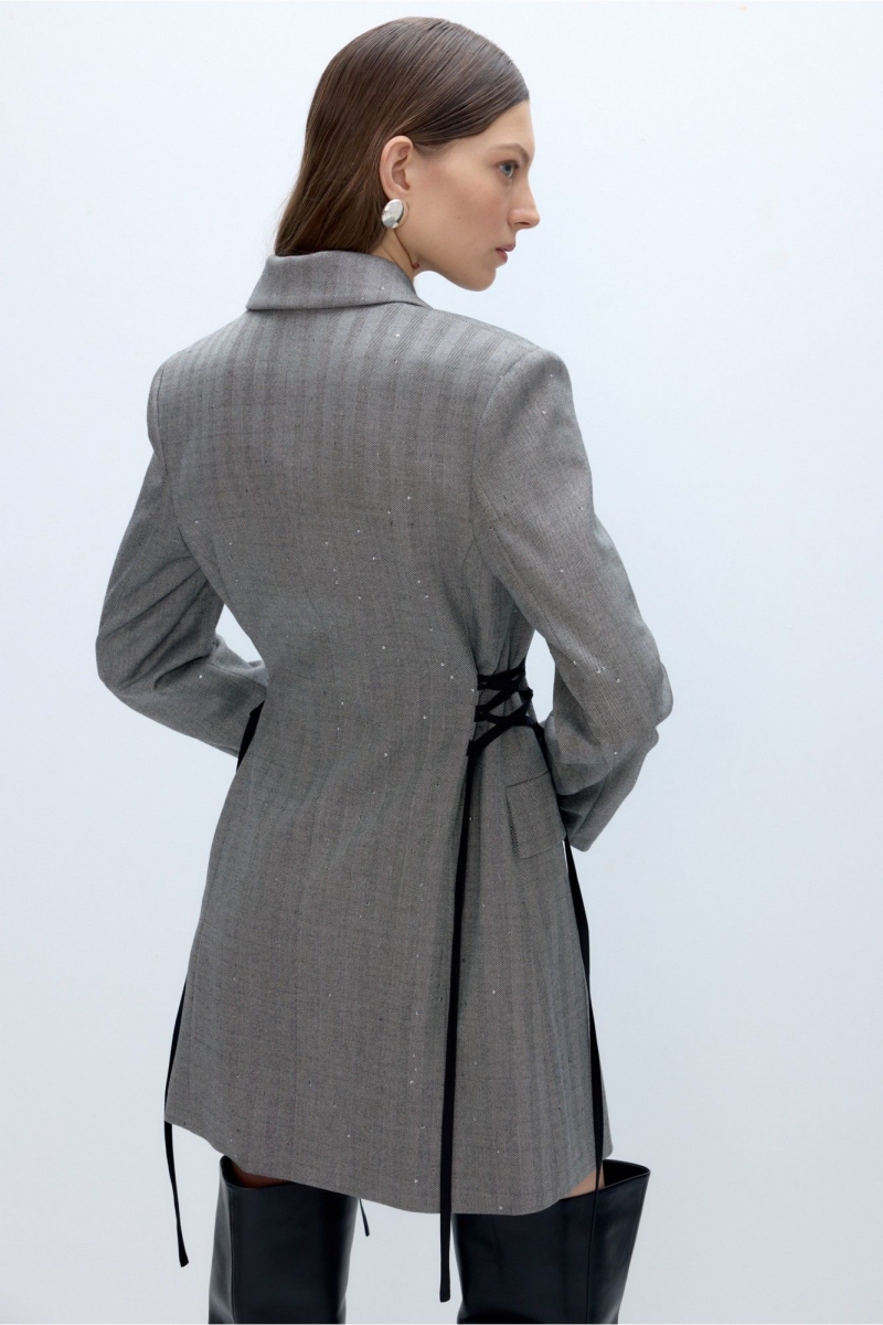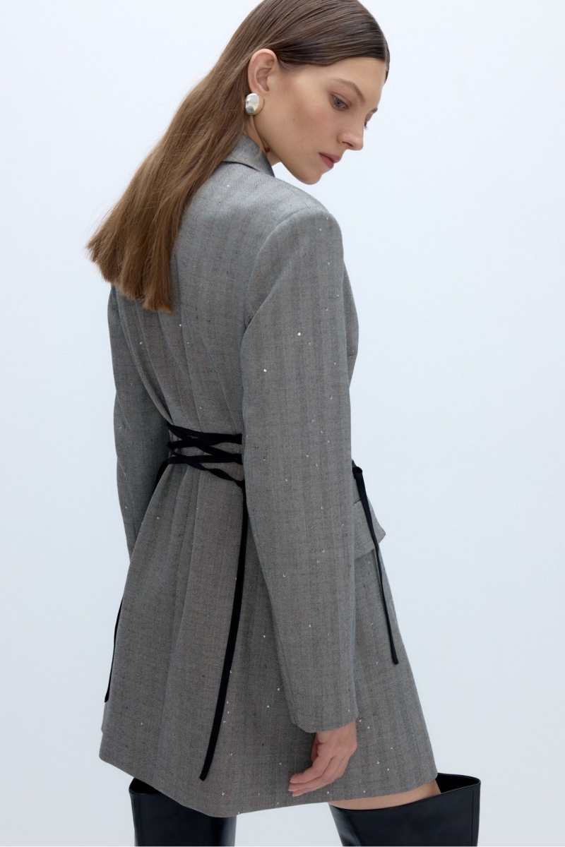 Платье-жакет с контрастной шнуровкой по талии. Детали: полуприлегающий силуэт, рельефы, пиджачный воротник, застежка на две петли и пуговицы, функциональные карманы, платье на подкладке 100% хлопок. Платье можно зашнуровать двумя способами- по бокам и по центру. Длина по спинке около 81 в размерах 40-46 и около 85 см в размерах 48-52, длина рукавов около 61 см.
