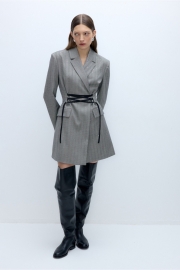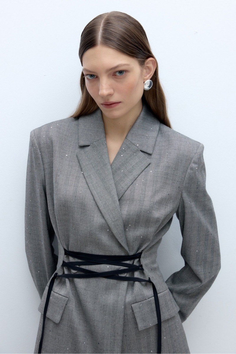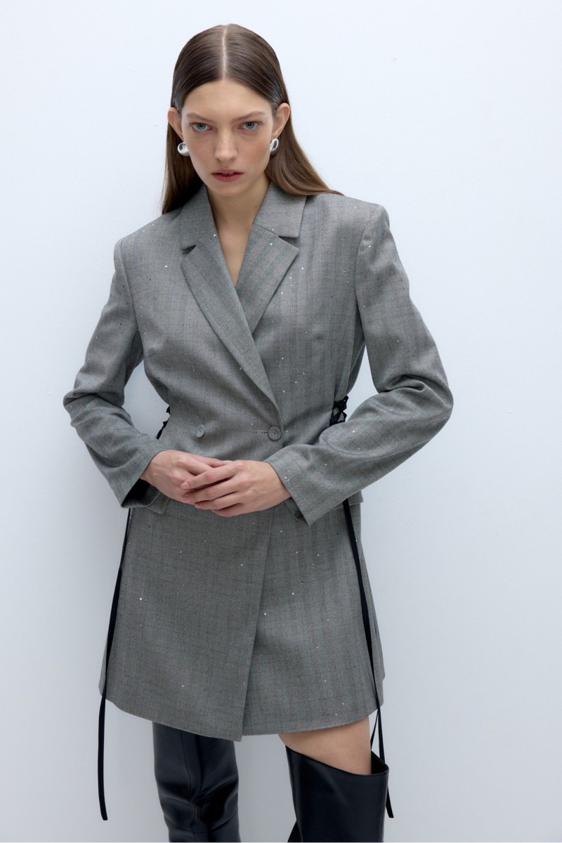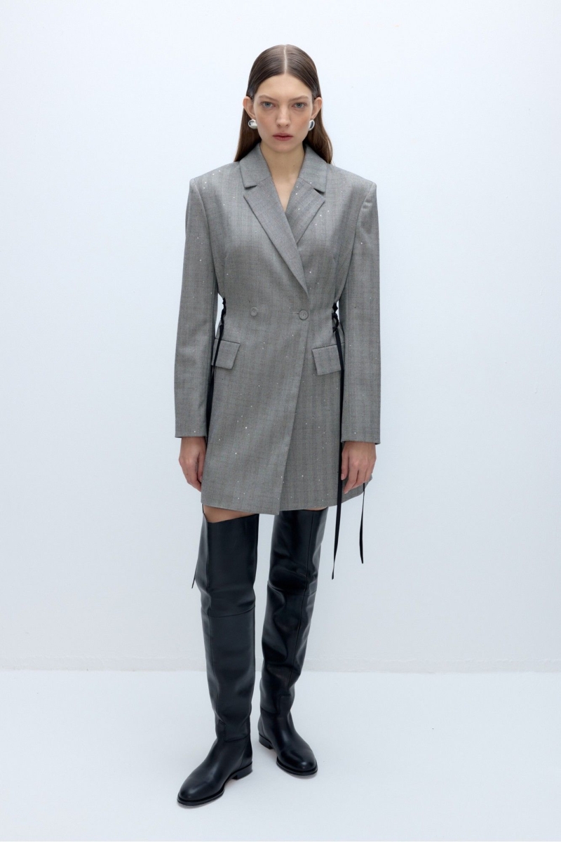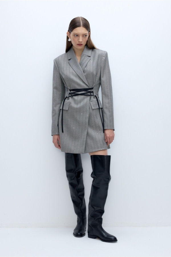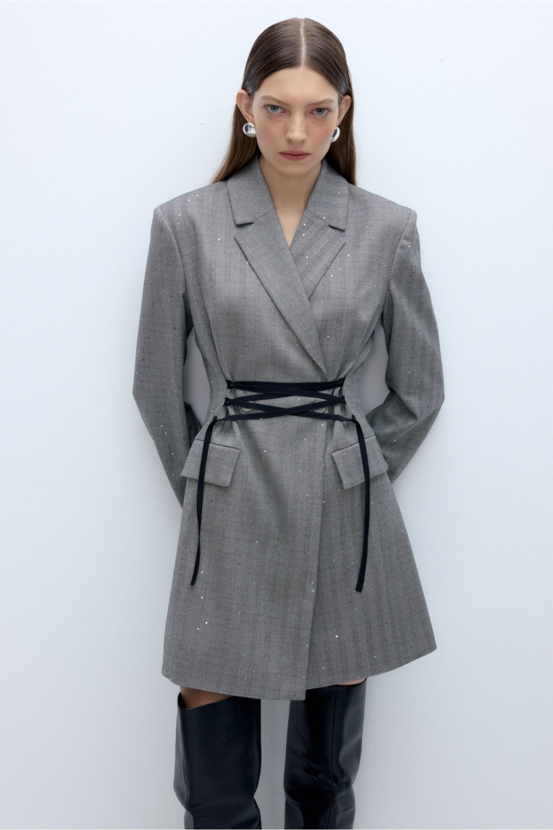 Платье-жакет с контрастной шнуровкой по талии. Детали: полуприлегающий силуэт, рельефы, пиджачный воротник, застежка на две петли и пуговицы, функциональные карманы, платье на подкладке 100% хлопок. Платье можно зашнуровать двумя способами- по бокам и по центру. Длина по спинке около 81 в размерах 40-46 и около 85 см в размерах 48-52, длина рукавов около 61 см.