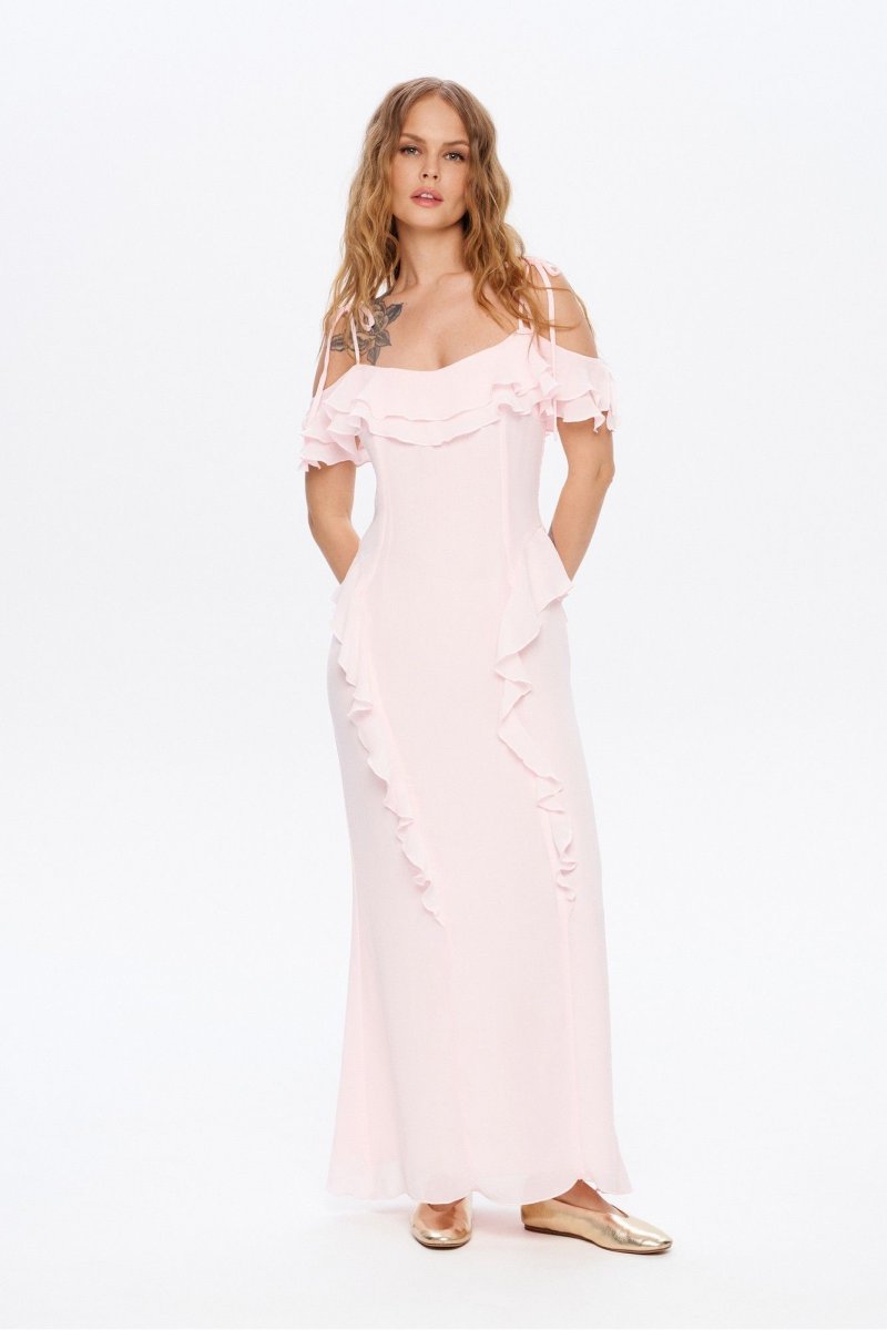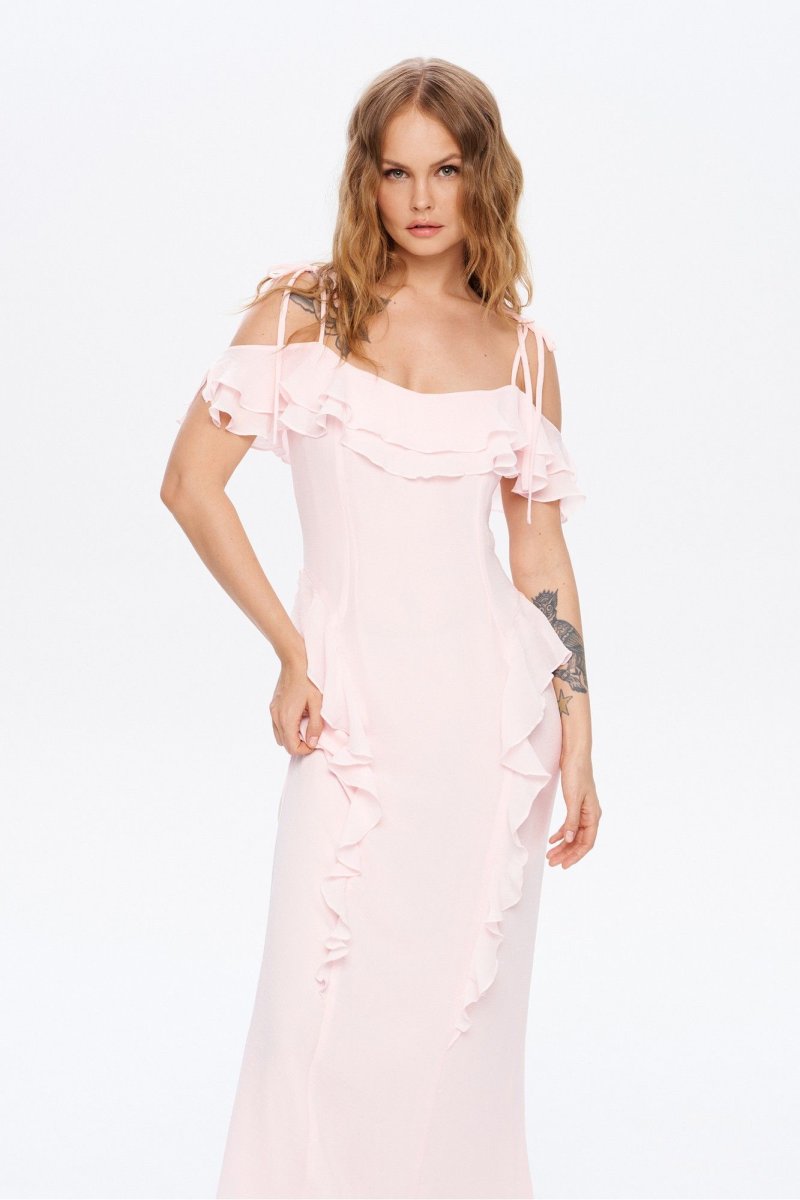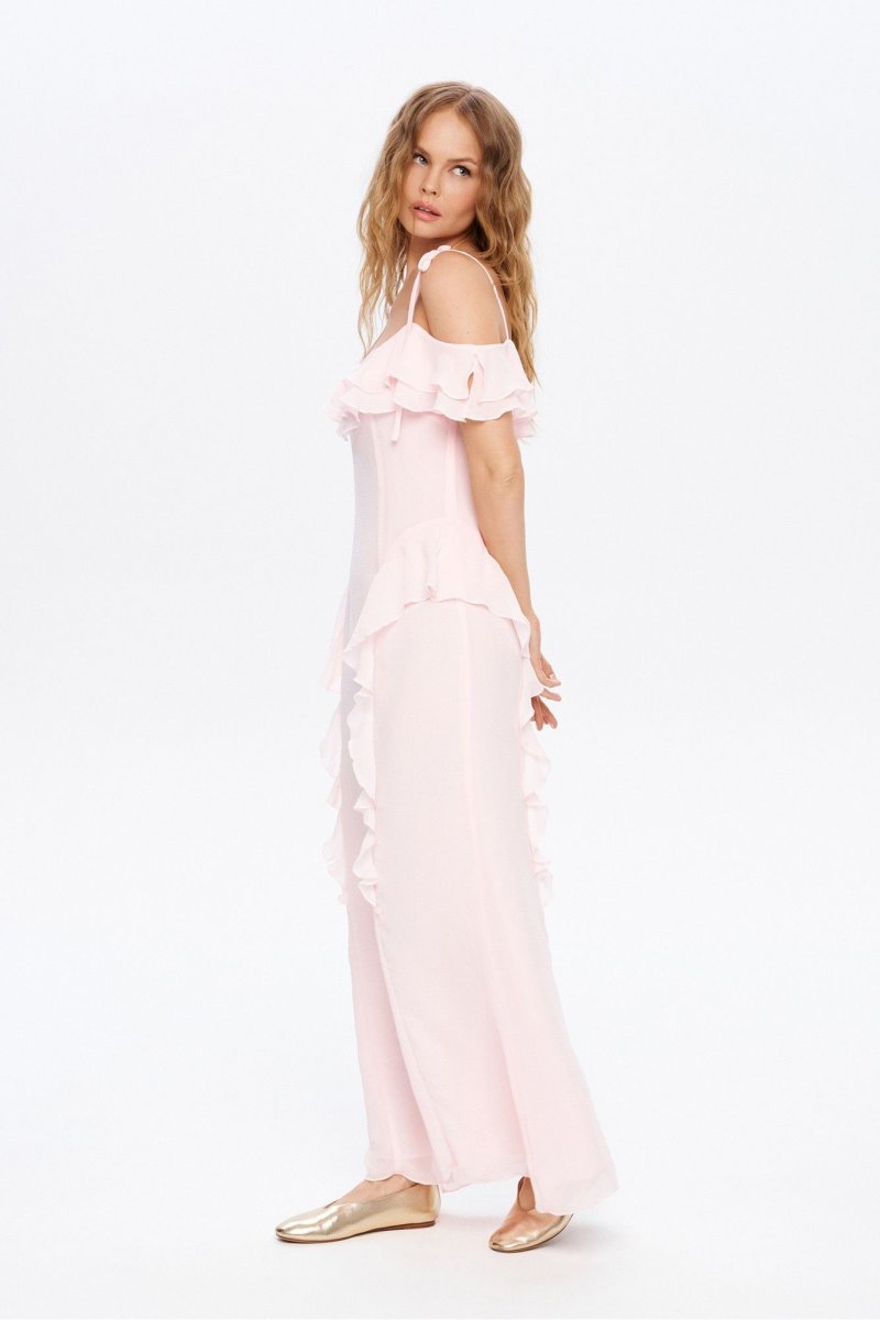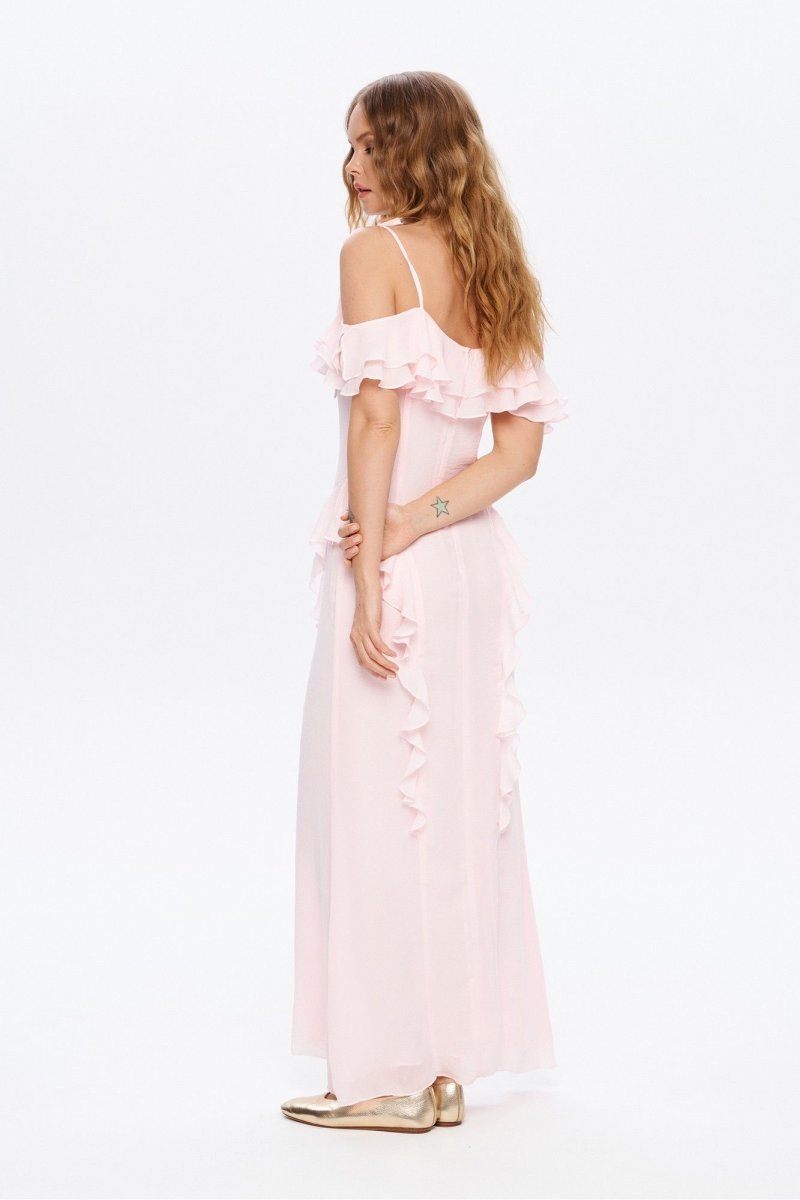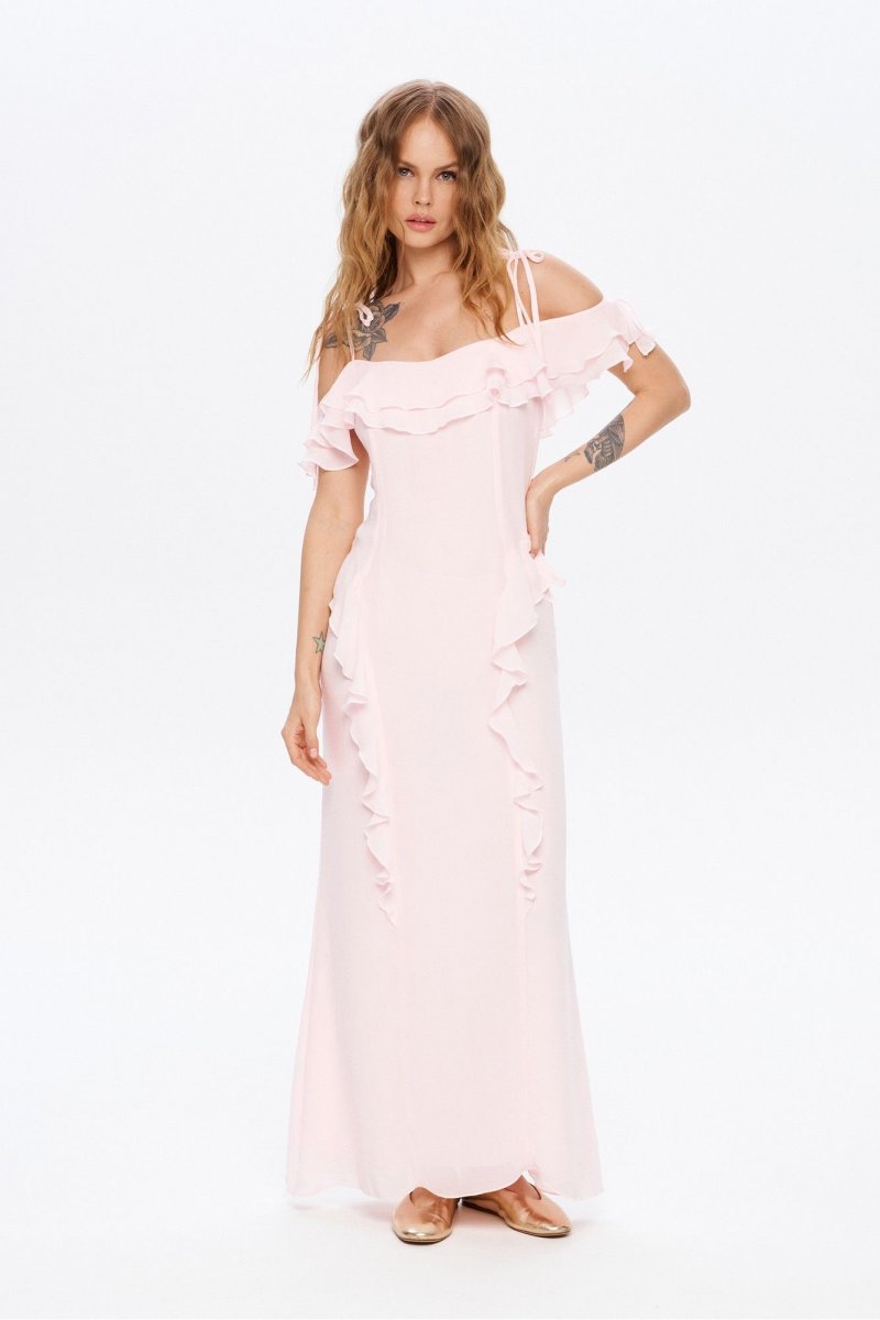 Макси-платье с воланами. Детали: прилегающий силуэт, рельефные швы переда и спинки, фигурный лиф с оборками, застежка по спинке на потайную молнию, регулируемые бретели, платье на подкладке из основной ткани. Длина платья по боковому шву около 119 см