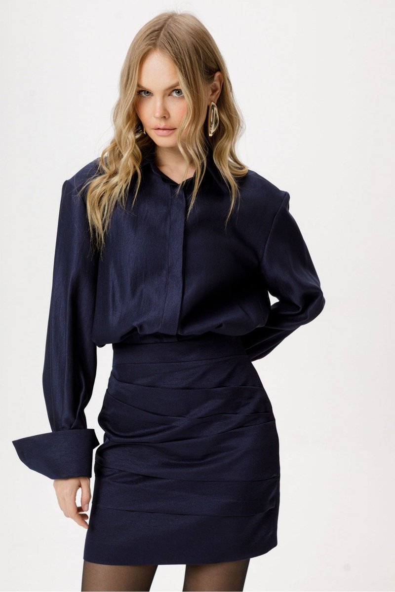 Детали: платье полуприлегающего силуэта, отрезное по талии с напуском, нижняя часть переда с ассиметричными складками, нижняя часть спинки с талиевыми вытачками, верхняя часть платья со складками на талии, рубашечный воротник, застёжка на потайную планку с пуговицами, потайная молния в боковом шве, рубашечный покрой рукава с расширенным плечом, широкие манжеты. Юбка платья на подкладке.