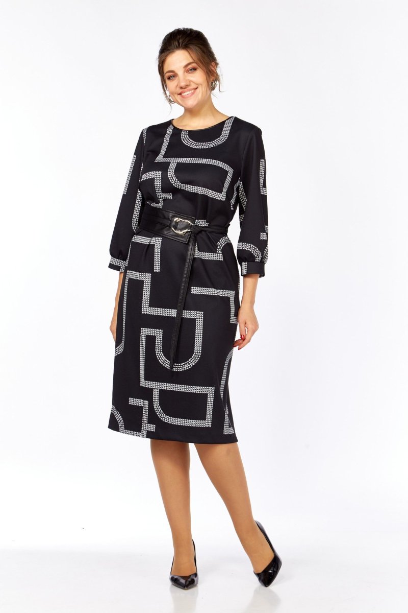 Платье женское прямого силуэта выполнено из высококачественного трикотажного полотна с дизайнерским принтом. В боковых швах имеются функциональные карманы. Перед с округлым вырезом, оформлен кожаным кантом. Спинка прямая со средним швом. Рукав одношовный втачной длиной ¾. В комплекте идет кожаный съемный пояс.