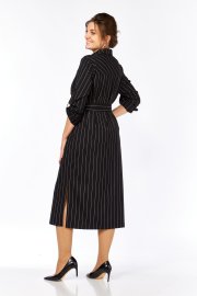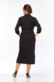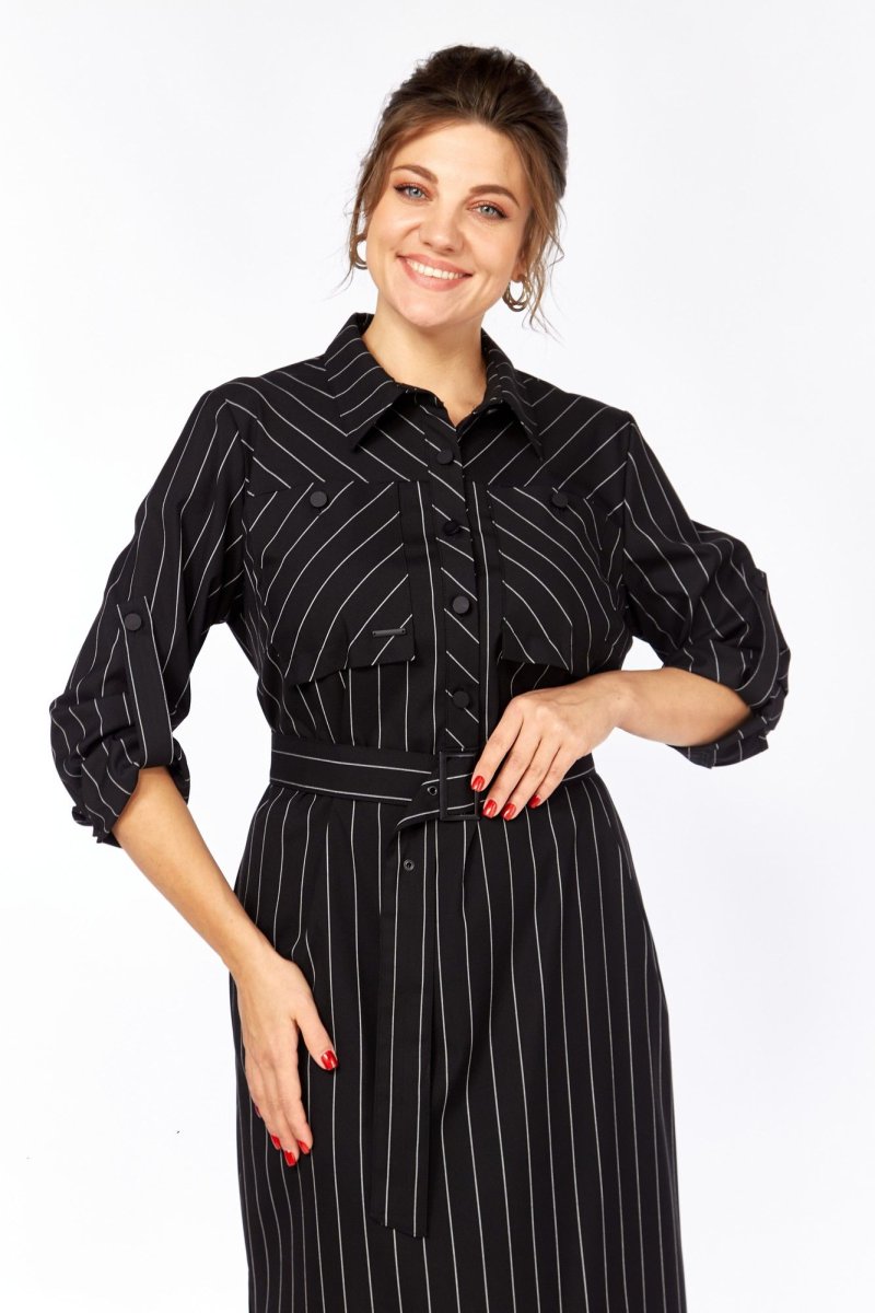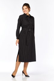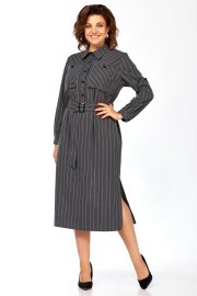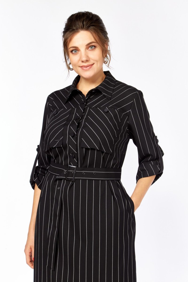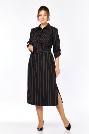 Модное платье-рубашка из плательно-костюмной ткани в изысканную полоску — идеальное сочетание шика и современности. Универсальная длина и разрезы по боковым швам придают образу лёгкость и динамику, а пояс выгодно подчёркивает линию талии, создавая женственный силуэт.