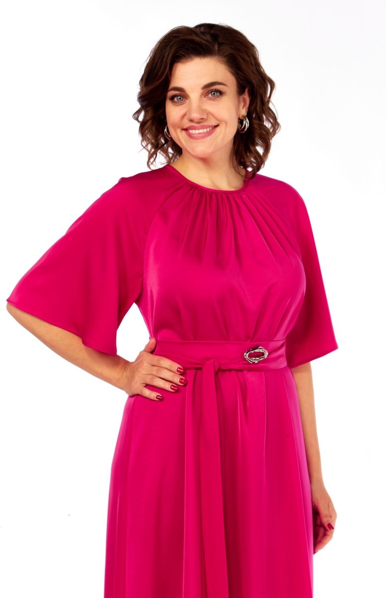 Сочетание элегантности и изысканности. Минималистичное по крою платье длины макси из двустороннего сатина. Вырез горловины округлый, спереди на сборке. Рукав реглан, расширенный к низу. Спинка со средним швом и углубленным разрезом сверху. Линия талии дополнительно подчёркивается поясом с декоративной фурнитурой.