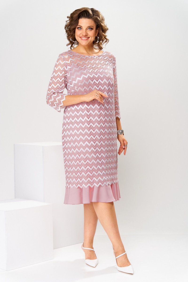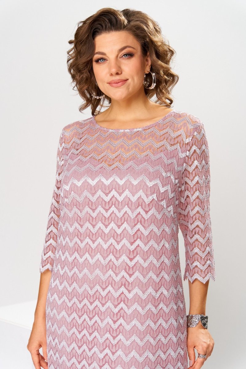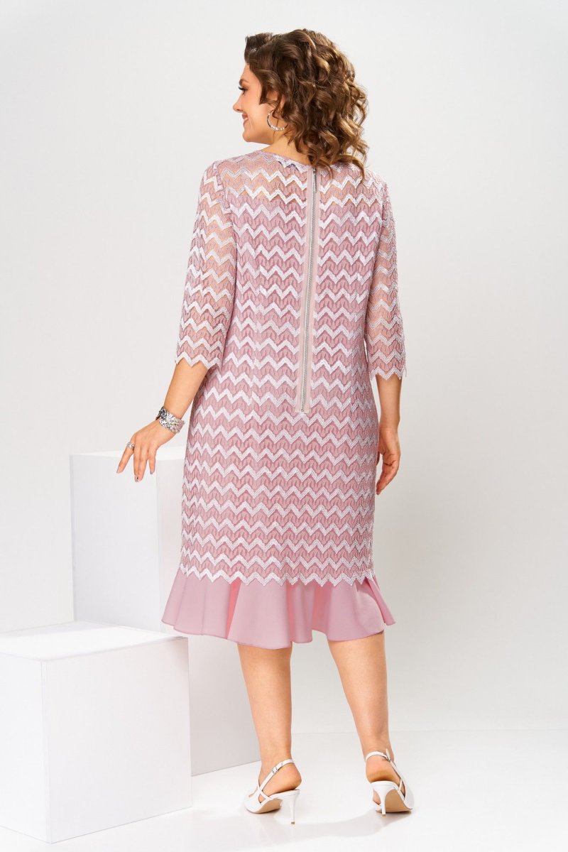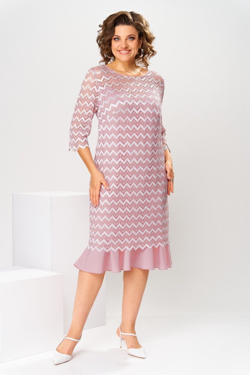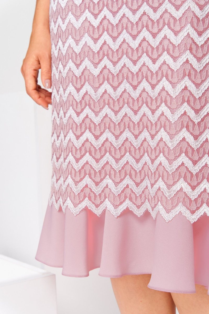 Платье женское полуприлегающего силуэта, длиной за колено. Платье относится к нарядной торжественной одежде. Платье выполнено из трикотажного кружевного полотна на подкладке из отделочной ткани. Перед с двумя нагрудными вытачками. Спинка с двумя талиевыми вытачками. Горловина платья круглая, обтачная. Застежка на отделочную тесьму-молнию в вертикальном центральном разрезе спинки. По низу платья притачная рюша из отделочной ткани. Рукав втачной, короткий, одношовный. Платье без плечевых накладок. Длина спинки 103 см, длина рукава 29 см