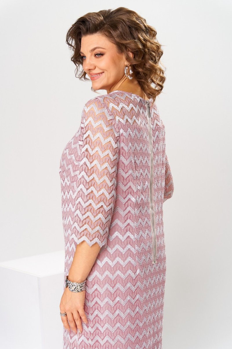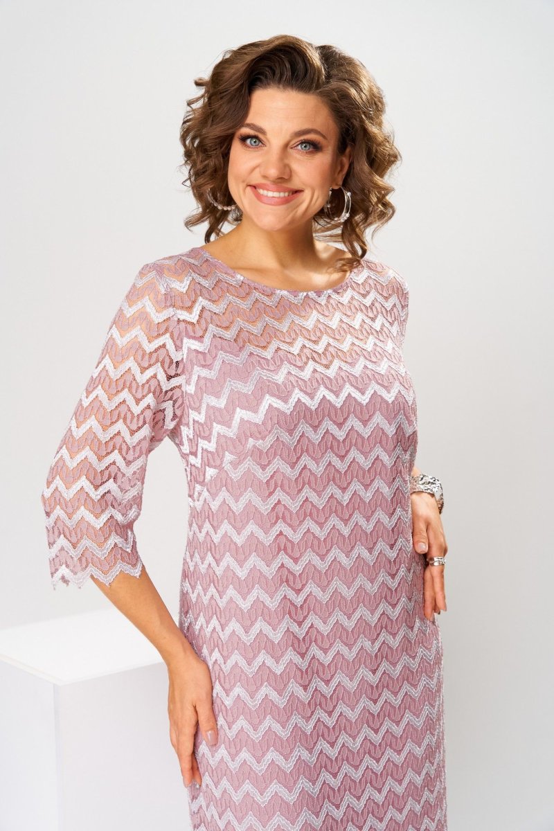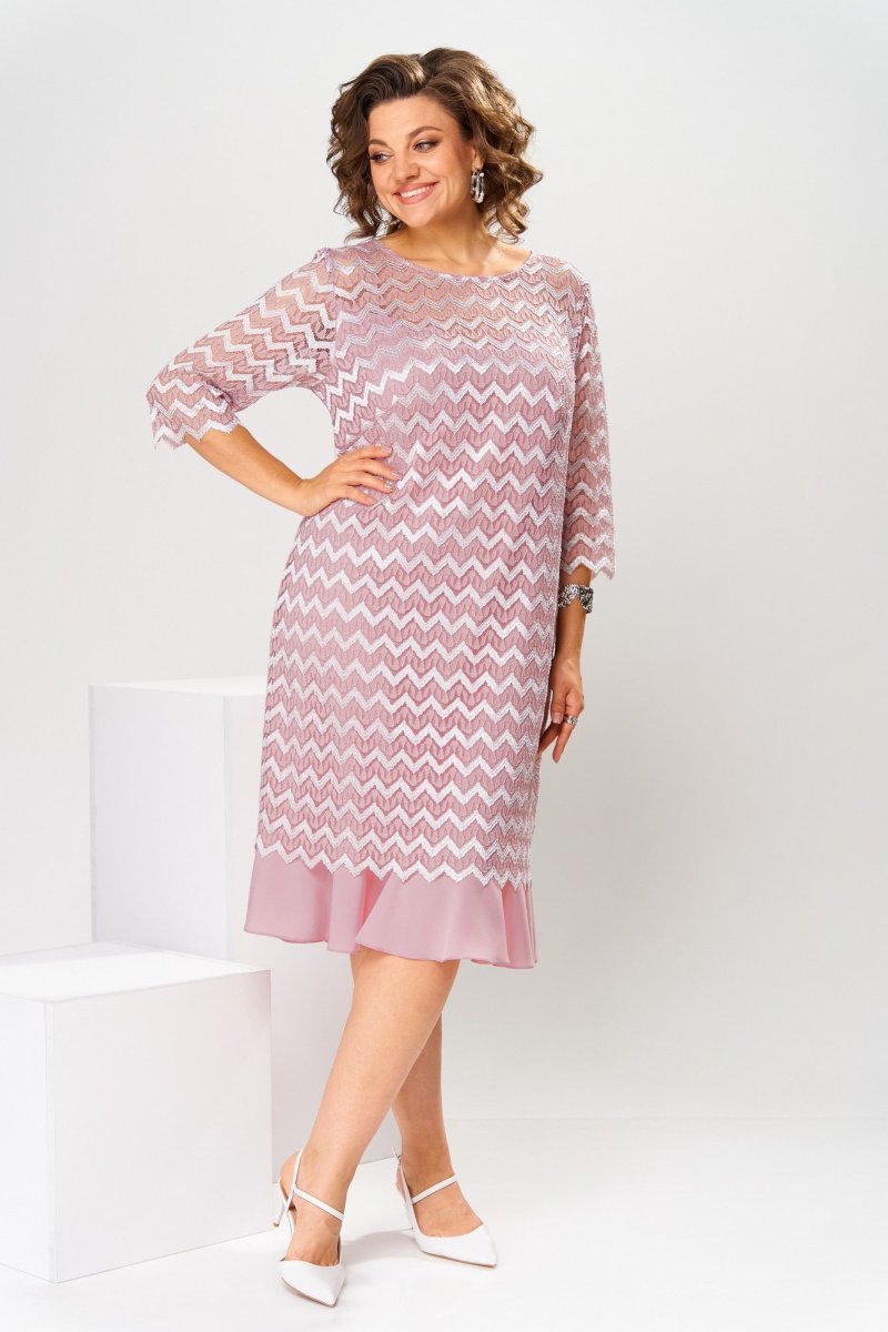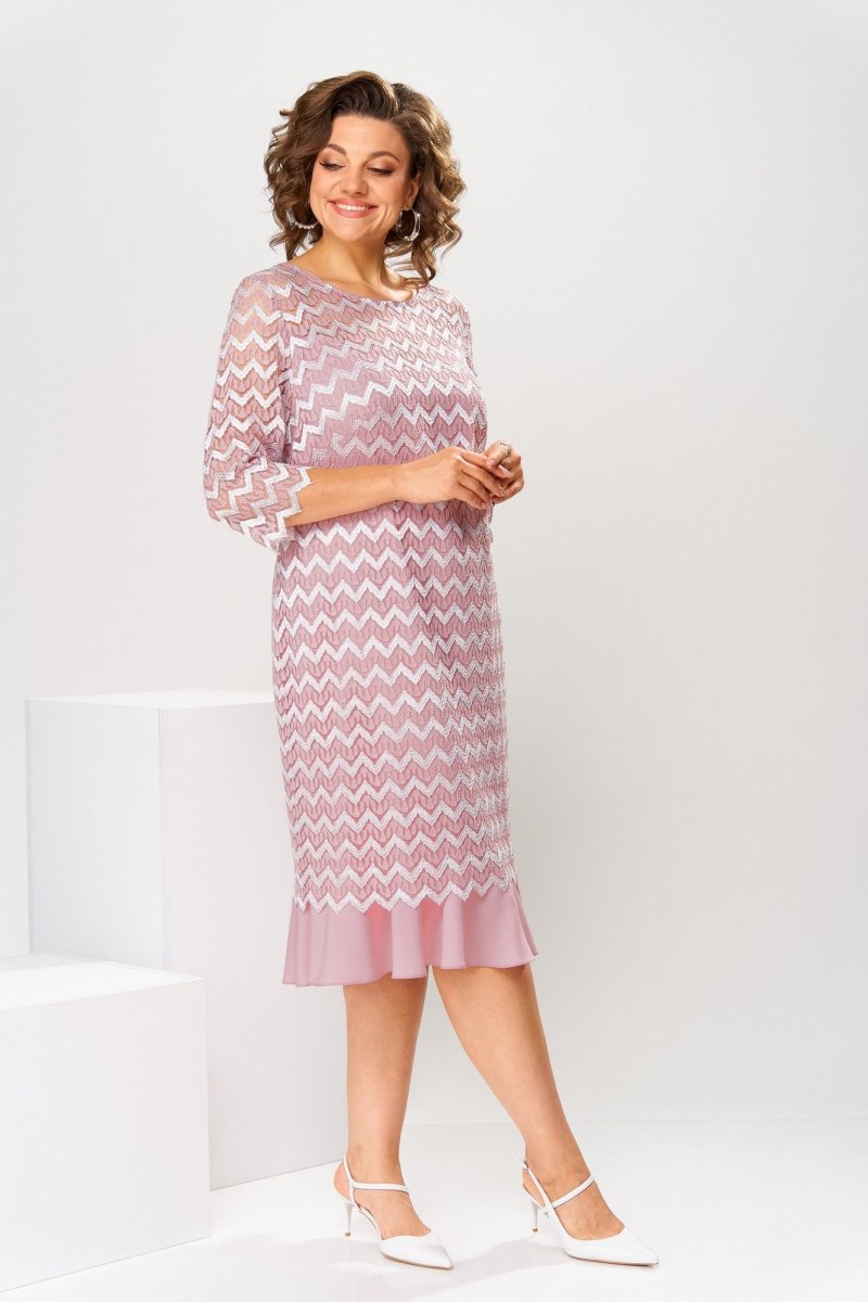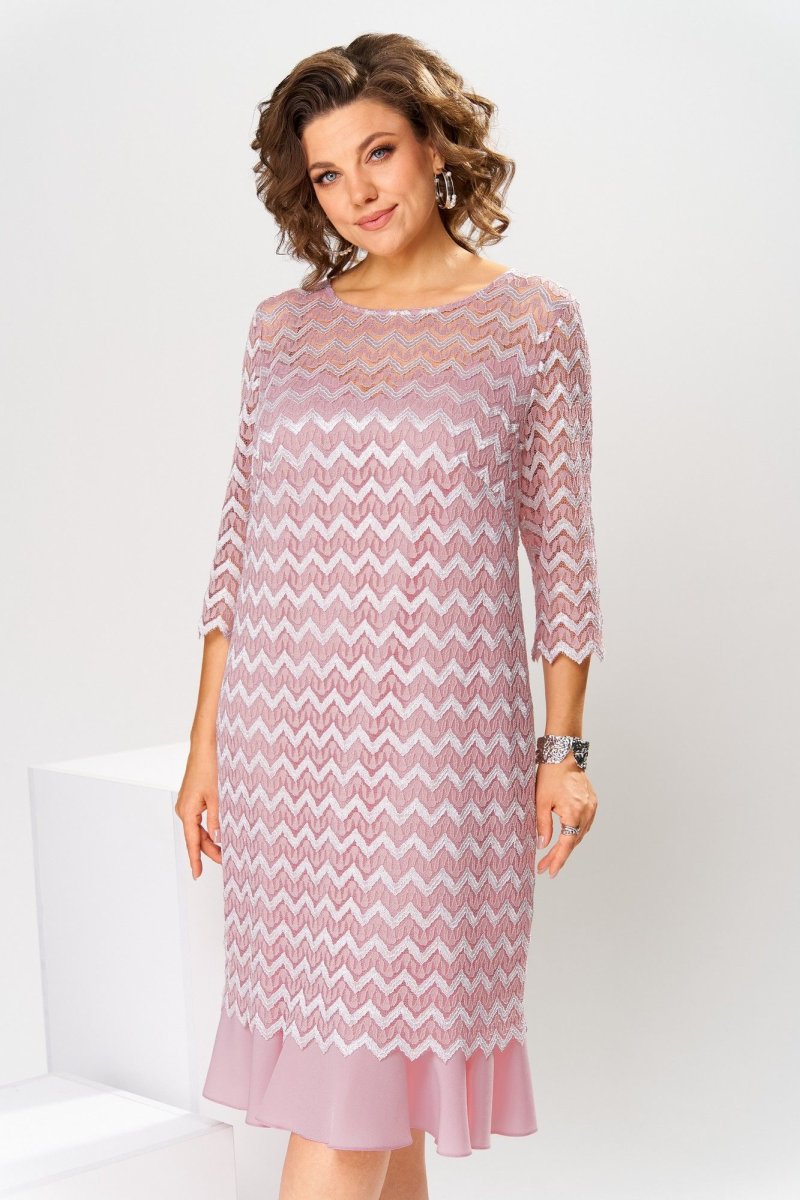 Платье женское полуприлегающего силуэта, длиной за колено. Платье относится к нарядной торжественной одежде. Платье выполнено из трикотажного кружевного полотна на подкладке из отделочной ткани. Перед с двумя нагрудными вытачками. Спинка с двумя талиевыми вытачками. Горловина платья круглая, обтачная. Застежка на отделочную тесьму-молнию в вертикальном центральном разрезе спинки. По низу платья притачная рюша из отделочной ткани. Рукав втачной, короткий, одношовный. Платье без плечевых накладок. Длина спинки 103 см, длина рукава 29 см