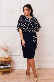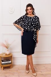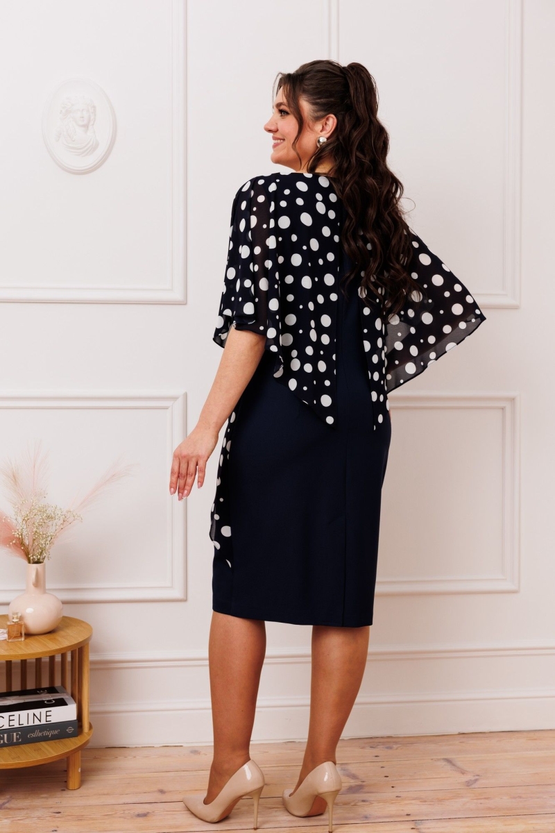 Платье женское относится к нарядной торжественной одежде. Платье полуприлегающего силуэта, с отлетной накидкой длиной за колено. Перед с двумя нагрудными вытачками, с двумя талиевыми вытачками. Спинка с двумя талиевыми вытачками и средним швом, заканчивающимся шлицей. Застежка на потайную тесьму-молнию в среднем шве спинки. Горловина круглая, обтачная, без воротника, по горловине закреплена накидка. Слева на уровне линии талии отделочным хлястиком, декорированным тесьмой накидка закрепляется на платье, нижняя часть накидки закреплена в левом боковом шве. Накидка с фигурным низом. Платье без рукавов. Длина спинки 103 см. Длина накидки от горловины 38 см.