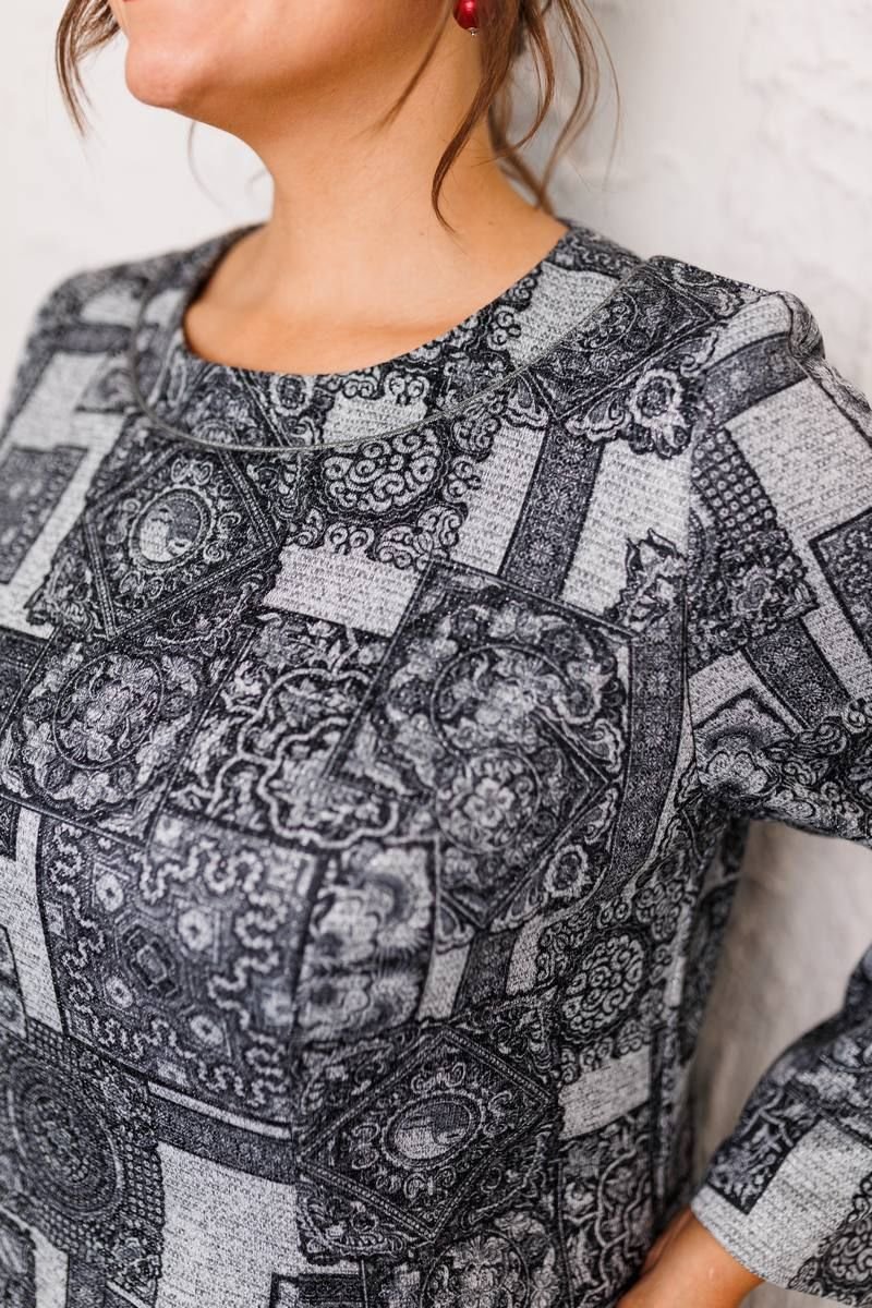 Платье предназначено для повседневной носки. Платье женское, полу прилегающего силуэта, длиной ниже колена. Верхняя часть платья (лиф)отлётная с фигурным низом "ступенька". Верхняя часть переда с 2-мя отрезными бочками. Верхняя часть спинки с 2-мя таллиевыми вытачками. Нижняя часть платья (юбки) из отделочной ткани. Нижняя часть переда с 2-мя таллиевыми вытачками. Нижняя часть спинки с 2-мя таллиевыми вытачками и средним швом, заканчивающимся шлицей. Горловина круглая с отрезной планкой, шов втачивания планки декорирован притачным кантом. Рукав втачной, одно шовный, длинный. Платье с плечевыми накладками. Длина спинки 110 см, длина рукава 57 см.
