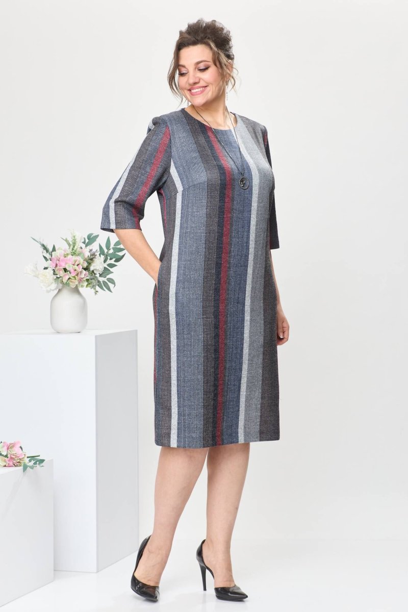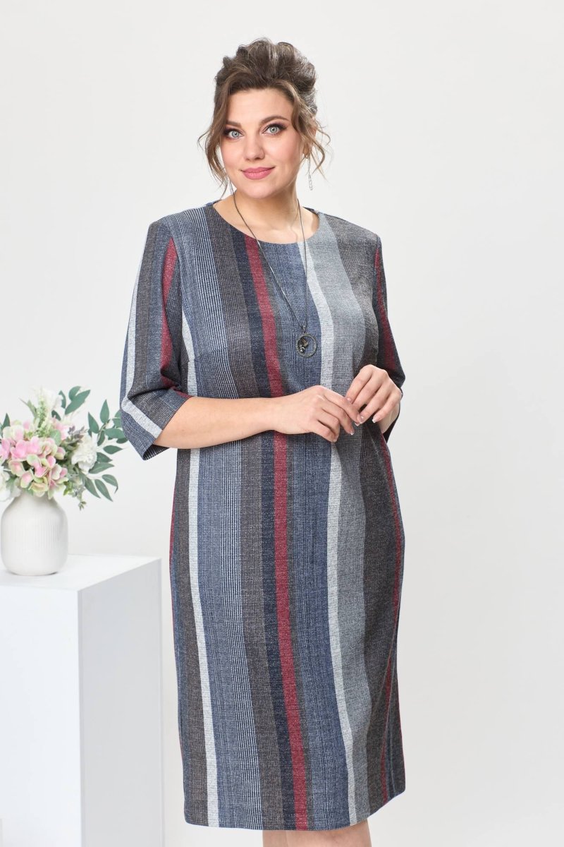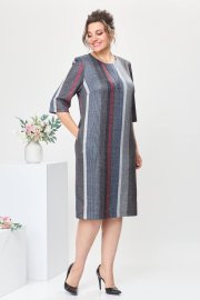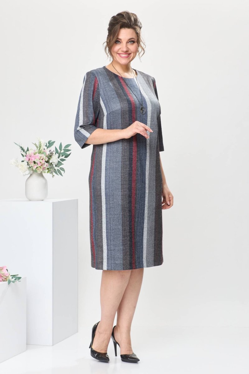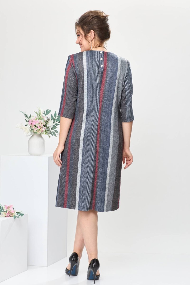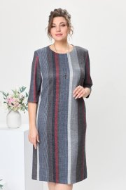 Платье женское предназначено для повседневной носки. Платье женское прямого силуэта, длиной за колено. Перед с двумя нагрудными вытачками. Спинка со средним швом, с двумя втачными планками вверху среднего шва. Застежка на три пробивных металлических кнопки на планках спинки. Горловина круглая, обтачная, без воротника. Рукав втачной, одношовный, длиной за локоть. В боковых швах платья обработаны карманы. Платье с плечевыми накладками. К платью прилагается съемное украшение. Длина платья 105 см. Длина рукава 40 см. ВНИМАНИЕ! Украшение входит в комплект с платьем!!!!!!!