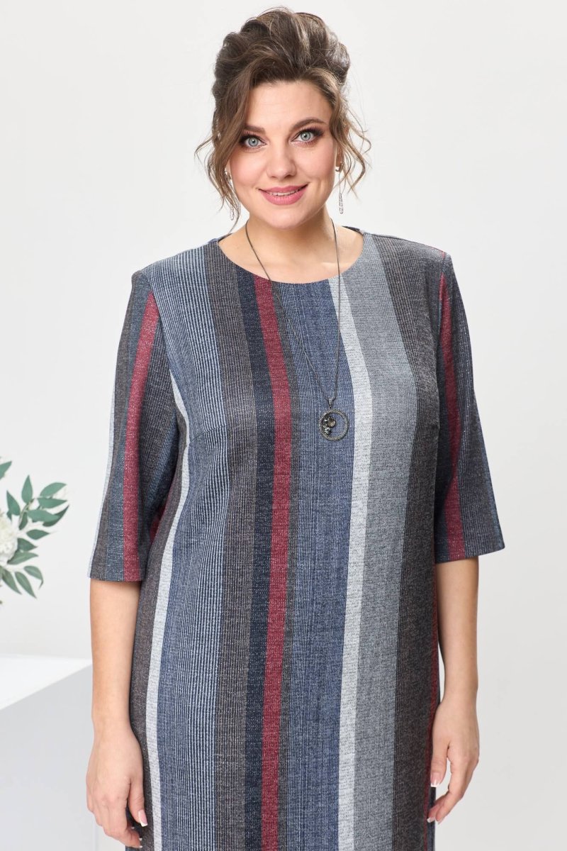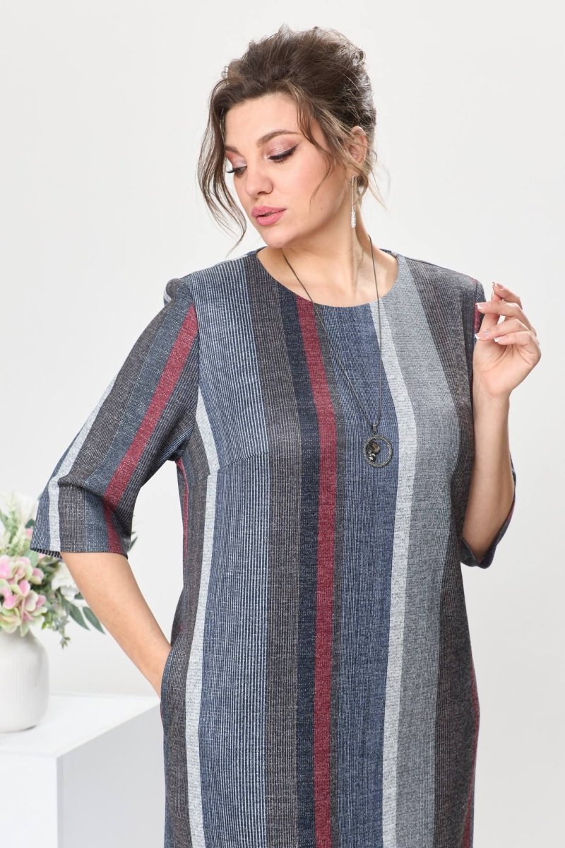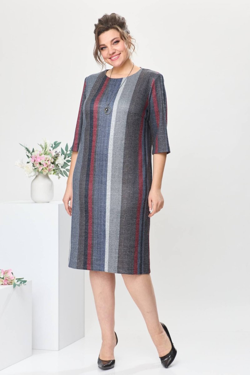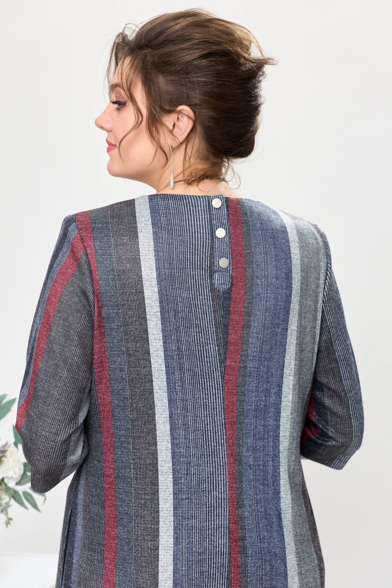 Платье женское предназначено для повседневной носки. Платье женское прямого силуэта, длиной за колено. Перед с двумя нагрудными вытачками. Спинка со средним швом, с двумя втачными планками вверху среднего шва. Застежка на три пробивных металлических кнопки на планках спинки. Горловина круглая, обтачная, без воротника. Рукав втачной, одношовный, длиной за локоть. В боковых швах платья обработаны карманы. Платье с плечевыми накладками. К платью прилагается съемное украшение. Длина платья 105 см. Длина рукава 40 см. ВНИМАНИЕ! Украшение входит в комплект с платьем!!!!!!!