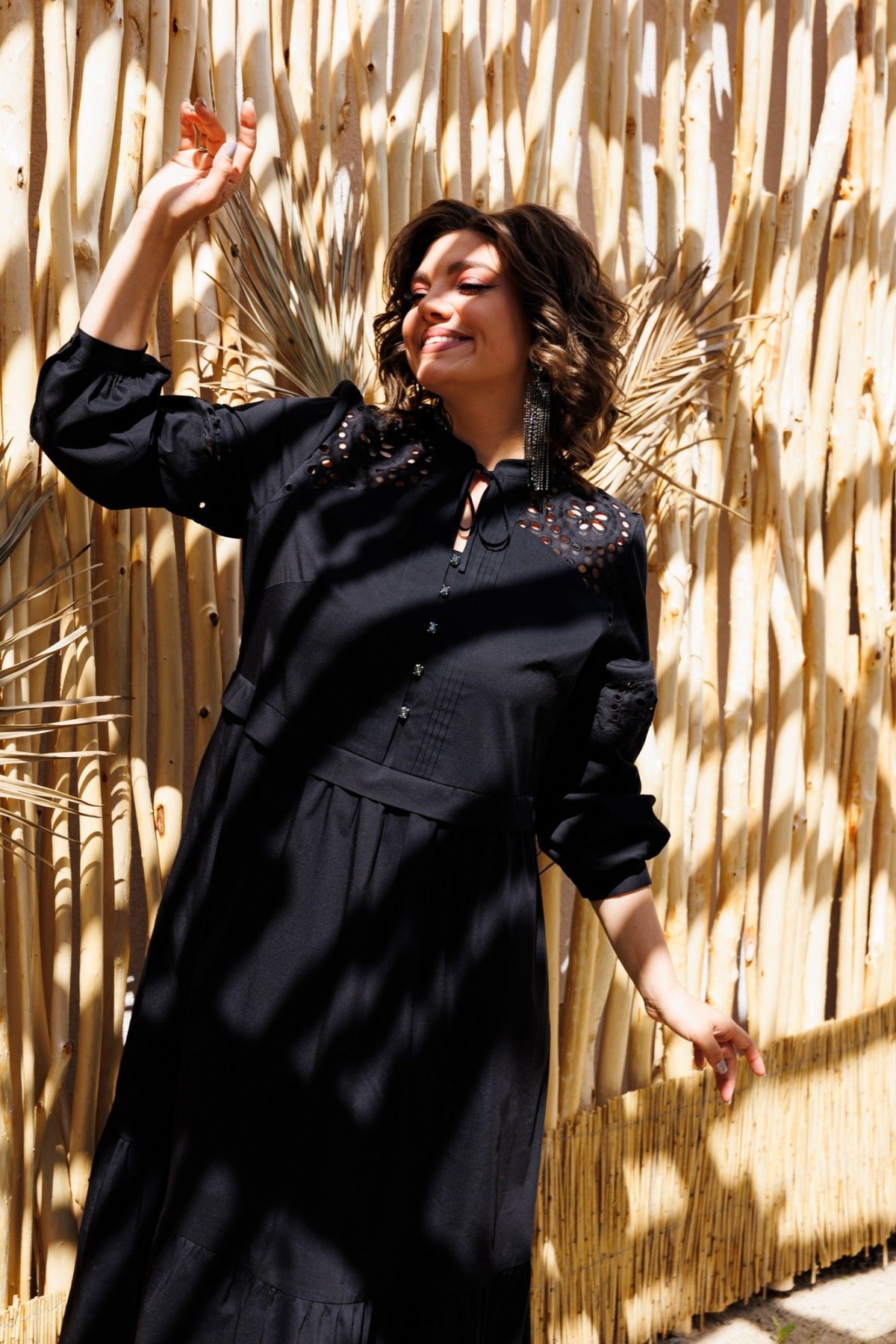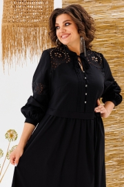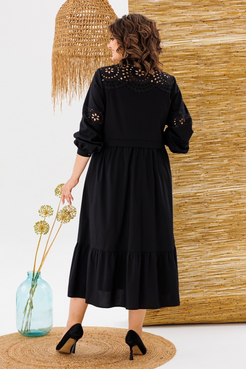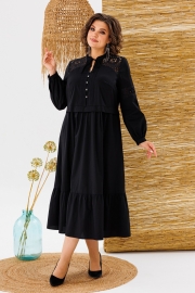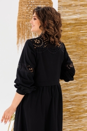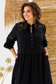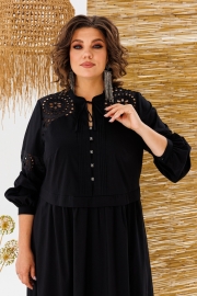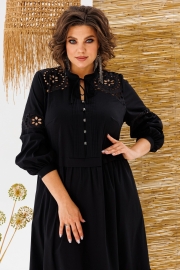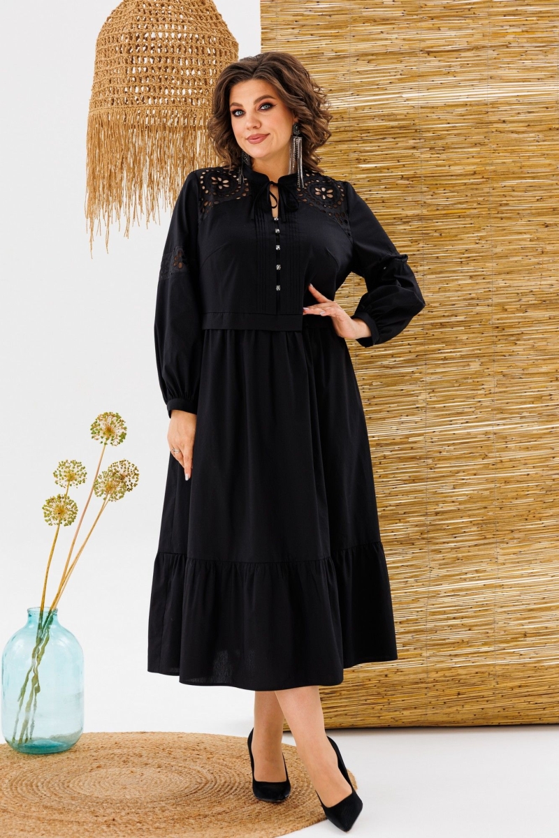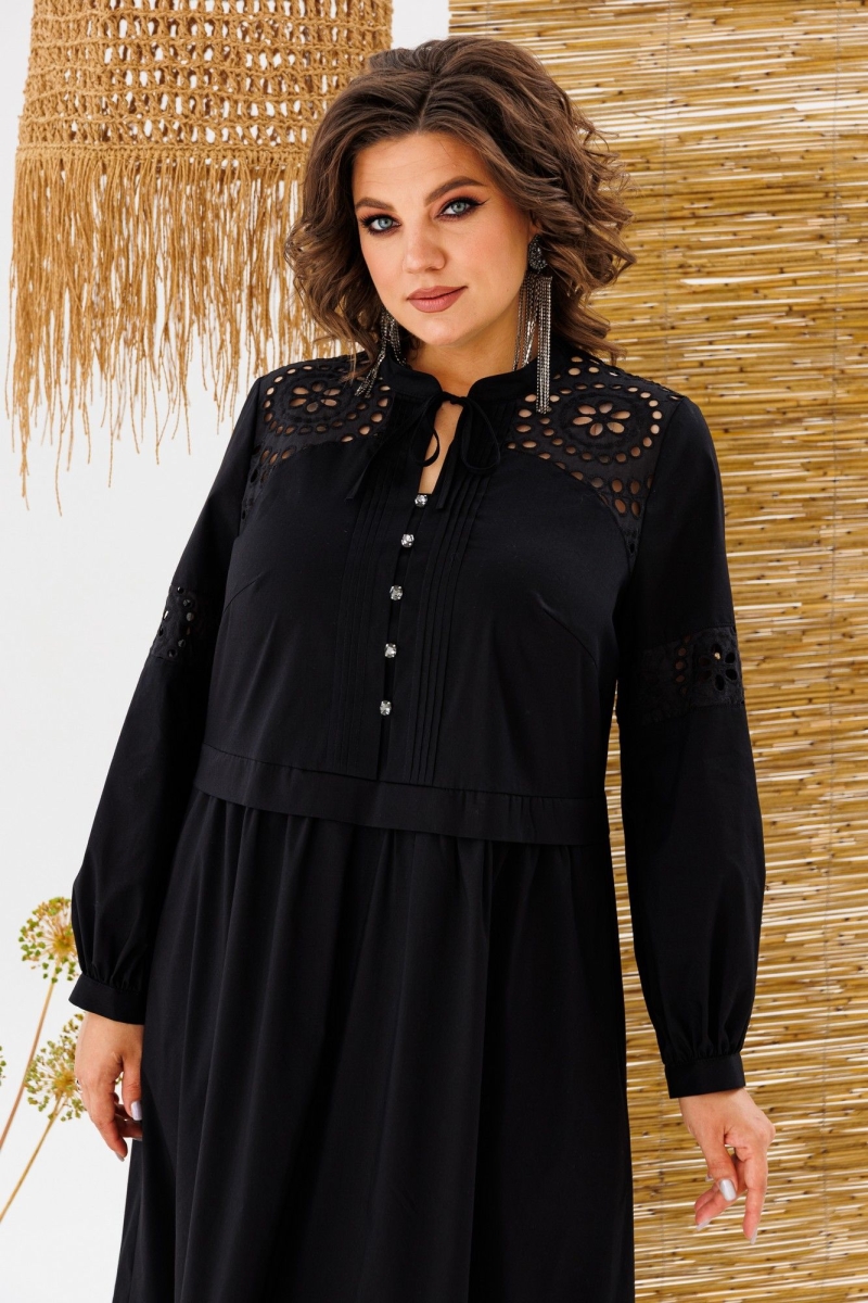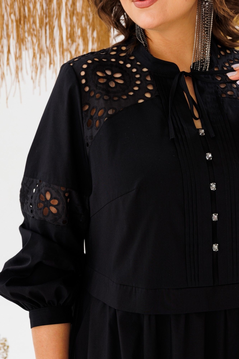 Платье женское, предназначено для повседневной носки. Платье женское, отрезное по линии талии, расширенное к низу, длиной до нижней части икры. Верхняя часть переда с 2-мя притачными кокетками из отделочной ткани, с 2-мя нагрудными вытачками, с 2-мя притачными вертикальными планками, декоративными 4-мя защипами шириной 0,6 см, зафиксированными между собой 5-ю пришивными стразами. Нижняя часть переда с 2-мя караманами в боковых швах, со сборкой по верхнему срезу. Верхняя часть спинки с настрочной кокеткой из отделочной ткани; нижняя часть со сборкой по верхнему срезу. Шов соединения верхней и нижней частей, платья с втачной отлётной планкой. Низ платья с притачным карманом с лёгкой сборкой по верхнему срезу. Горловина круглая с втачной стойкой, с 2-мя завязками. Рукав втачной, одно шовный, длинный, по низу со сборкой с притачной манжетой с застёжкой на 1-ну обмётанную петлю и 1-ну пришивную пуговицу. Рукав с горизонтальным подрезом над линией уровня локтя с декоративной вставкой из отделочной ткани. Платье с плечевыми накладками. Длина спинки платья 123 см, длина рукава 61 см, ширина плеча 13 см.