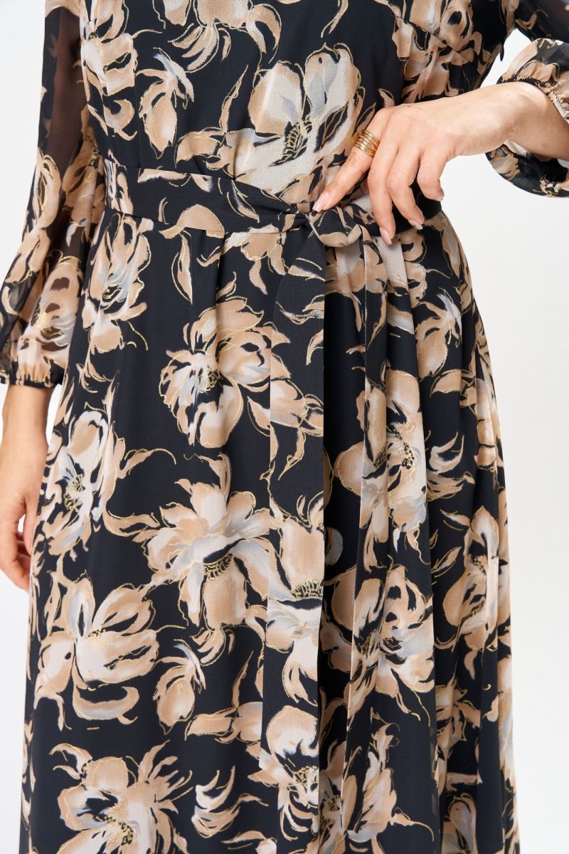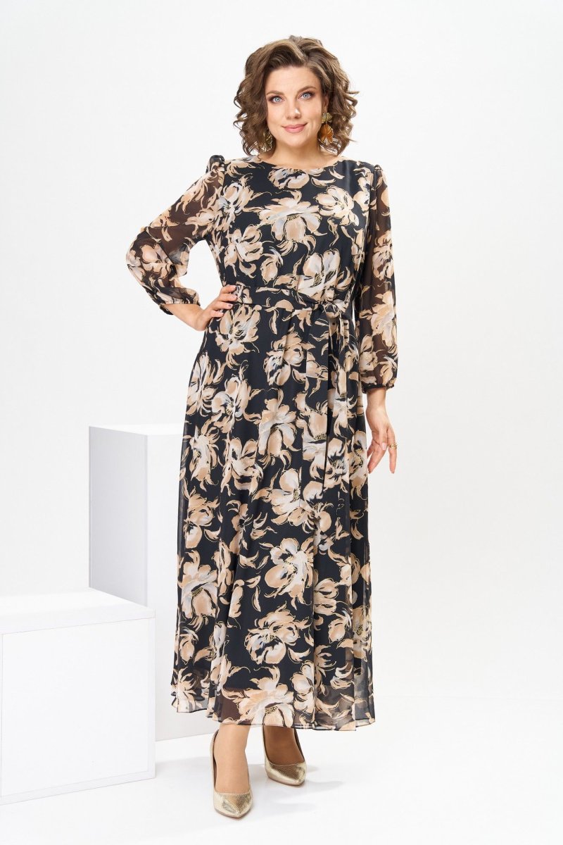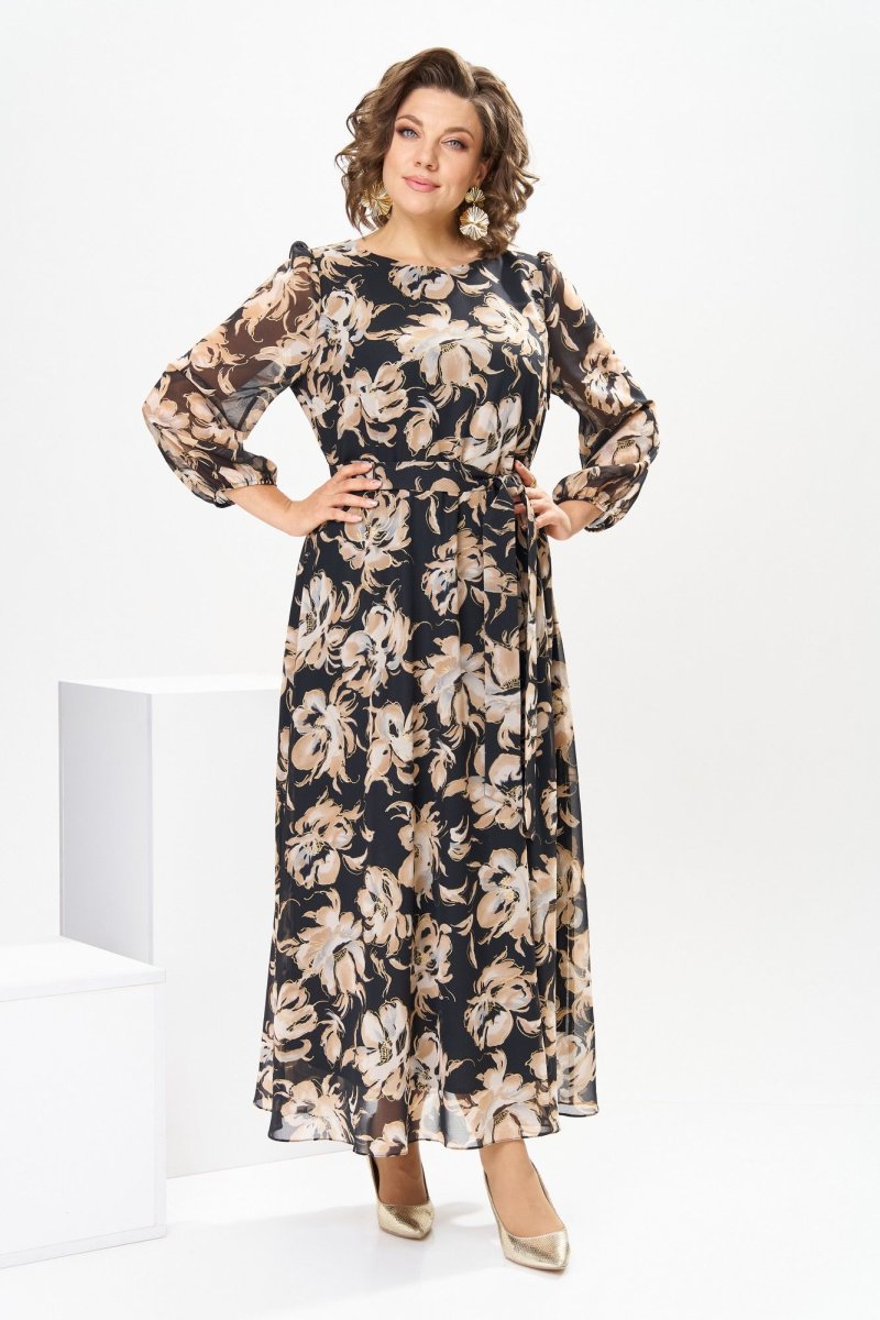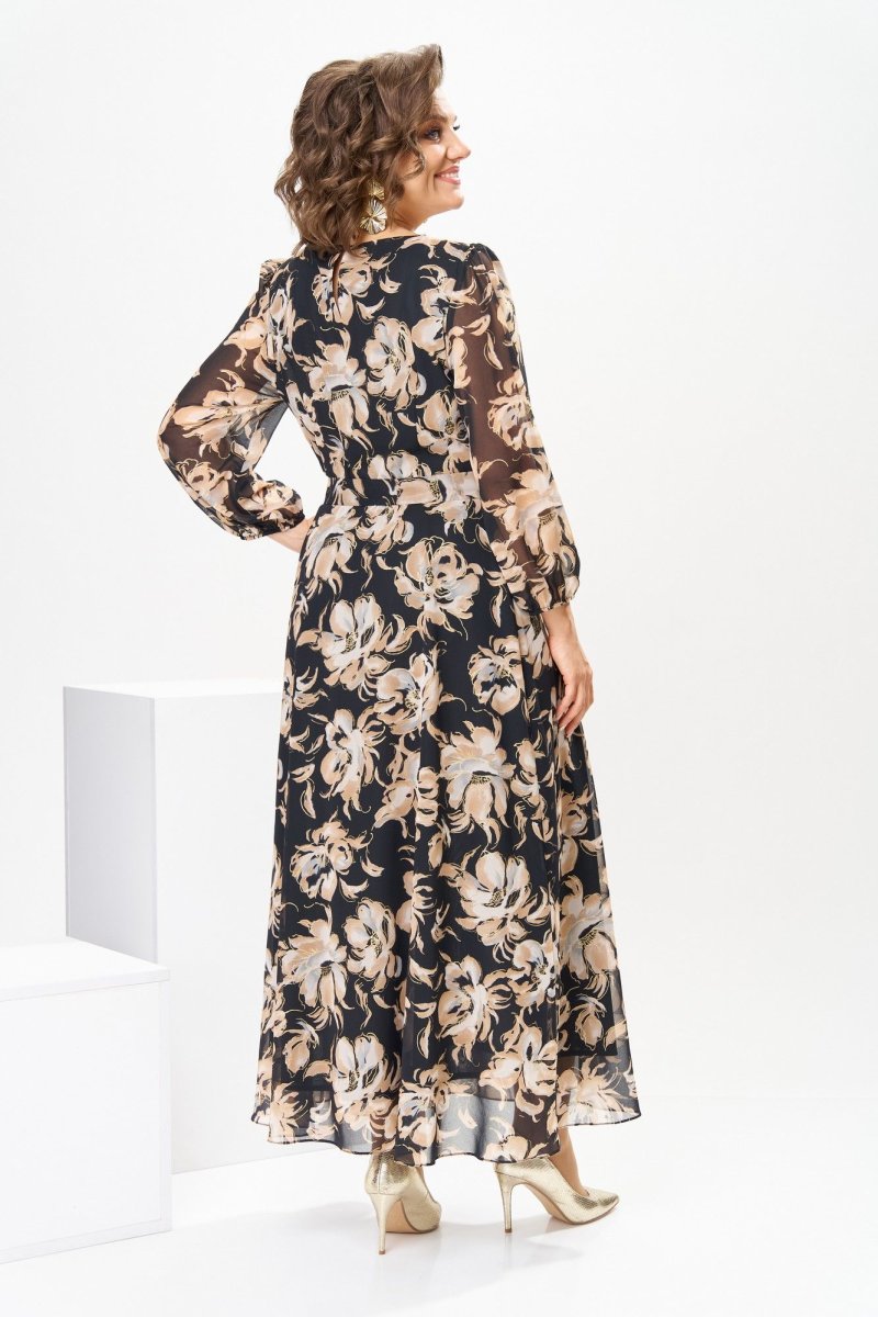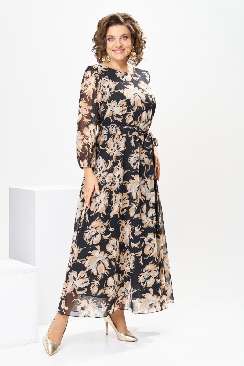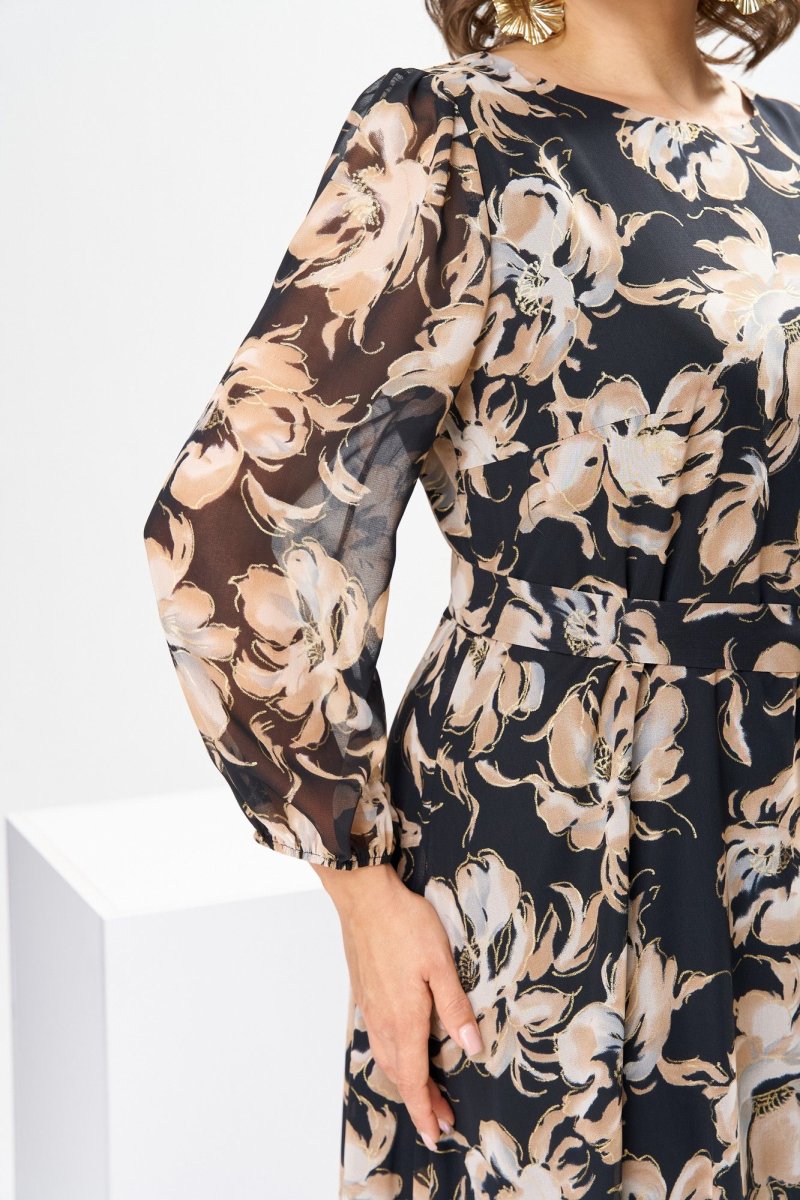 Платье женское относится к нарядной торжественной одежде. Платье женское отрезное по линии талии, расширенное к низу, длинное. Верхняя часть переда с 2-мя нагрудными вытачками, нижняя часть цельнокроеная. Верхняя часть спинки с 2-мя таллиевыми вытачками, с обработанным разрезом по головине, фиксирующимся на 1-ну навесную петлю и 1-ну пришивную пуговицу; нижняя часть спинки цельнокроеная. Горловина круглая, обточная, без воротника. Рукав втачной одно шовный, длинный. Рукав со сборкой по окату. Низ рукава собран на эластичную тесьму. Платье на подкладке. Платье без плечевых накладок. К платью прилагается съёмный пояс. Длина спинки платья 137 см, длина рукава 55 см.