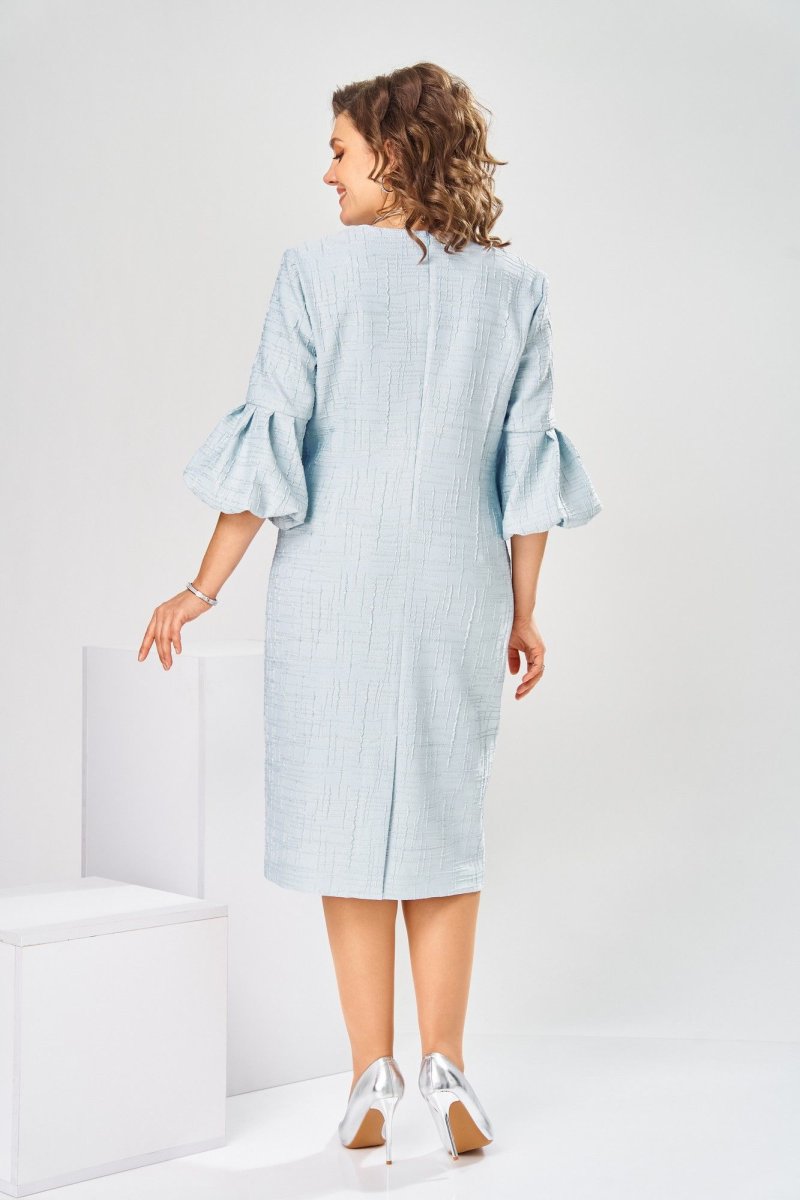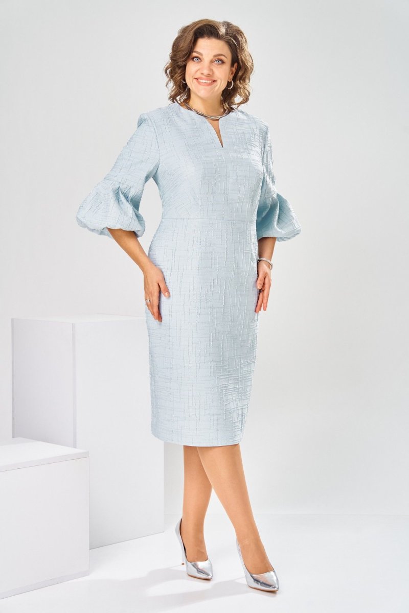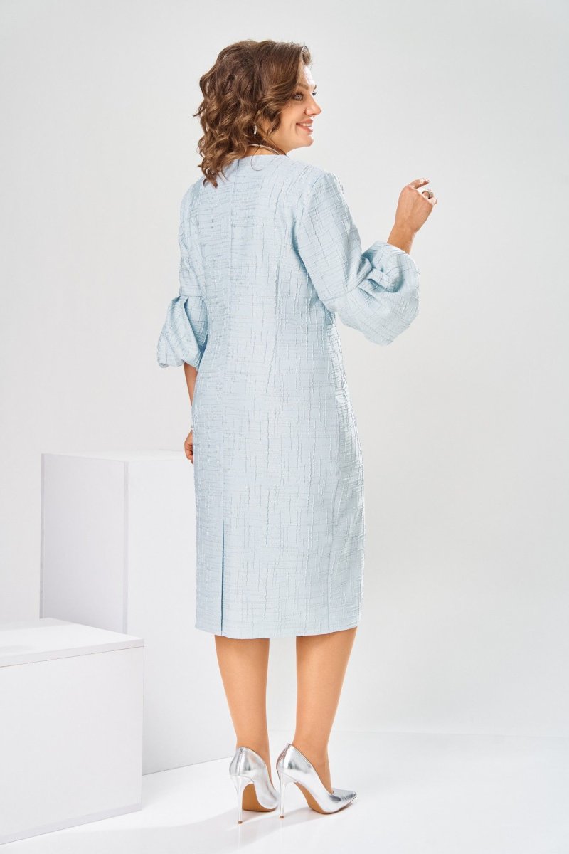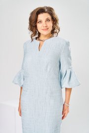 Платье женское, относится к торжественной нарядной одежде. Платье женское, полу прилегающего силуэта, длиной ниже колена. Перед отрезной по линии талии. Верхняя часть переда со средним швом и 2-мя таллиевыми вытачками, нижняя часть с 2-мя таллиевыми вытачками. Спинка с 2-мя таллиевыми вытачками и средним швом, заканчивающимся шлицей. Горловина фигурная, обточная, без воротника. Застёжка на потайную тесьму-молнию в среднем шве спинки. Рукав втачной, одно шовный, длиной 3/4, с горизонтальным разрезом, нижняя часть рукава с 5-ю односторонними складками, со сборкой по низу, низ обточной. Платье на подкладке с плечевыми накладками. Длина спинки платье 111 см, длина рукава 45 см.