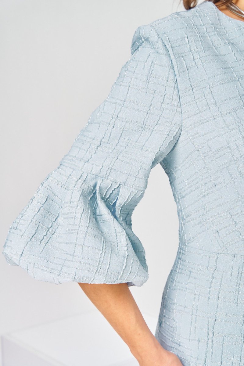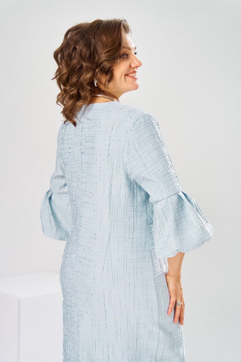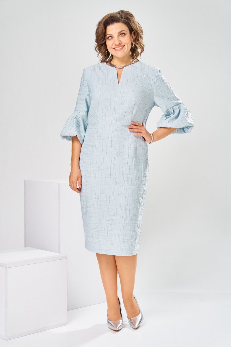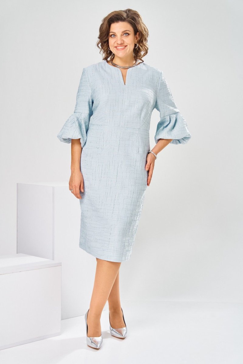 Платье женское, относится к торжественной нарядной одежде. Платье женское, полу прилегающего силуэта, длиной ниже колена. Перед отрезной по линии талии. Верхняя часть переда со средним швом и 2-мя таллиевыми вытачками, нижняя часть с 2-мя таллиевыми вытачками. Спинка с 2-мя таллиевыми вытачками и средним швом, заканчивающимся шлицей. Горловина фигурная, обточная, без воротника. Застёжка на потайную тесьму-молнию в среднем шве спинки. Рукав втачной, одно шовный, длиной 3/4, с горизонтальным разрезом, нижняя часть рукава с 5-ю односторонними складками, со сборкой по низу, низ обточной. Платье на подкладке с плечевыми накладками. Длина спинки платье 111 см, длина рукава 45 см.