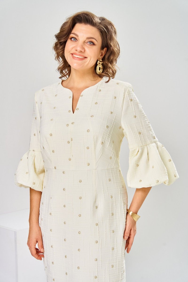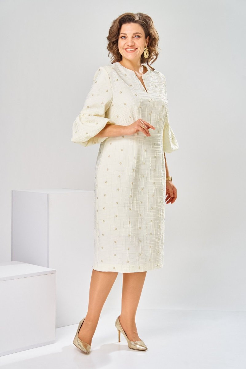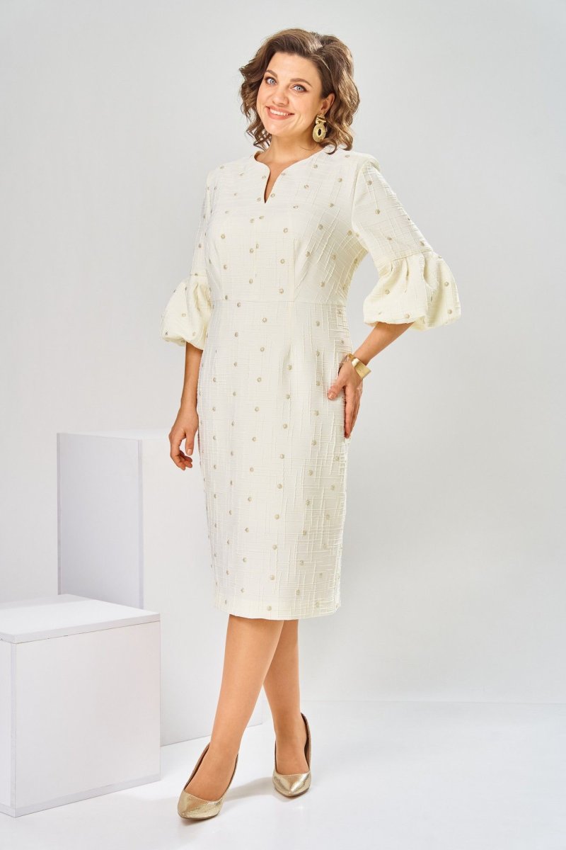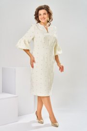 Платье женское, относится к торжественной нарядной одежде. Платье женское, полу прилегающего силуэта, длиной ниже колена. Перед отрезной по линии талии. Верхняя часть переда со средним швом и 2-мя таллиевыми вытачками, нижняя часть с 2-мя таллиевыми вытачками. Спинка с 2-мя таллиевыми вытачками и средним швом, заканчивающимся шлицей. Горловина фигурная, обточная, без воротника. Застёжка на потайную тесьму-молнию в среднем шве спинки. Рукав втачной, одно шовный, длиной 3/4, с горизонтальным разрезом, нижняя часть рукава с 5-ю односторонними складками, со сборкой по низу, низ обточной. Платье на подкладке с плечевыми накладками. Длина спинки платье 111 см, длина рукава 45 см.