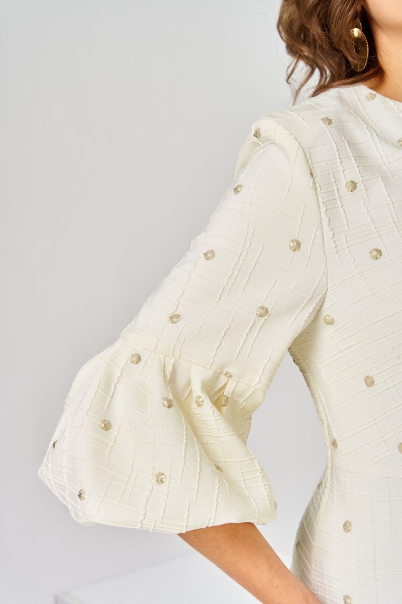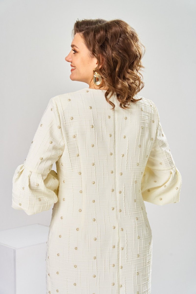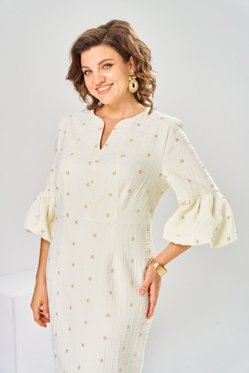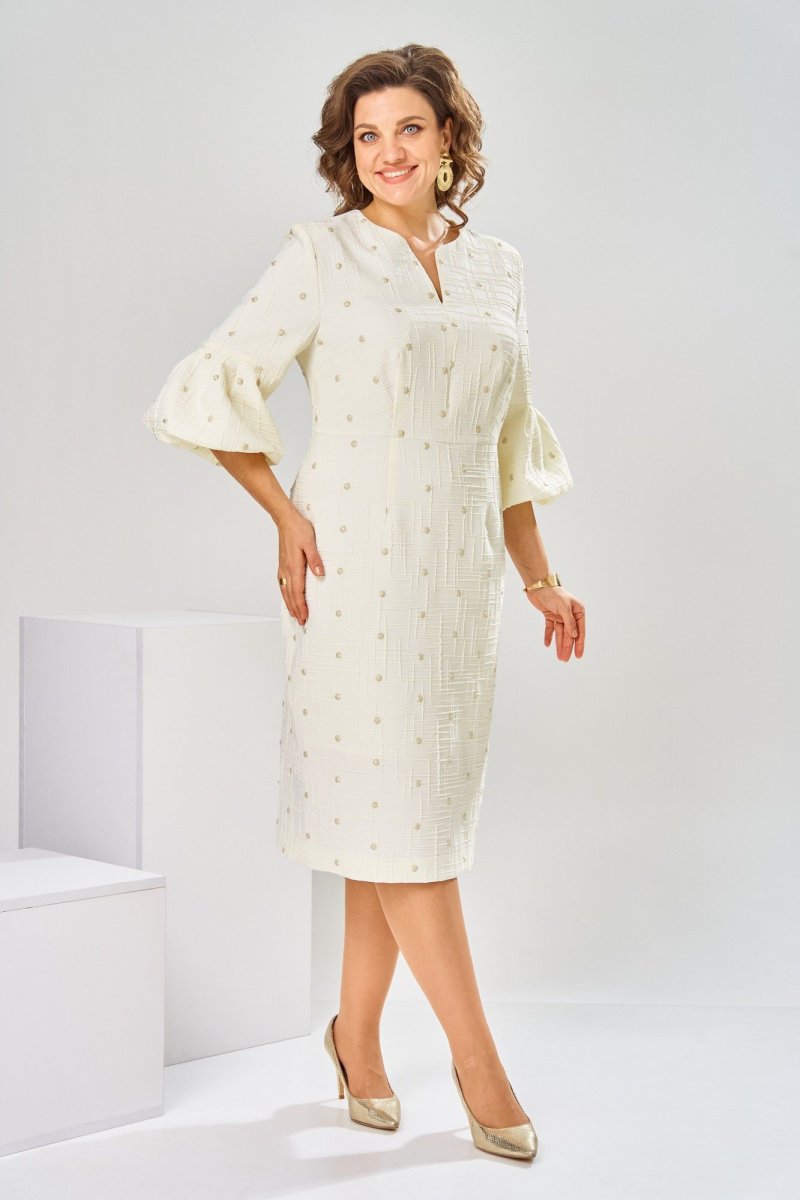 Платье женское, относится к торжественной нарядной одежде. Платье женское, полу прилегающего силуэта, длиной ниже колена. Перед отрезной по линии талии. Верхняя часть переда со средним швом и 2-мя таллиевыми вытачками, нижняя часть с 2-мя таллиевыми вытачками. Спинка с 2-мя таллиевыми вытачками и средним швом, заканчивающимся шлицей. Горловина фигурная, обточная, без воротника. Застёжка на потайную тесьму-молнию в среднем шве спинки. Рукав втачной, одно шовный, длиной 3/4, с горизонтальным разрезом, нижняя часть рукава с 5-ю односторонними складками, со сборкой по низу, низ обточной. Платье на подкладке с плечевыми накладками. Длина спинки платье 111 см, длина рукава 45 см.