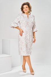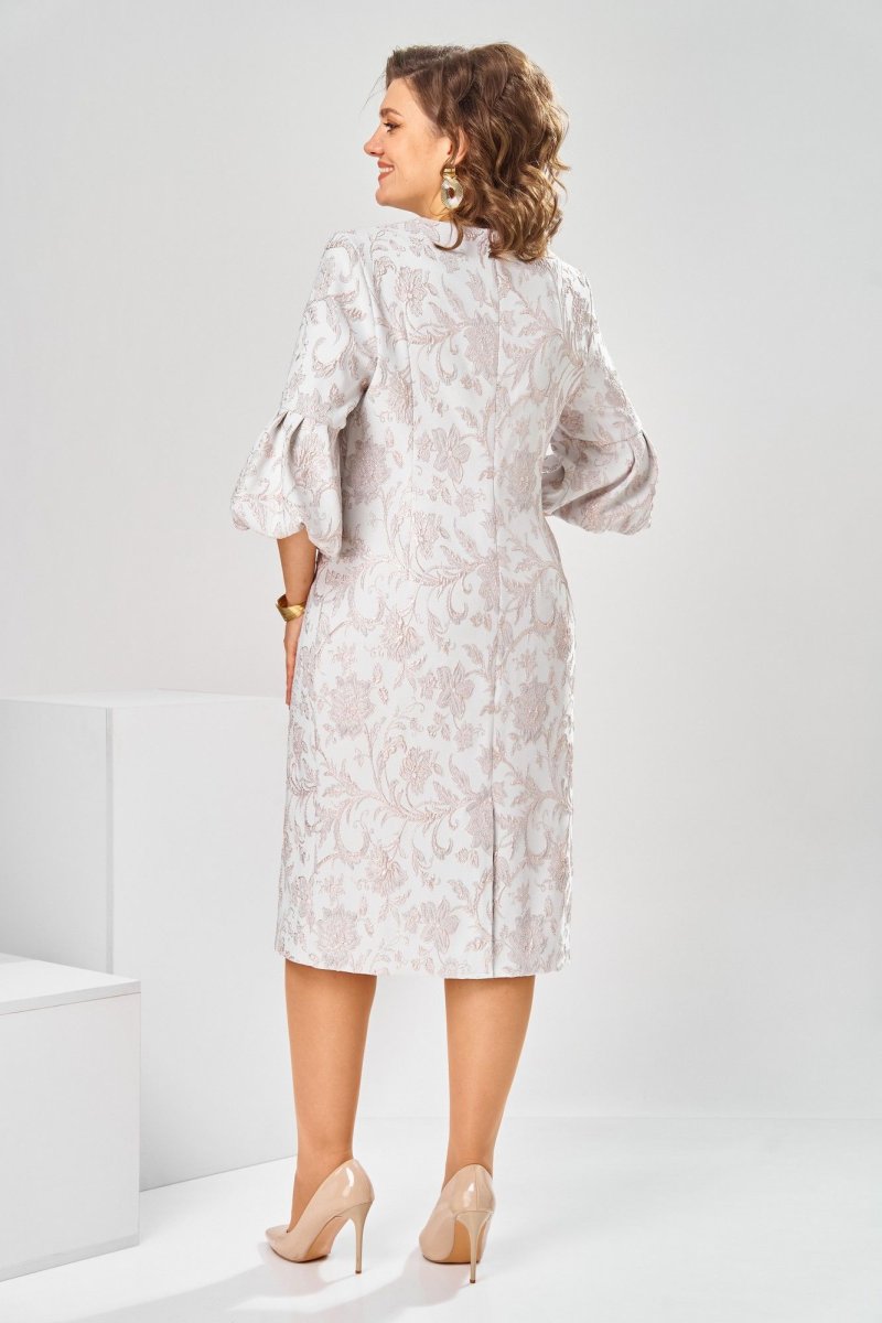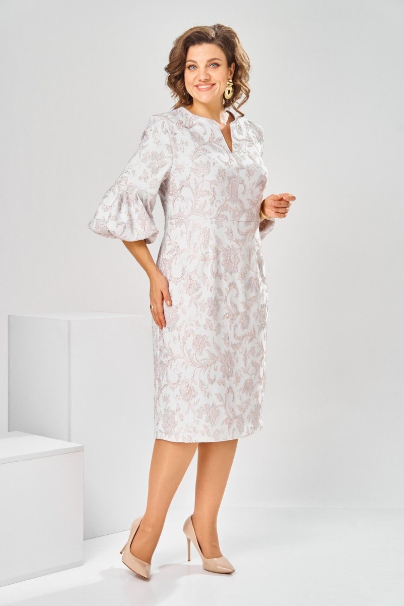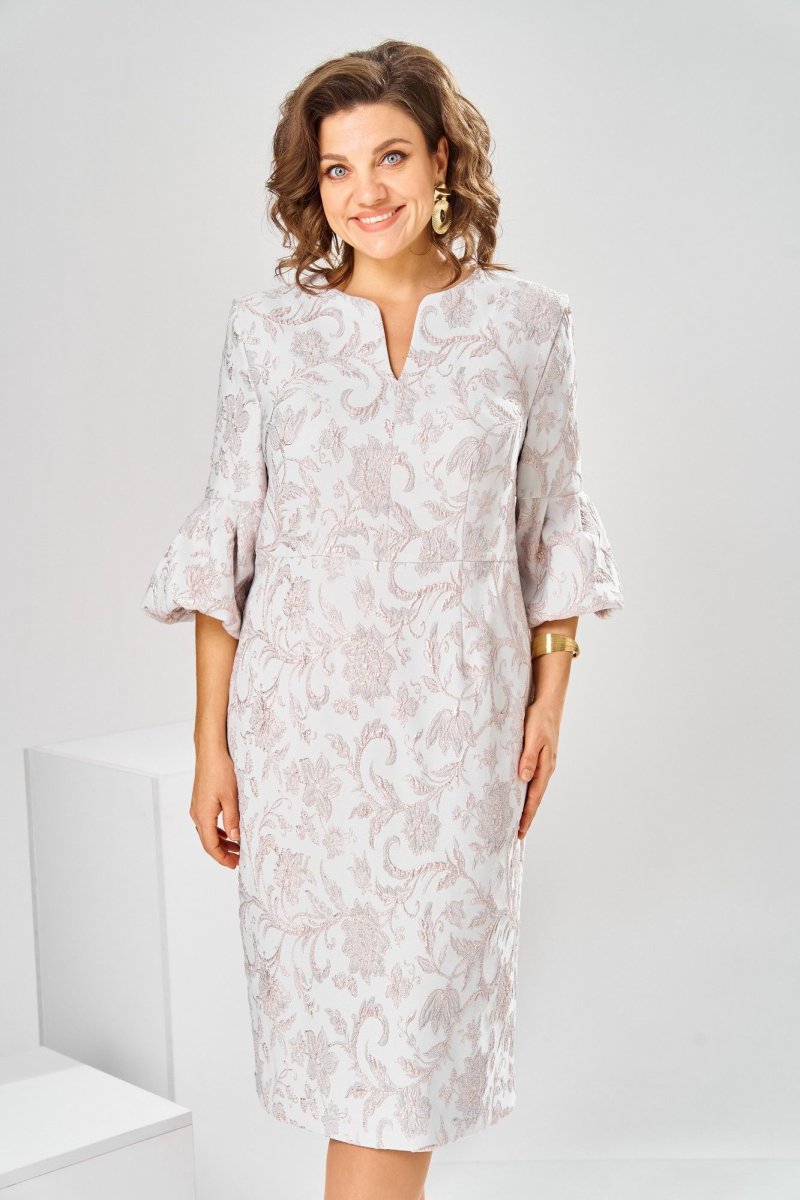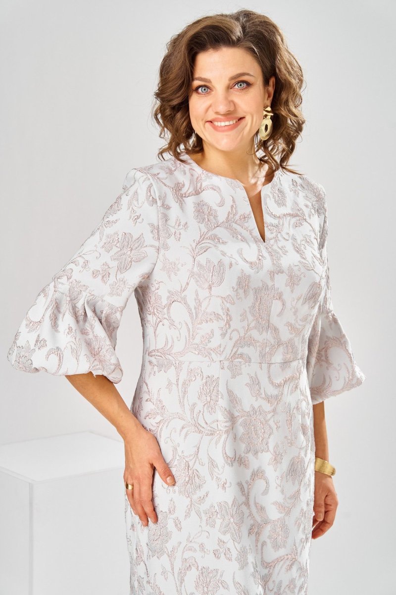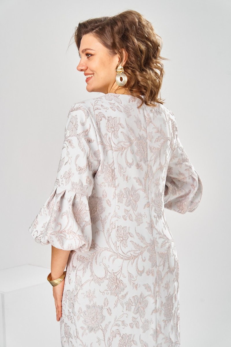 Платье женское, относится к торжественной нарядной одежде. Платье женское, полу прилегающего силуэта, длиной ниже колена. Перед отрезной по линии талии. Верхняя часть переда со средним швом и 2-мя таллиевыми вытачками, нижняя часть с 2-мя таллиевыми вытачками. Спинка с 2-мя таллиевыми вытачками и средним швом, заканчивающимся шлицей. Горловина фигурная, обточная, без воротника. Застёжка на потайную тесьму-молнию в среднем шве спинки. Рукав втачной, одно шовный, длиной 3/4, с горизонтальным разрезом, нижняя часть рукава с 5-ю односторонними складками, со сборкой по низу, низ обточной. Платье на подкладке с плечевыми накладками. Длина спинки платье 111 см, длина рукава 45 см.