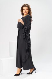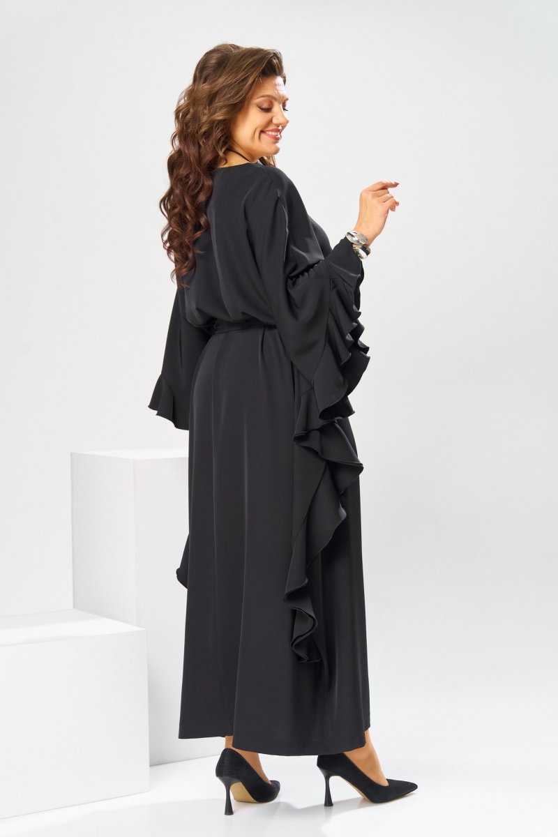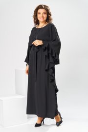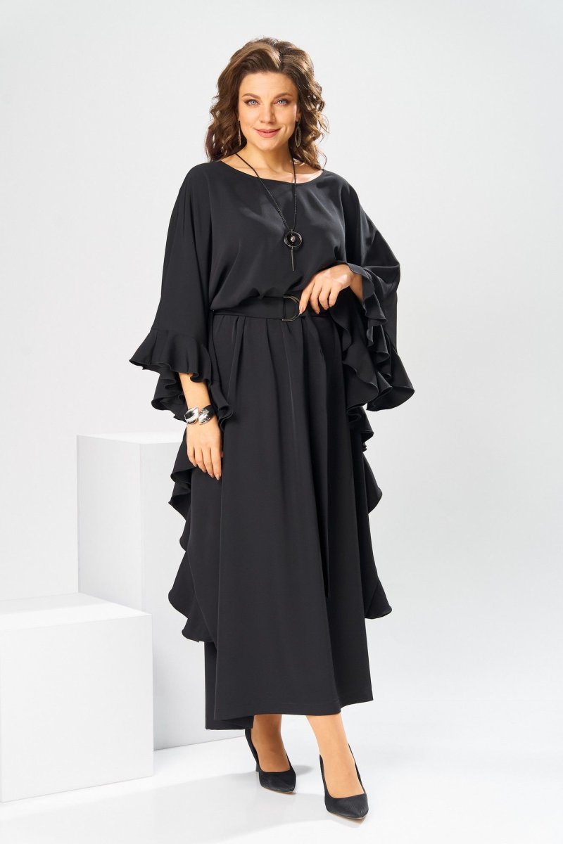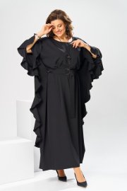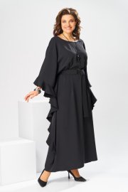 Платье женское, относится к нарядной торжественной одежде. Платье пончо свободного кроя, длинное. Перед цельнокроеный. Спинка со средним швом, вверху с разрезом, фиксирующимся по горловине на 1-ну навесную петлю и 1-ну пришивную пуговицу. Горловина круглая, обточная, без воротника, по переду горловины отделочная строчка 0,6 см. Рукав цельнокроеный удлинённый. Низ рукава и боковые швы декорированы приточной оборкой. По боковым швам зафиксирован уровень пройм и место расположения петель на уровне линии талии отделочными строчками. К платью прилагается съёмный пояс с пряжкой, фиксируемые на платье в петли на уровне линии талии. Платье без плечевых накладок. Длина спинки платья 132 см, ширина на уровне глубины проймы 66 см, ширина по линии талии 66 см, ширина плеча+длина рукава 56,5 см.