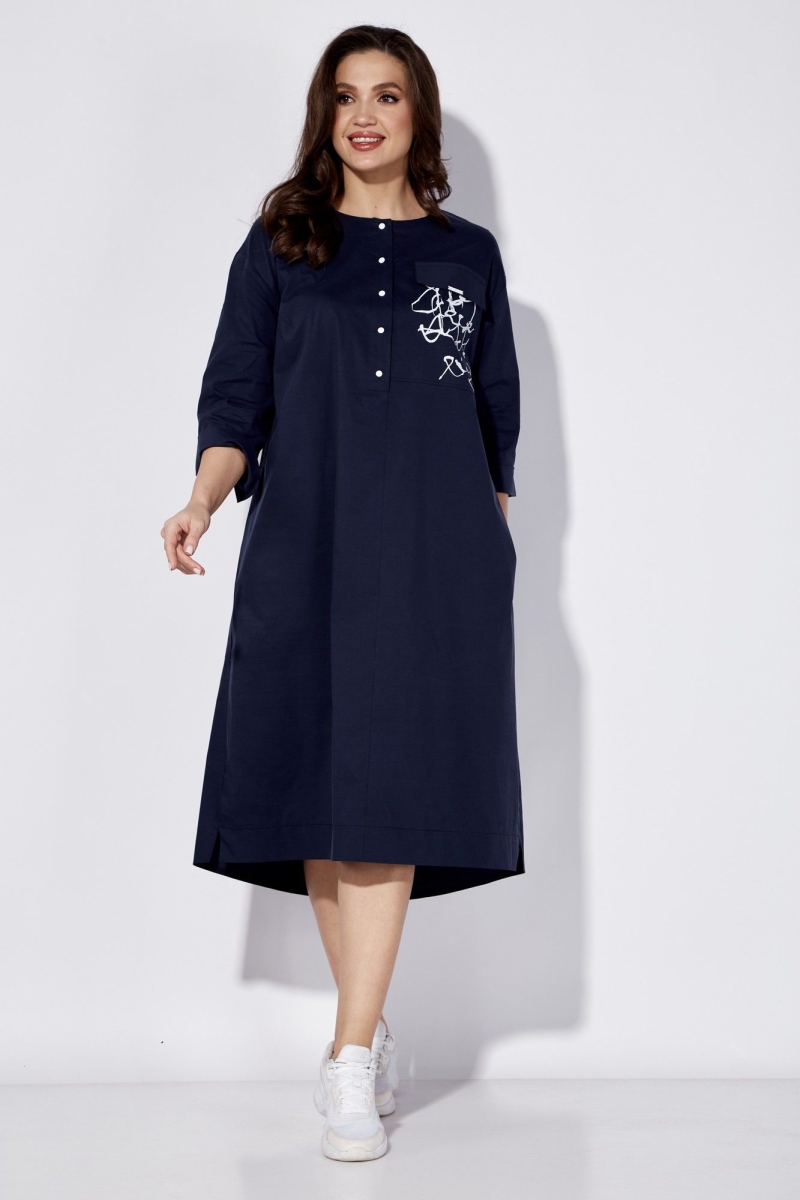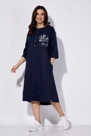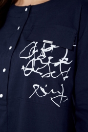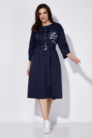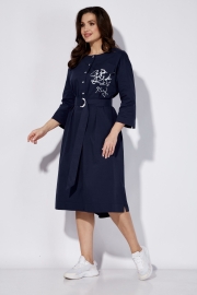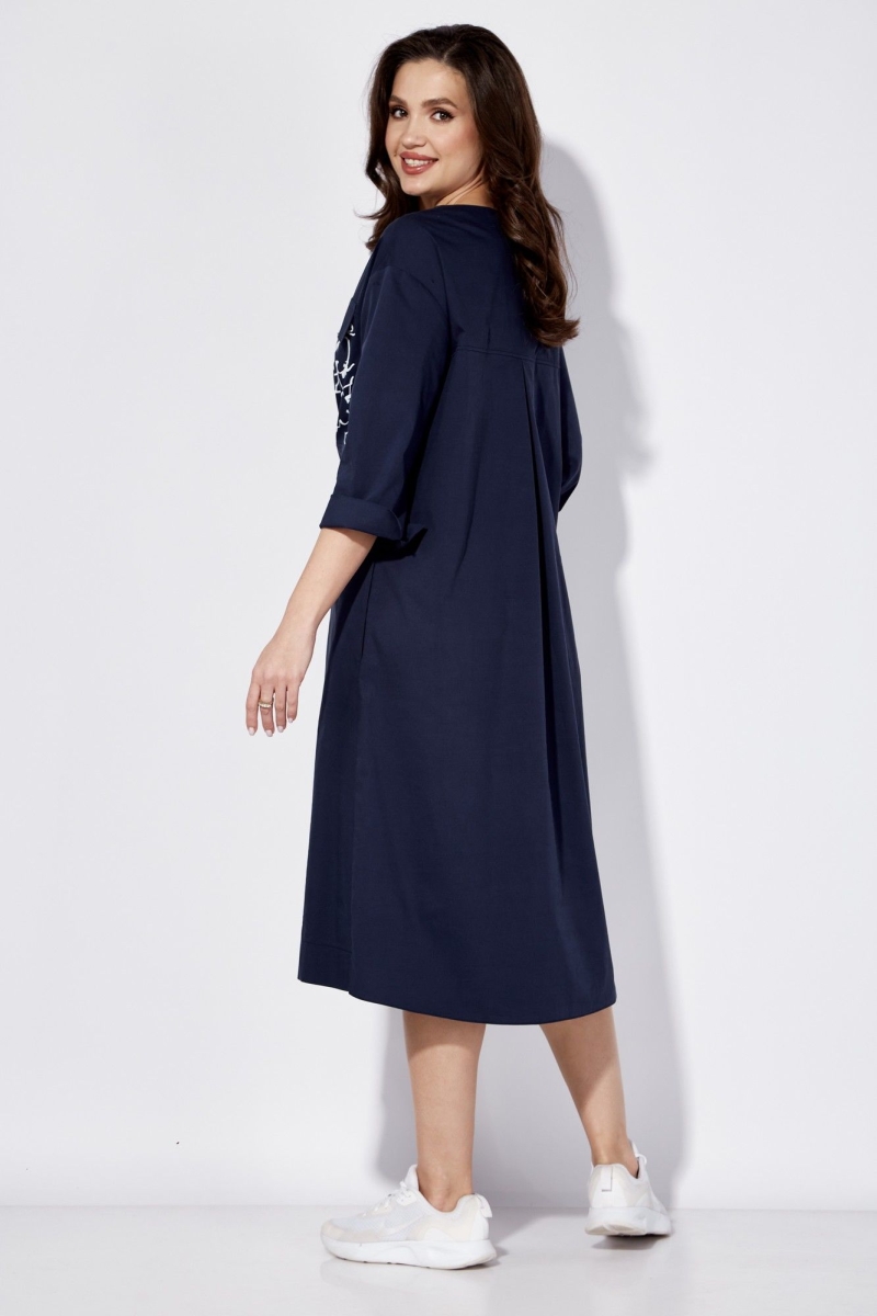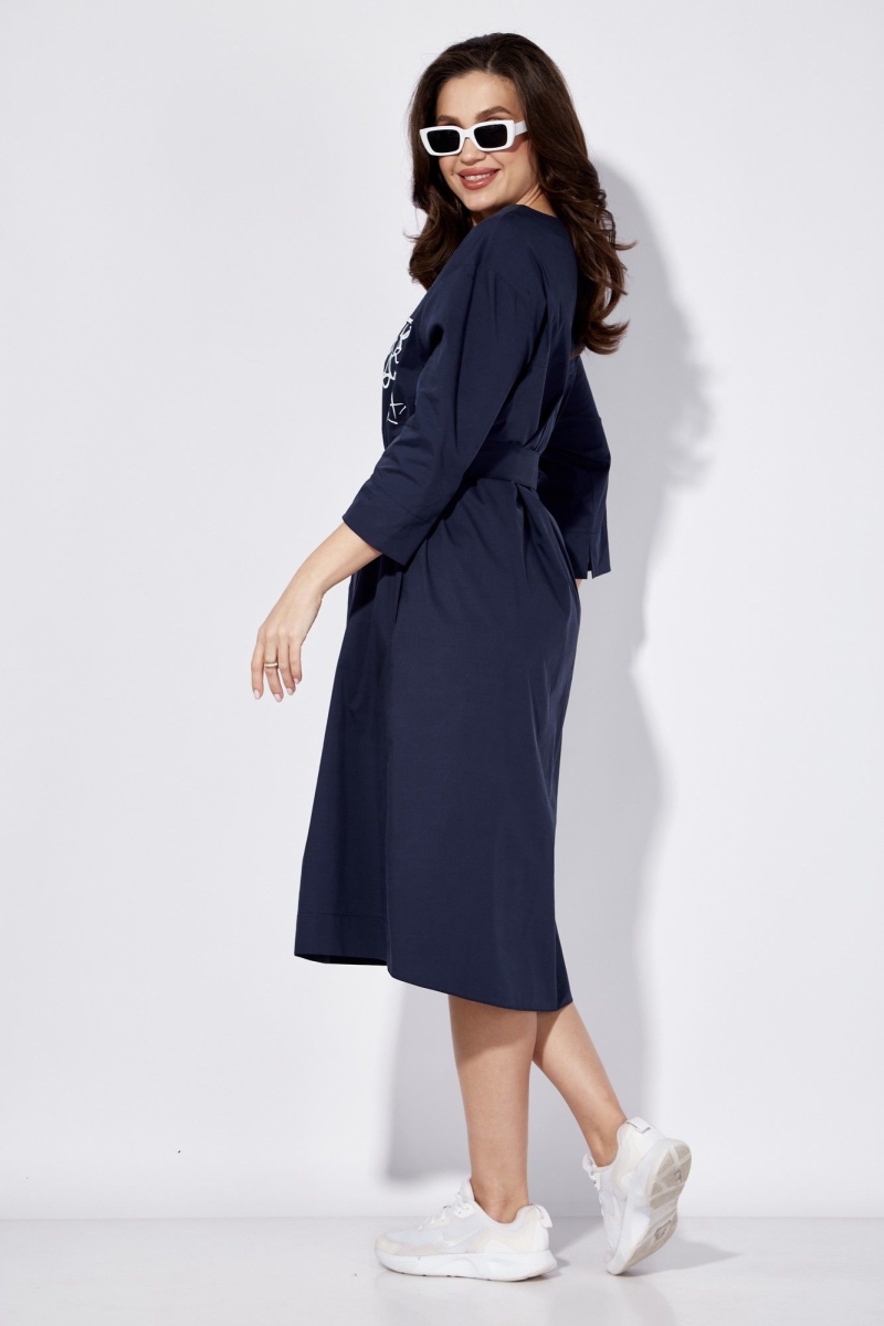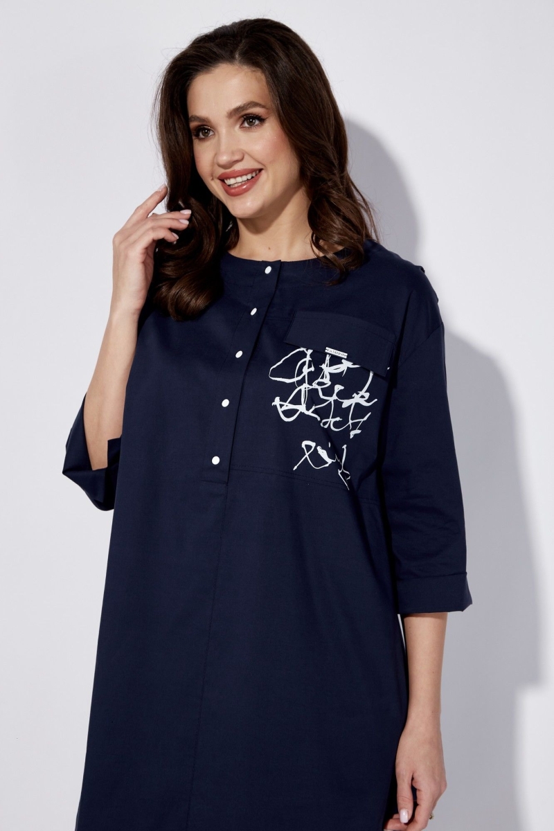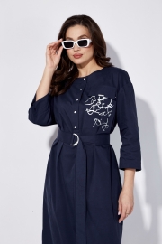 Платье женское, свободного силуэта. Рукав со спущенной линией плеча длинной 3/4 с разрезом по локтевому шву. По переду центральный шов с застежкой на планку с кнопками до линии талии. Вырез горловины круглой формы. Левая полочка задекорирована всавкой с принтом и отделочным клапаном. Карманы в боковых швах. По спинке кокетка и встречная складка. По низу небольшие разрезы по бокам. Сзади низ чуть удлиненный. Талию подчеркивает съемный пояс.
