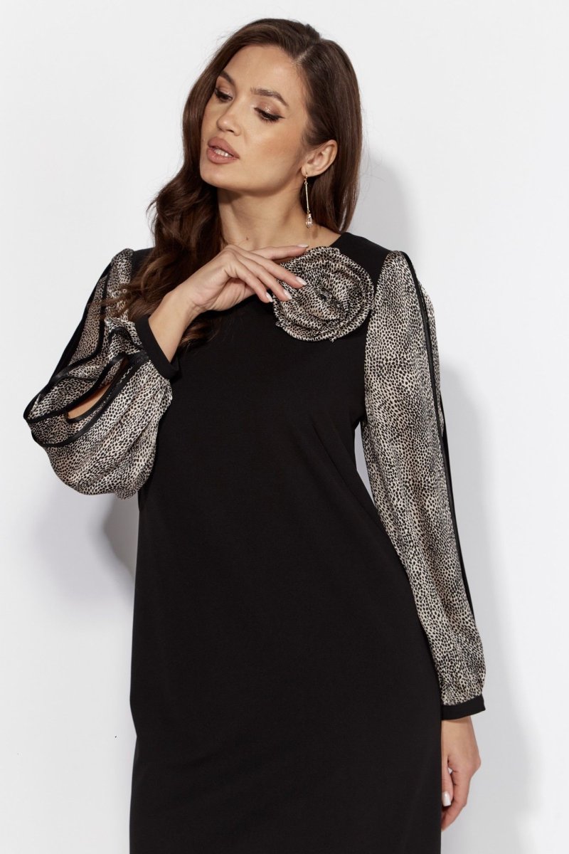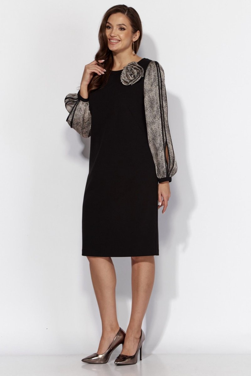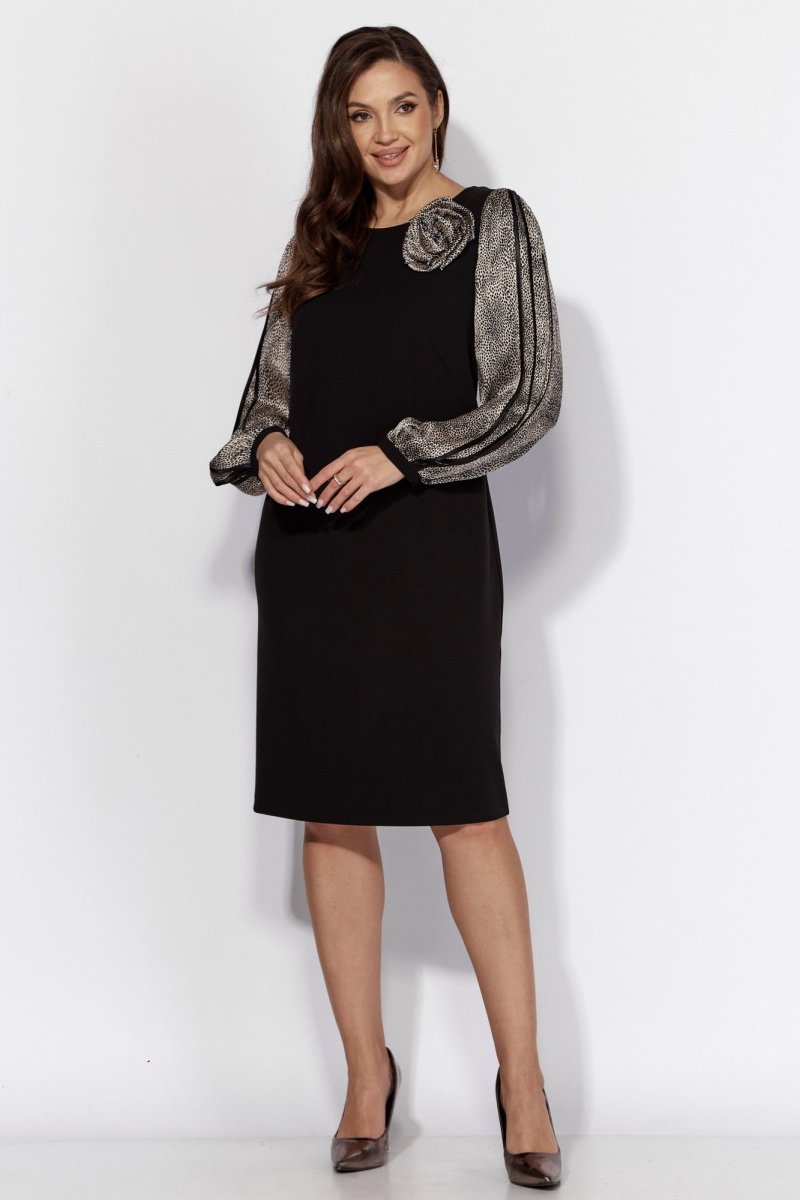 Платье женское, полуприлегающего силуэта с длинным втачным рукавом. Низ рукава присобран на манжету. По центру рукава вертикальные подрезы, оформленные контрастной окантовкой. По переду наклонные нагрудные вытачки. Вырез горловины круглой формы. Декором служит съемная брошь-цветок.По спинке средний шов с застежкой на потайную тесьму "молния" и разрезом по низу.