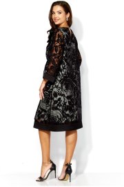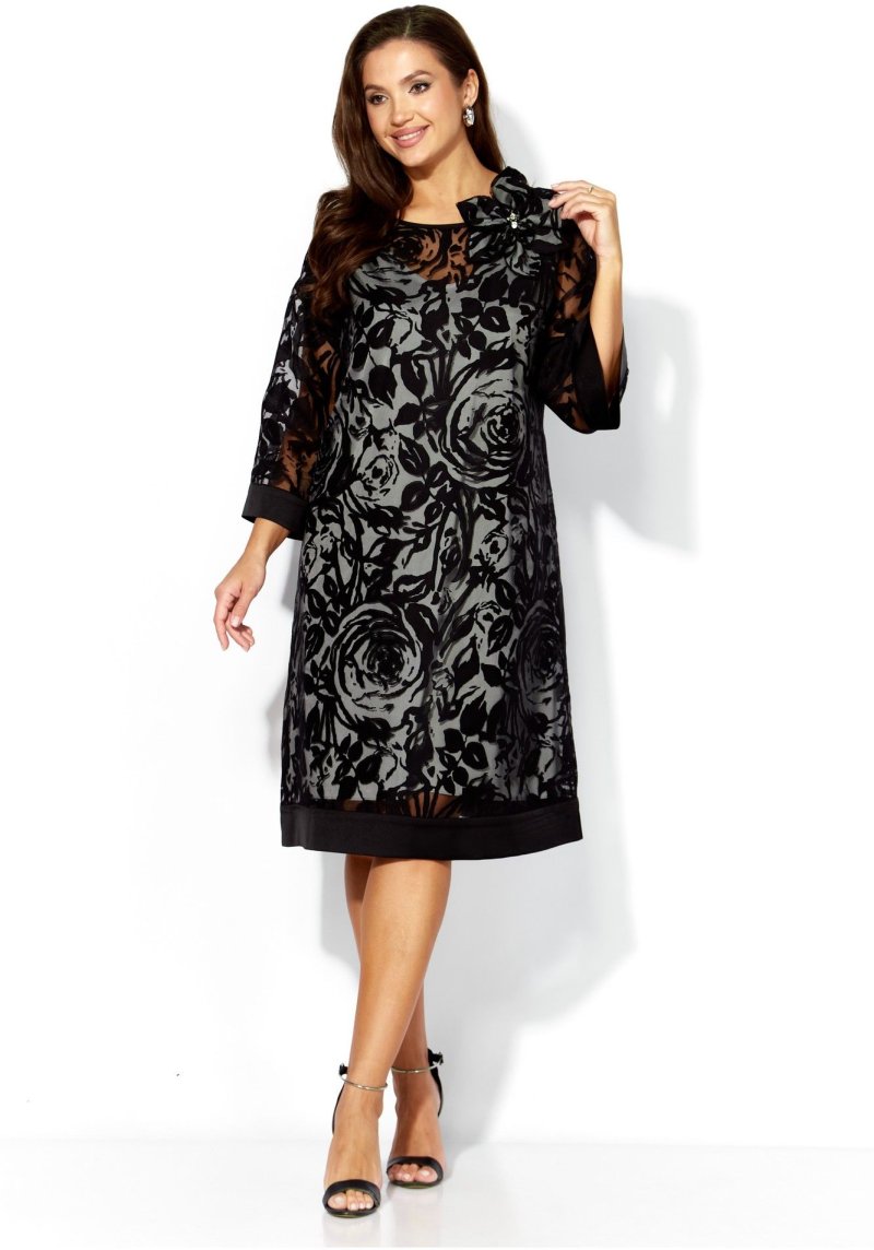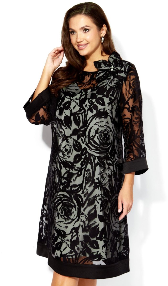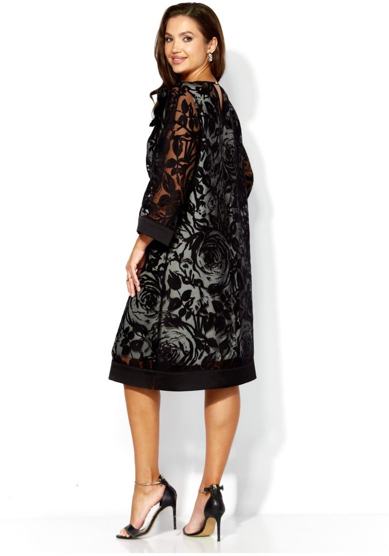 Комплект женский, 2х предметный, состоит из верхнего и нижнего платья. Верхнее платье выполнено из ткани органза. Платье А-силуэта с рукавом длинной 3/4. Рукав со спущенной линией плеча. По низу рукава и платья отделочные планки из атласа. Вырез горловины по переду "лодочка", по спинке фигурный акцентирован атласной бейкой. По спинке декоративная нашивка. Декором служит съемный цветок. Нижнее платье из вискозного атласа А-силуэта с выточками нагрудными, без рукавов. Вырез горловины по переду У-образной формы, закругленный, по спинке острый. По спинке средний шов.