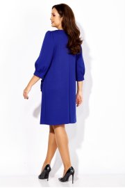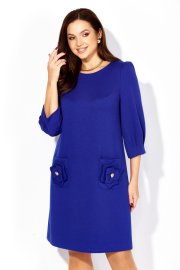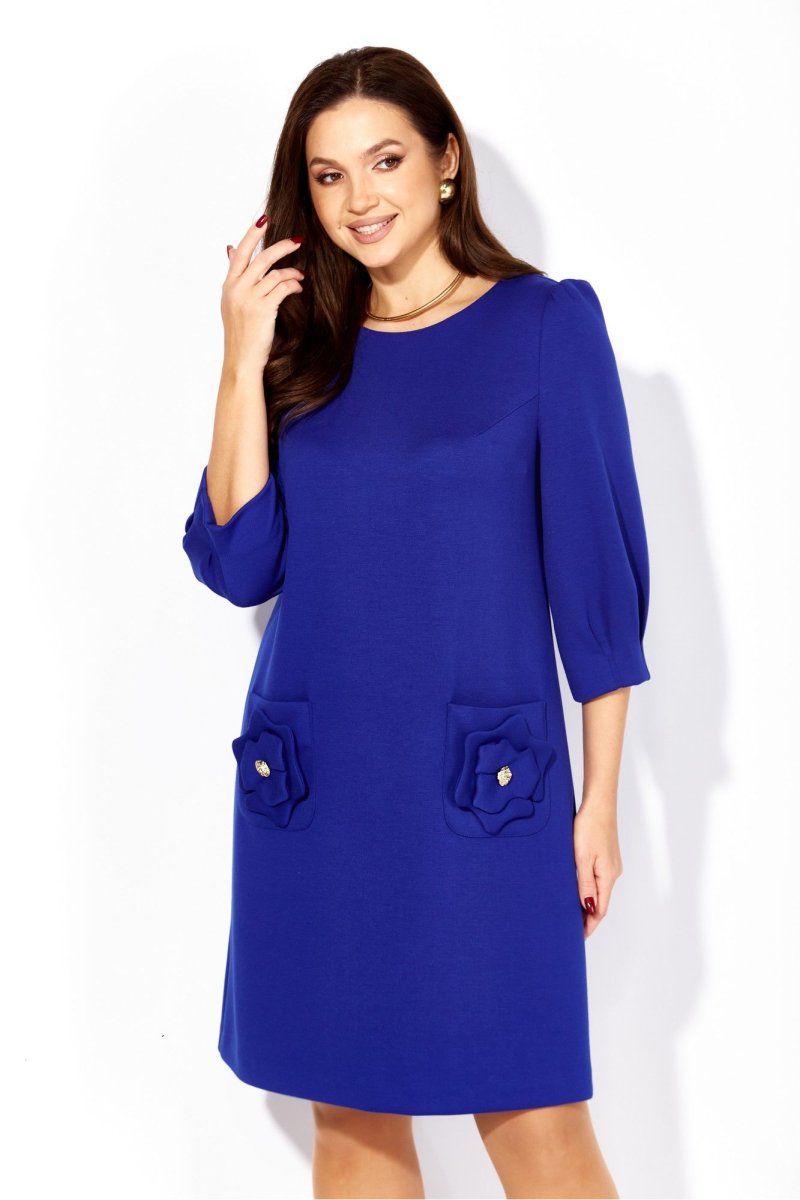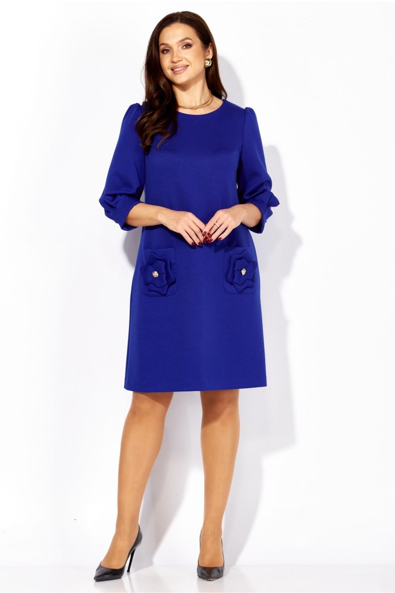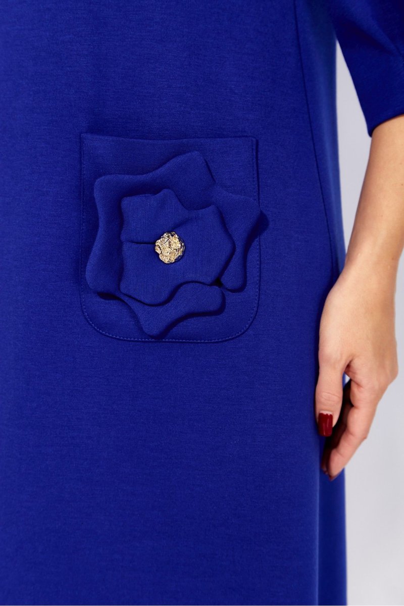 Платье женское, А силуэта, с рукавом длинной 3/4. Рукав втачной, со сборкой по окату, и мягкими складками по низу. По переду нагрудные вытачки. Вырез горловины круглой формы. Карманы накладные, акцентированы стилизированным цветком с декором. По спинке средний шов с отделочной нашивкой сверху.