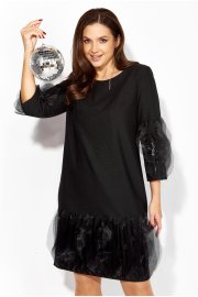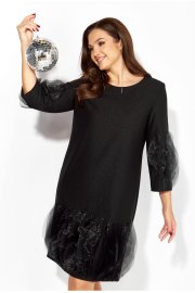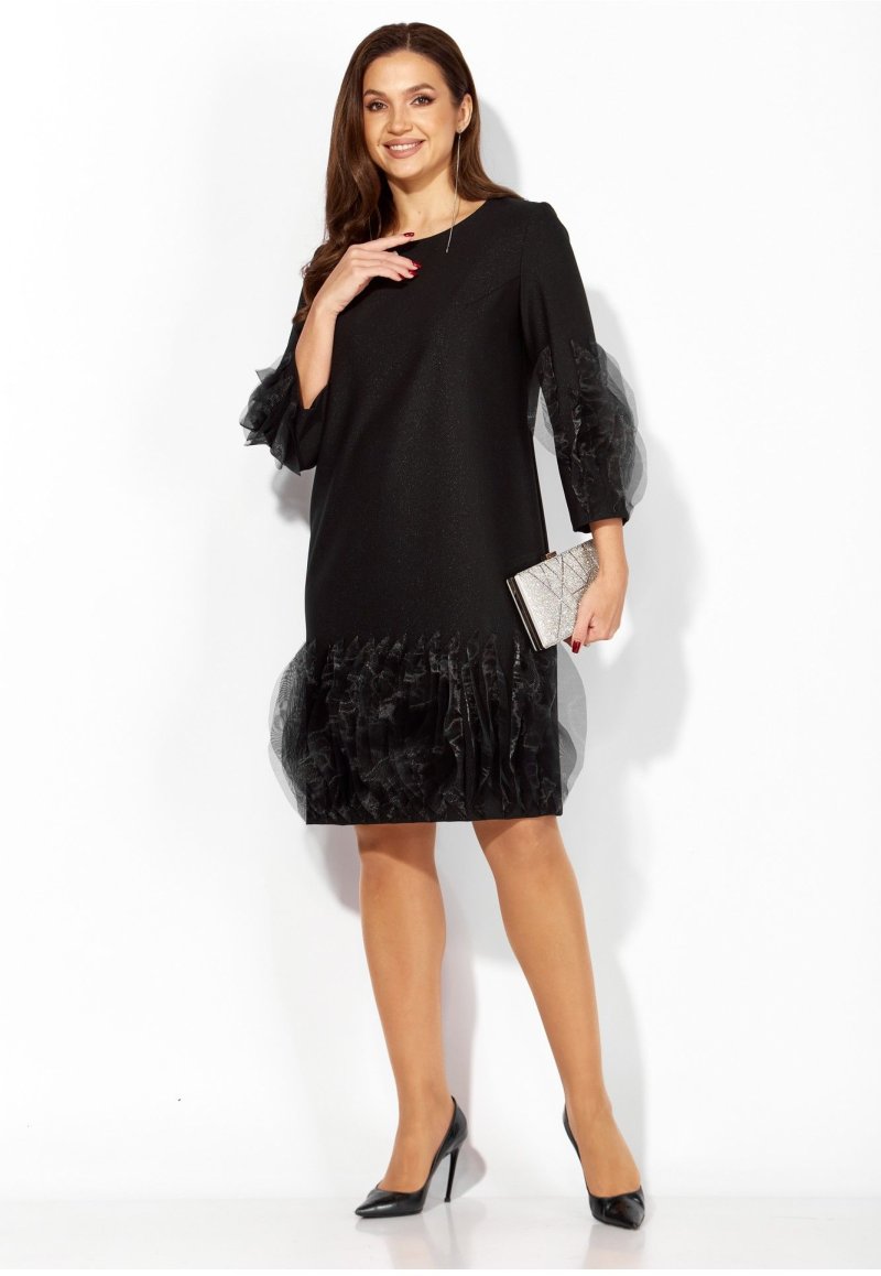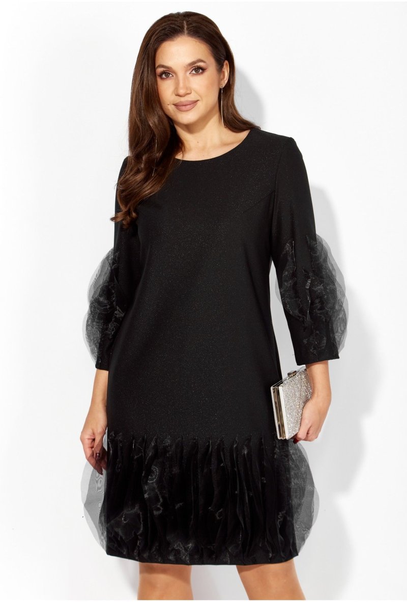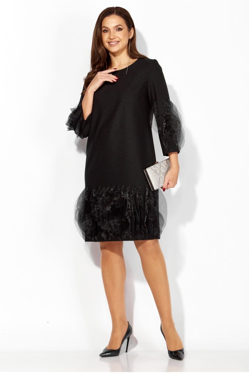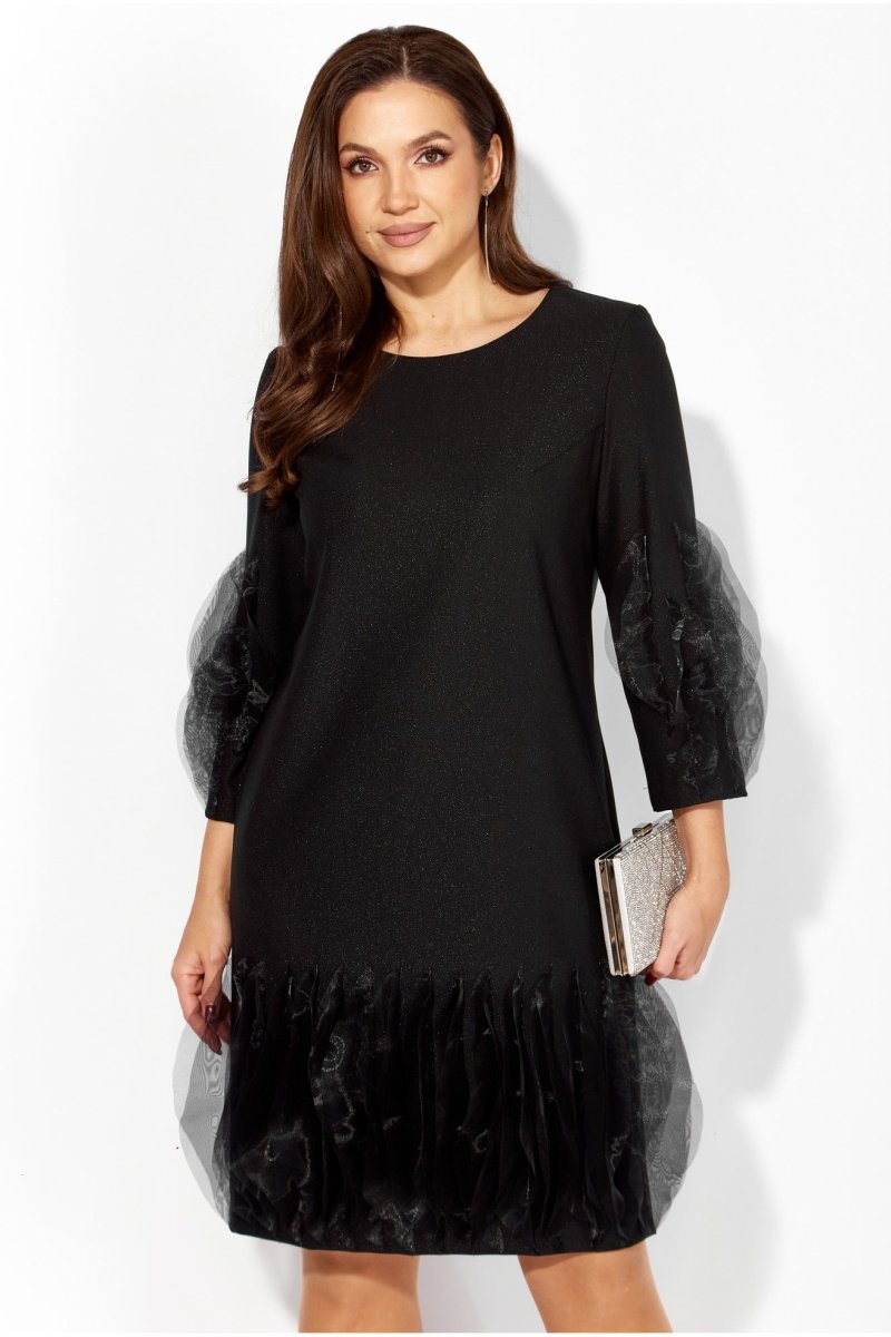 Платье женское, прямого силуэта, выполнено из ткани поливискоза "SHANE" со стрейчем. По переду нагрудные вытачки из пройм. Рукав втачной, длинной 3/4. Низ платья по переду и нижняя часть рукава задекорированы фантазийными элементами ткани из органзы. Вырез горловины круглой формы. По спинке шов и застежка на потайную тесьму "молния"