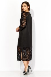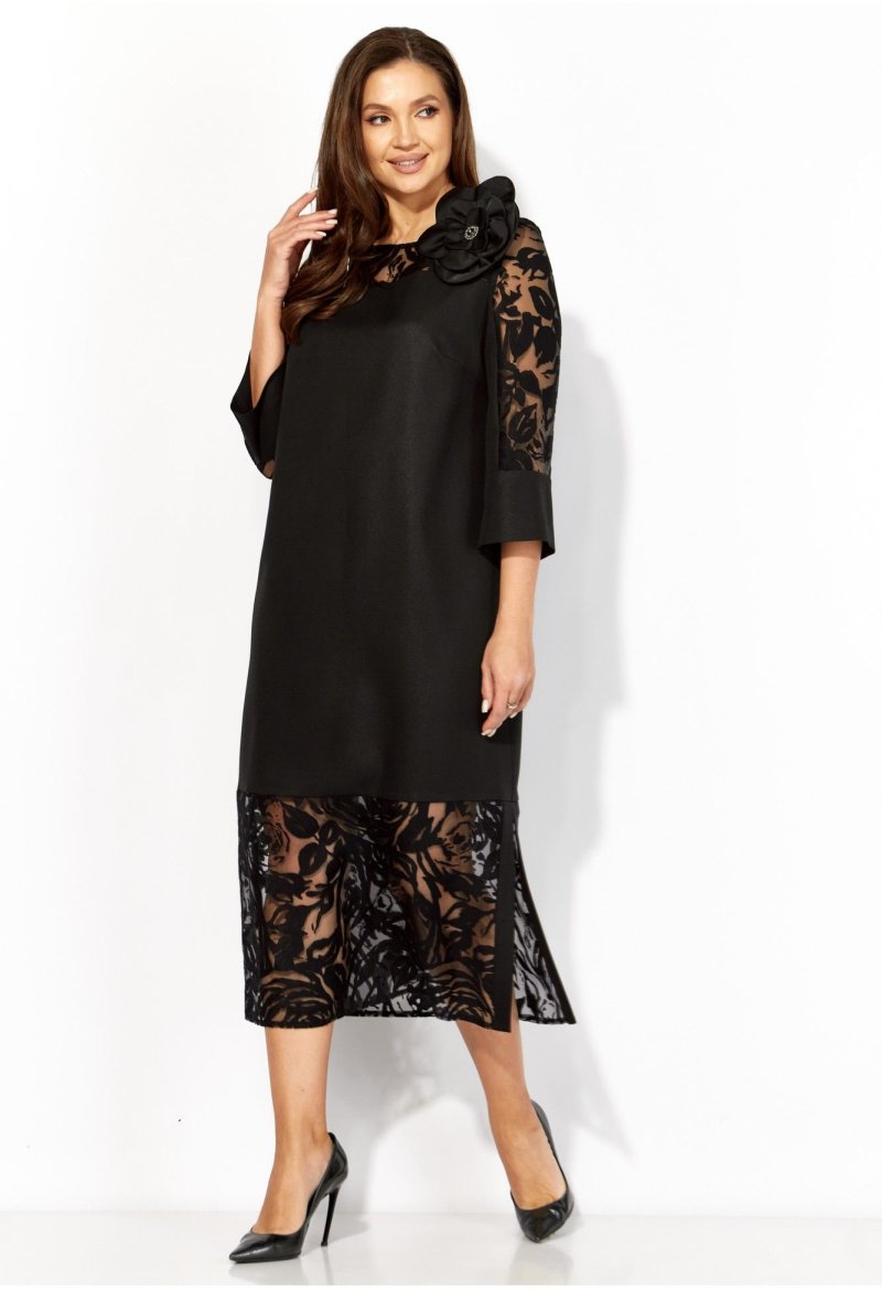 Платье женское, прямого силуэта, с втачным рукавом, длинной 3/4. Платье изготовлено из текстильной ткани с напылением и органзы с рисунком. Кокетки по переду и спинке, верхняя часть рукава и нижняя часть платья из огранзы. По боку разрез с отделочными планками. По низу рукава широкая манжета. Вырез горловины круглой формы. Застежка сзади на навесную петлю и пуговицу. Декором служит большой, съемный цветок из атласной ткани.