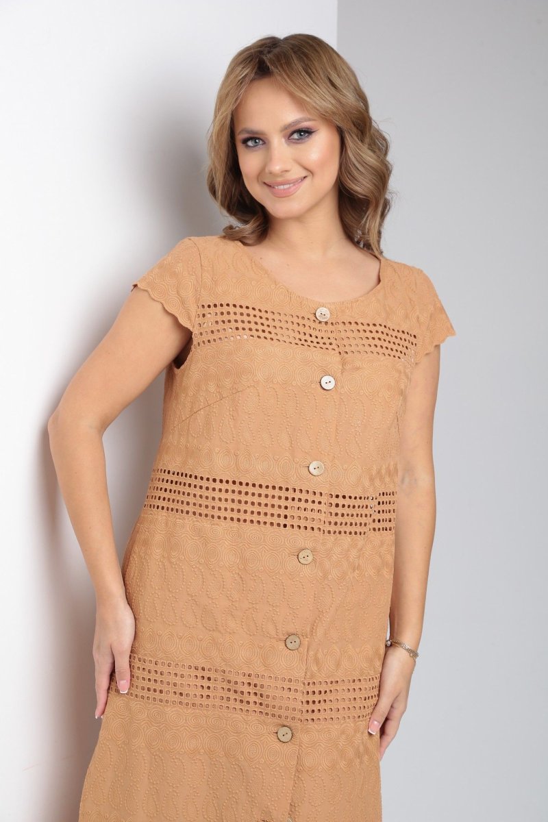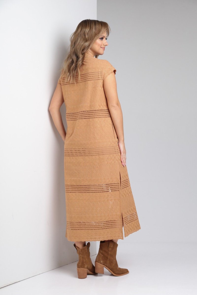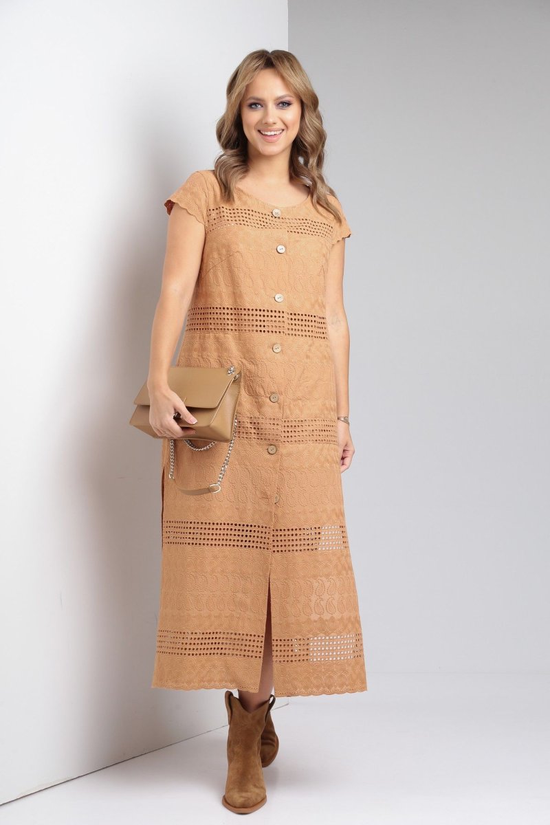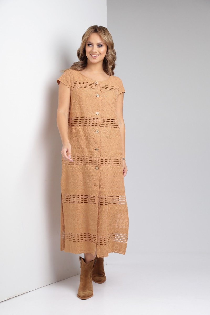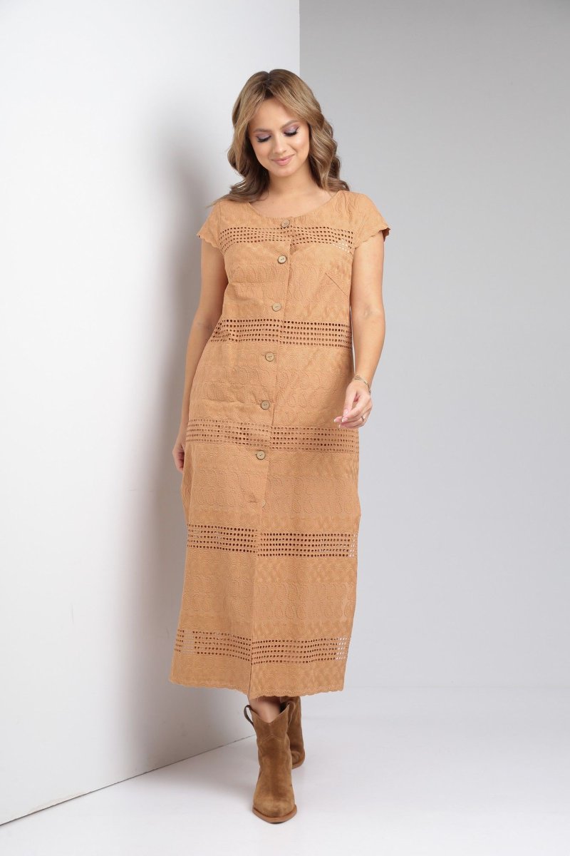 Платье из хлопка 100% подарит легкость и комфорт в жаркие летние дни. Ткань шитье в сочетании с прямым силуэтом идеально для торжеств и повседневной носки. По переду центральная застежка на петли-пуговицы, нагрудные вытачки из проймы. Спинка цельная, в боковых швах функциональные карманы и разрезы. Рукав - крылышко.