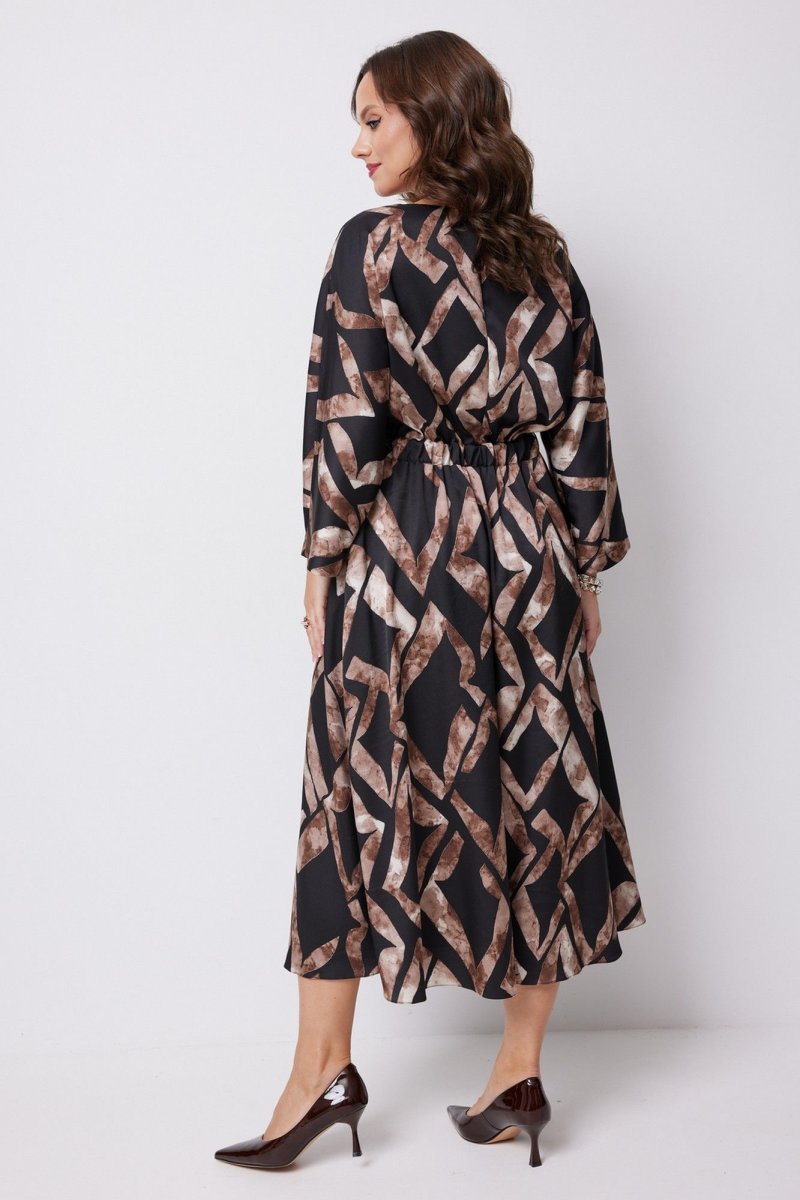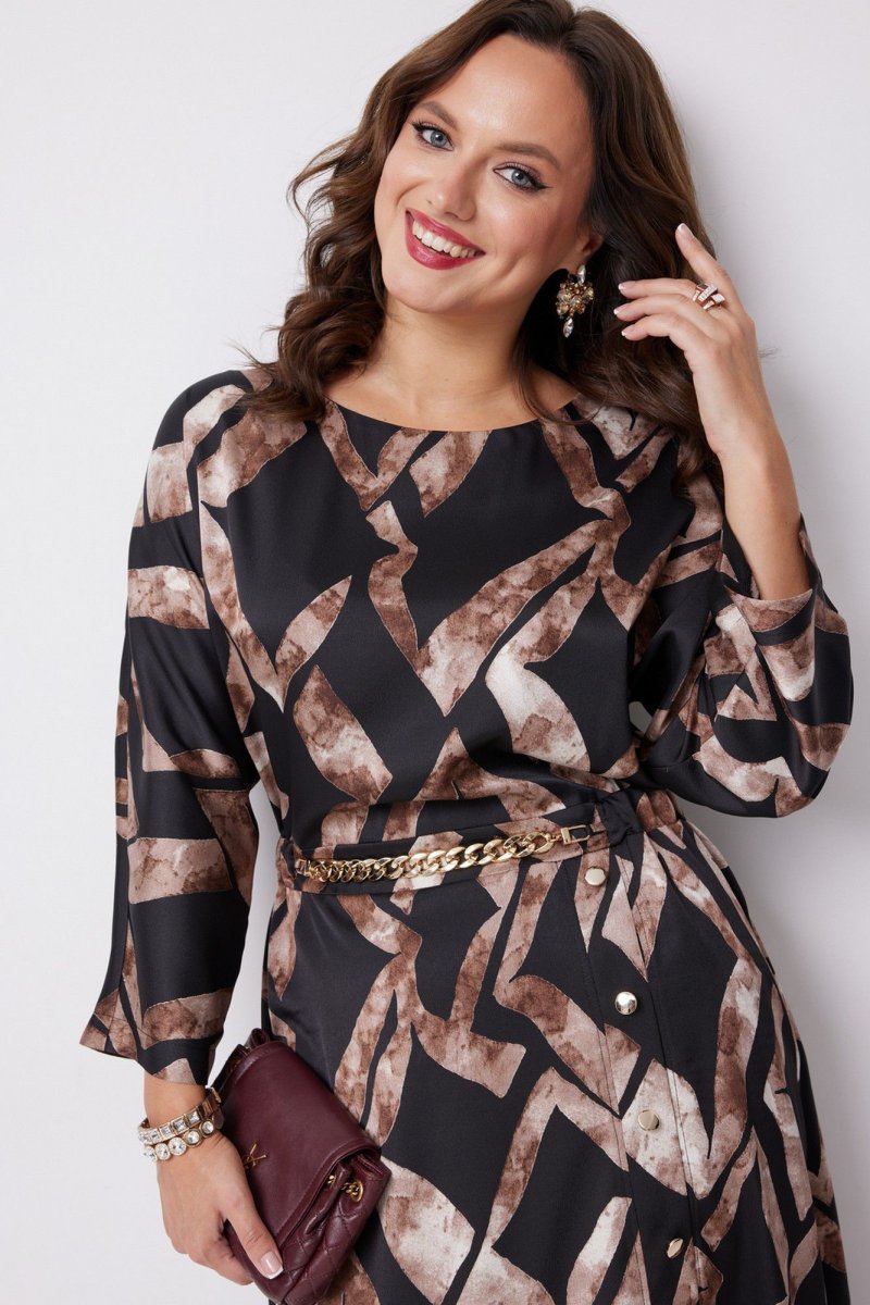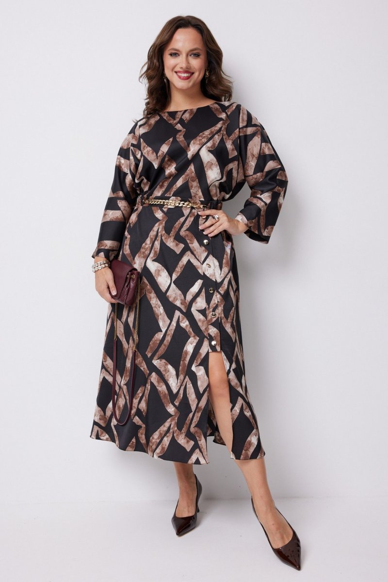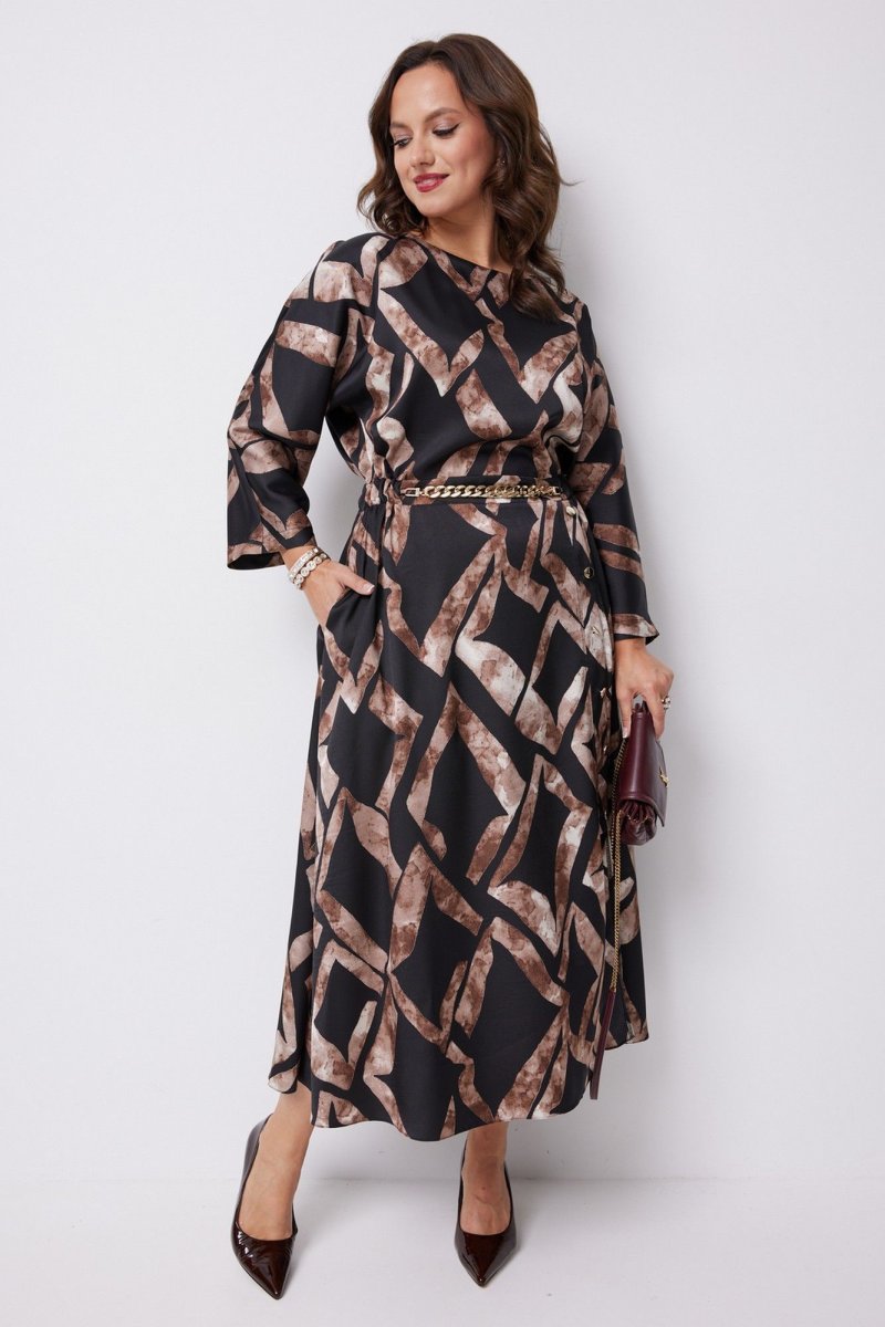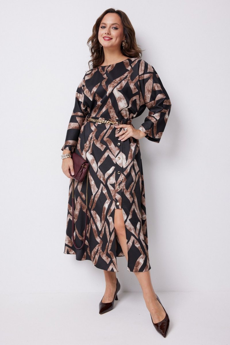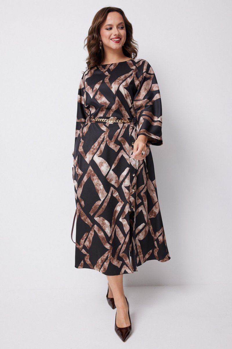 Стильное платье А-силуэта, выполненное из вискозы с оригинальным принтом. Платье отрезное по линии талии. Верхняя часть переда платья с круглой горловиной, спинка - со средним швом и капелькой, застегивающейся на навесную петлю и пуговицу. Рукав цельнокроенный, длиной 7/8. Нижняя часть платья покроя полусолнце. На одной из сторон юбки переда обработана отделочная планка с декоративными пуговицами, внизу - разрез. В боковых швах в области бедер обработаны карманы. В центральной части переда в области талии - притачной пояс со съемной декоративной цепью, которая изящно подчеркивает линию талии. По боковым швам и спинке пояса вставлена широкая резинка.