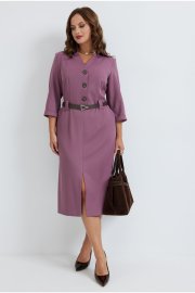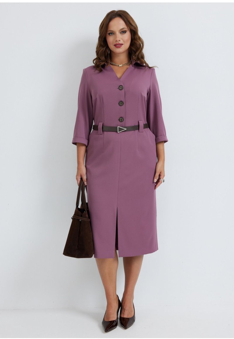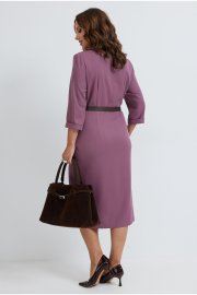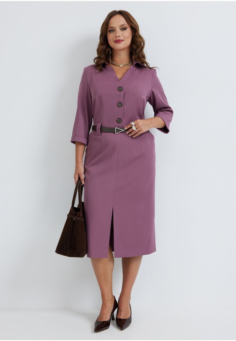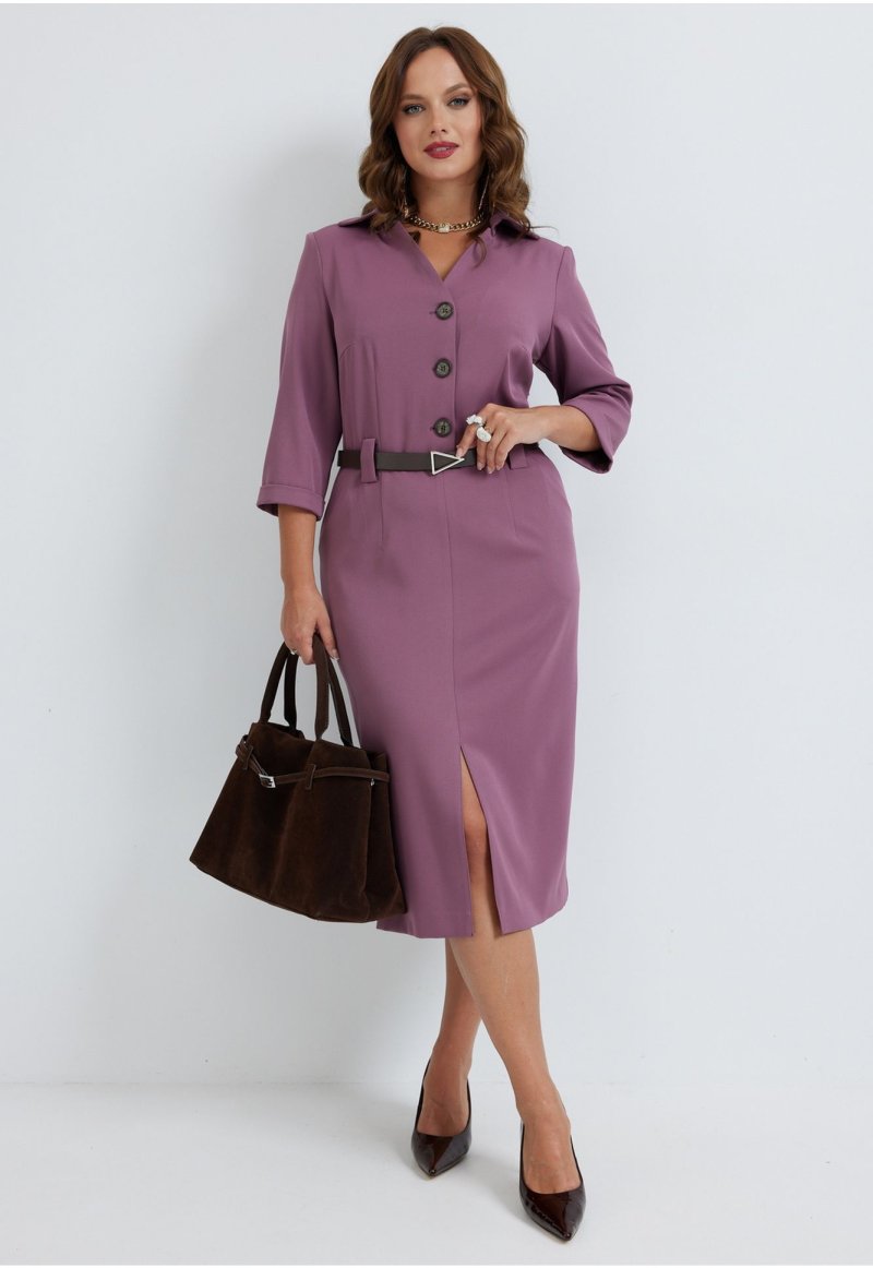 Платье полуприлегающего силуэта, выполненное из плательной поливискозы, длиной мидакси. Платье отрезное по линии талии, с центральной застёжкой на петли и пуговицы. Верхняя часть переда платья с фигурной V-образной горловиной, оформленной воротником рубашечного типа. Верхняя часть платья с нагрудными и талиевыми выточками. Нижняя часть переда платья с талиевыми вытачками и со средним швом, внизу которого обработан разрез. Спинка цельнокроеная с талиевыми вытачками. В боковом шве обработана потайная молния в области талии, в области бедер обработаны карманы. Рукав втачной, с цельнокроеной манжетой, длиной 3/4. В комплект к платью входит контрастный ремень с декоративной пряжкой.