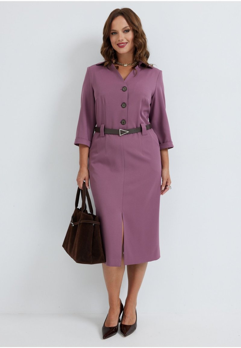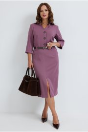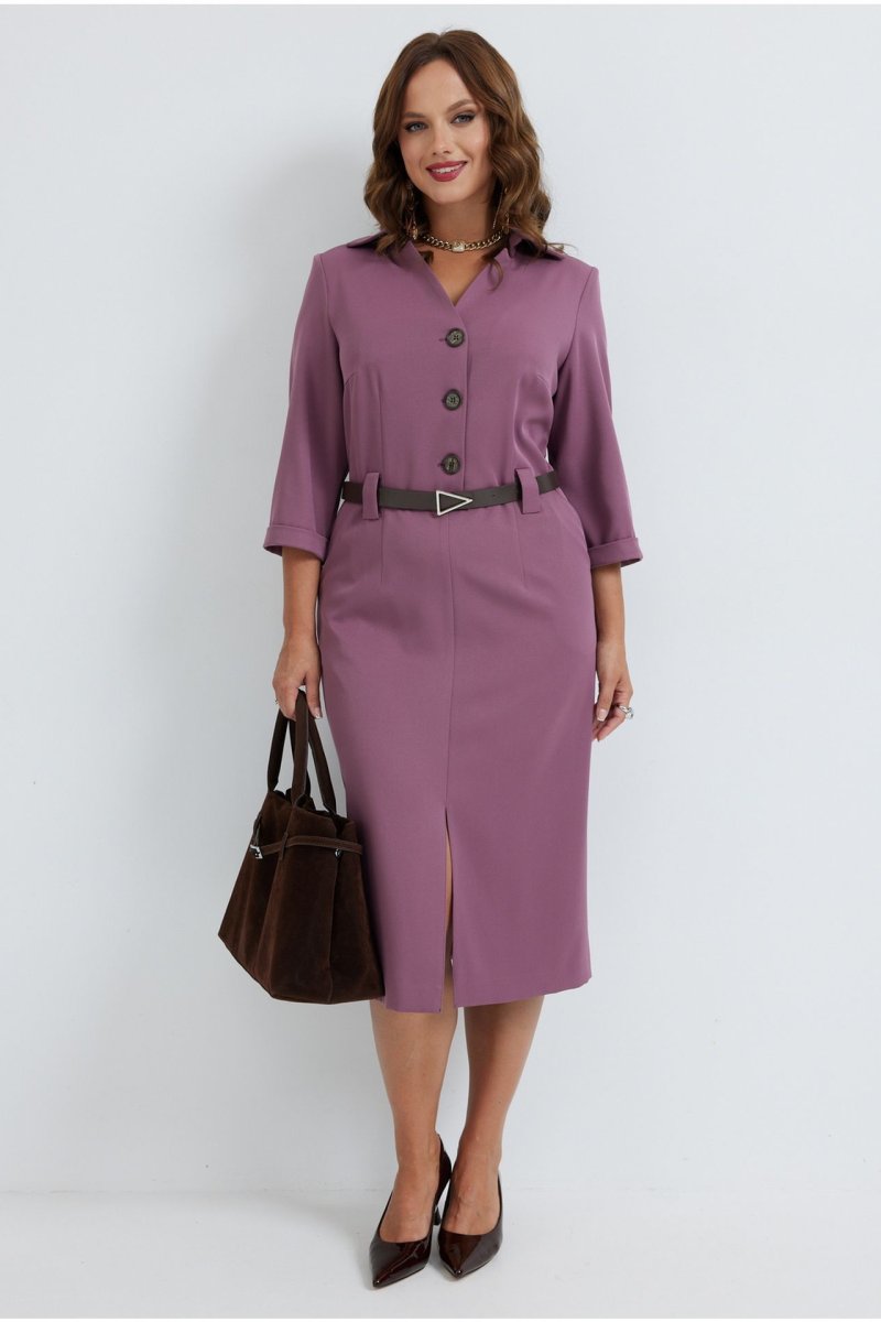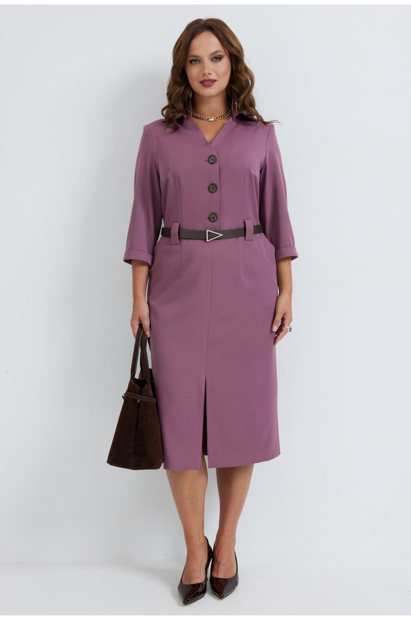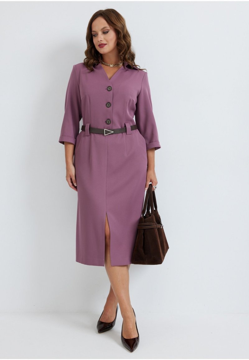 Платье полуприлегающего силуэта, выполненное из плательной поливискозы, длиной мидакси. Платье отрезное по линии талии, с центральной застёжкой на петли и пуговицы. Верхняя часть переда платья с фигурной V-образной горловиной, оформленной воротником рубашечного типа. Верхняя часть платья с нагрудными и талиевыми выточками. Нижняя часть переда платья с талиевыми вытачками и со средним швом, внизу которого обработан разрез. Спинка цельнокроеная с талиевыми вытачками. В боковом шве обработана потайная молния в области талии, в области бедер обработаны карманы. Рукав втачной, с цельнокроеной манжетой, длиной 3/4. В комплект к платью входит контрастный ремень с декоративной пряжкой.