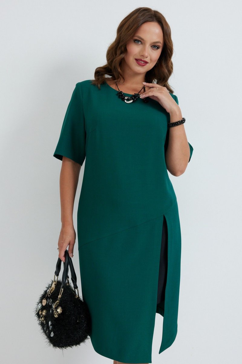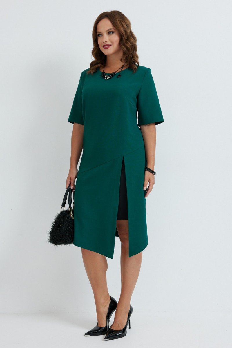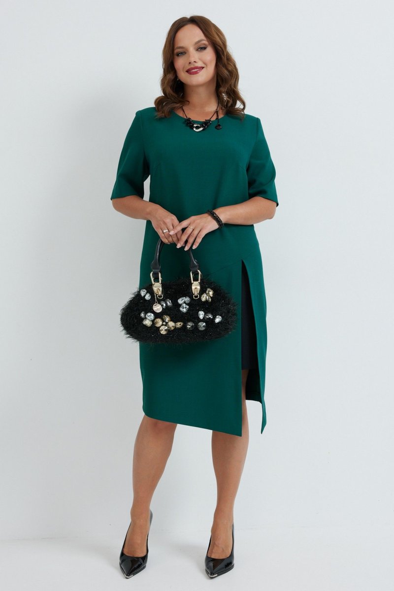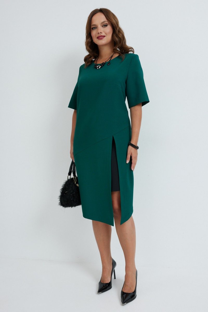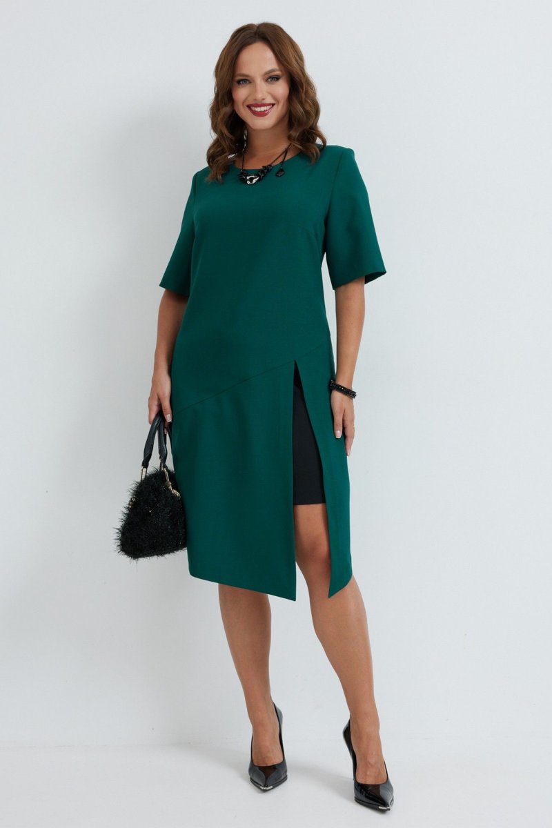 Эффектное платье прямого силуэта, выполненнное из поливискозы двух цветов. Перед платья с круглой горловиной и нагрудными вытачками. Перед платья в области бедра с косым подрезом. Нижняя часть переда состоит из верхней и нижней юбки. Верхняя юбка с косым низом и разрезом. Нижняя юбка из ткани контрастного цвета, имитирующая вторую юбку. Спинка с потайной молнией в среднем шве. Рукав втачной, длиной до линии локтя. В комплект к платью входит декоративная подвеска.