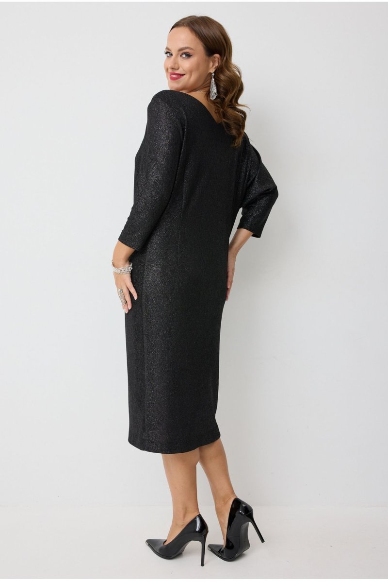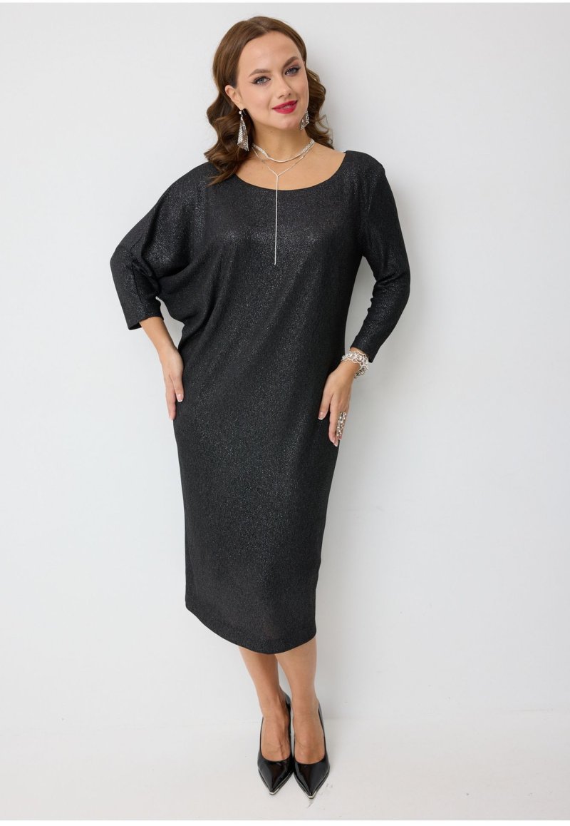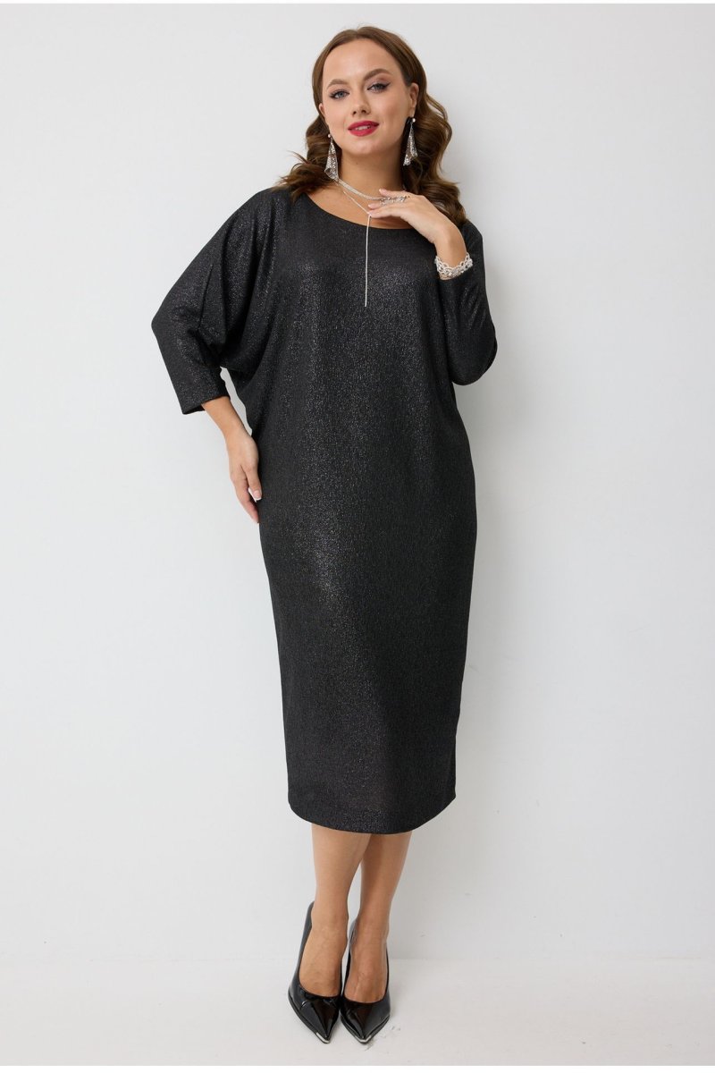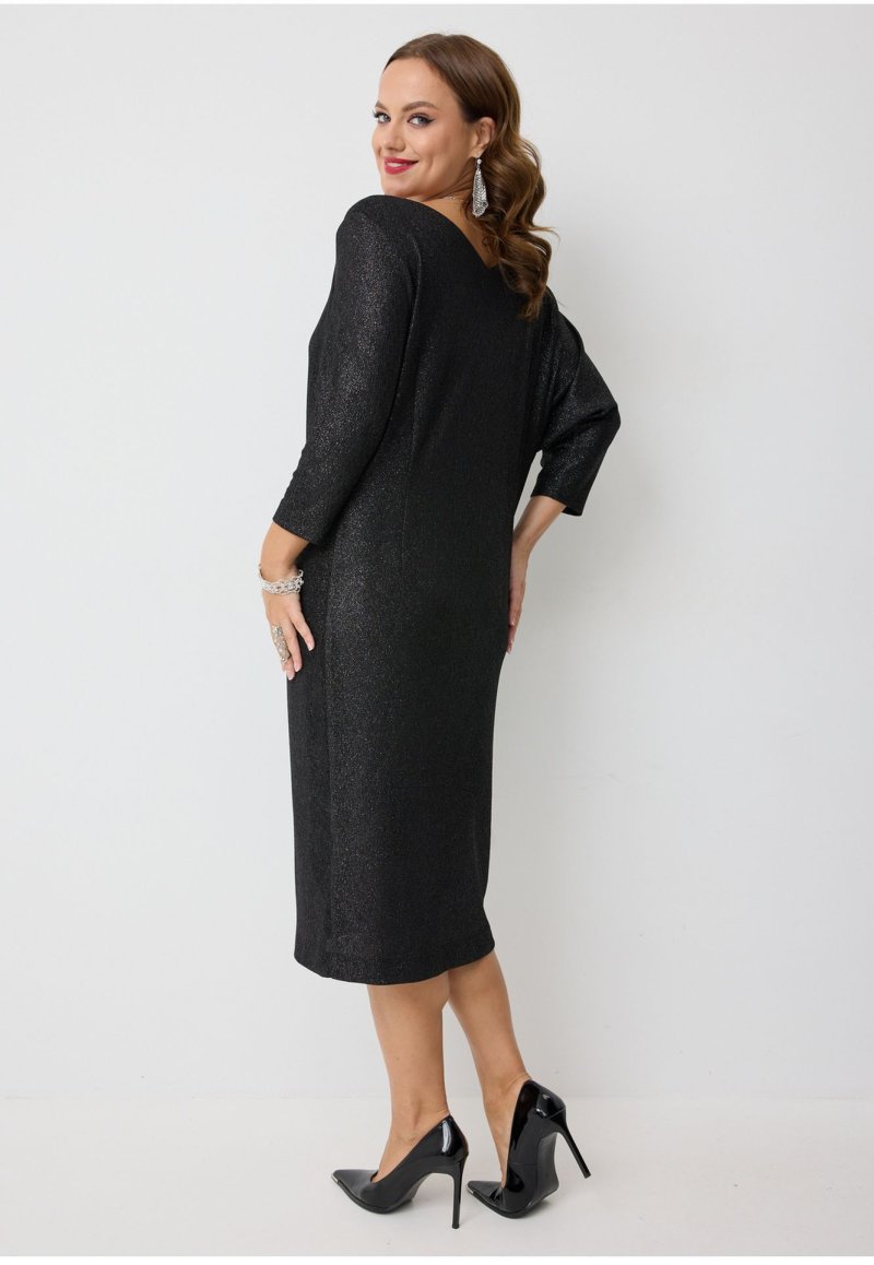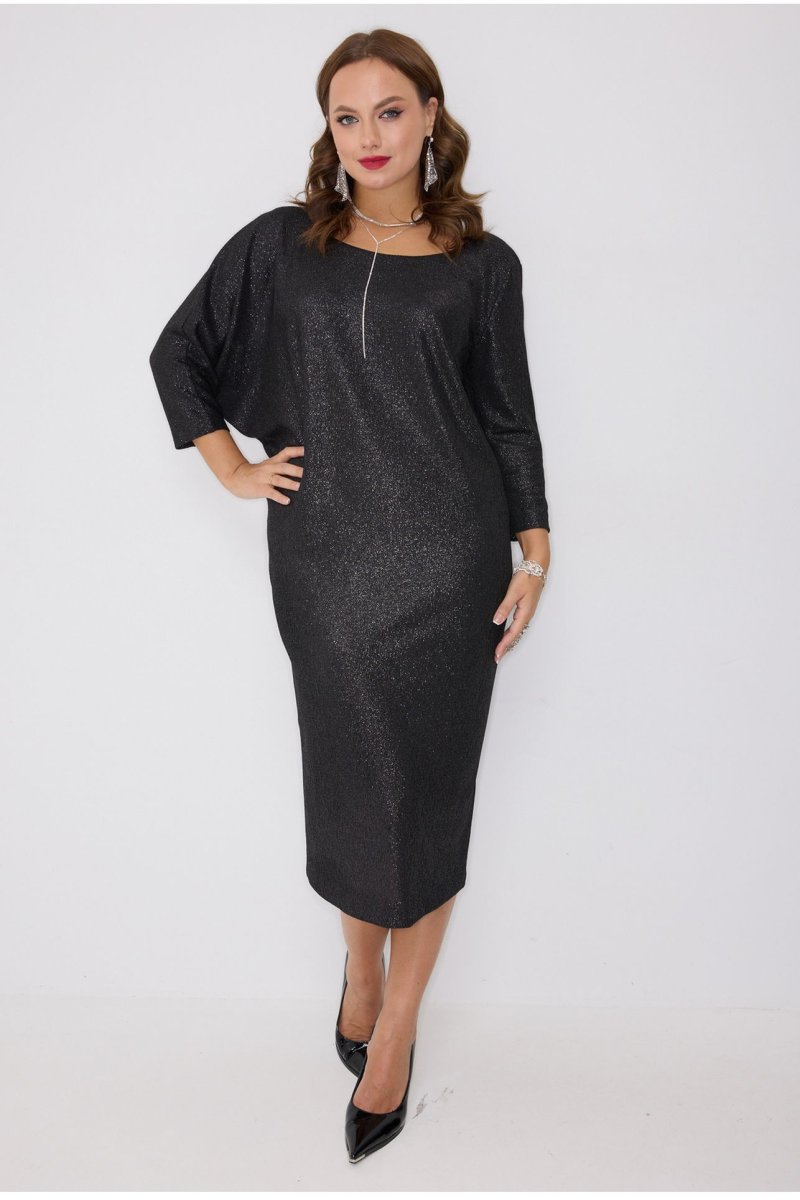 Платье полуприлегающего силуэта комбинированного покроя, выполненное из трикотажного полотна с люрексом. Горловина по переду оформлена в форме""лодочка"", по спинке - аккуратный V- образный вырез. Один из рукавов втачной, другой формы"" летучая мышь"", длиной 3/4.