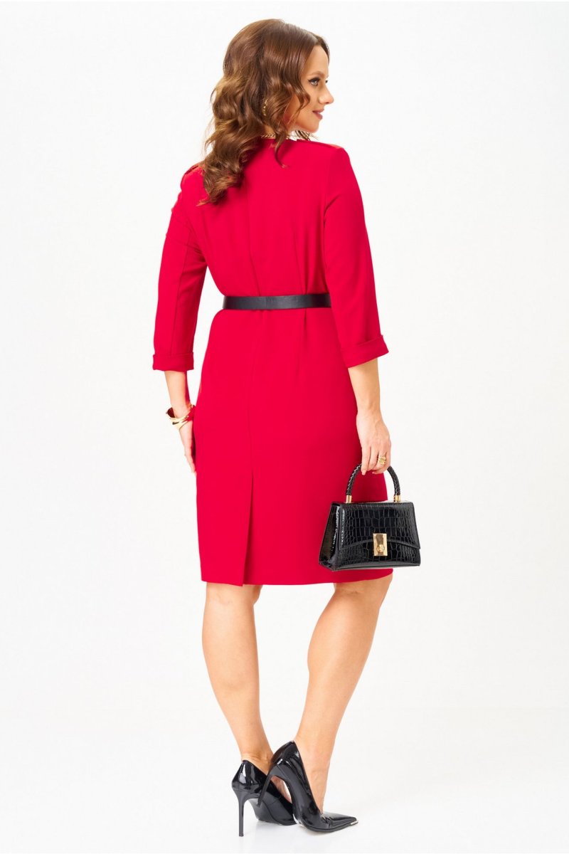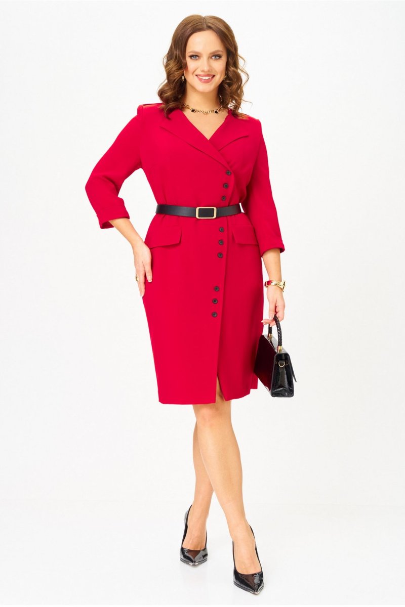 Элегантное платье полуприлегающего силуэта с асимметричной застежкой на петли и пуговицы. Перед платья с нагрудными вытачками и клапанами в области бёдер. Спинка с талиевыми вытачками и средним швом, внизу которого обработана шлица. Застежка асимметричная, двубортная, по низу платья расходится на разрез. В области плеч — погоны, закрепляющиеся на пуговицу. Рукава двухшовные втачные, длиной 3/4, с притачной манжетой. Платье с плечевыми накладками и со съёмным ремнем в цвет фурнитуры. Фурнитура и комплектующие (ремень) могут незначительно отличаться от представленных на фото.
